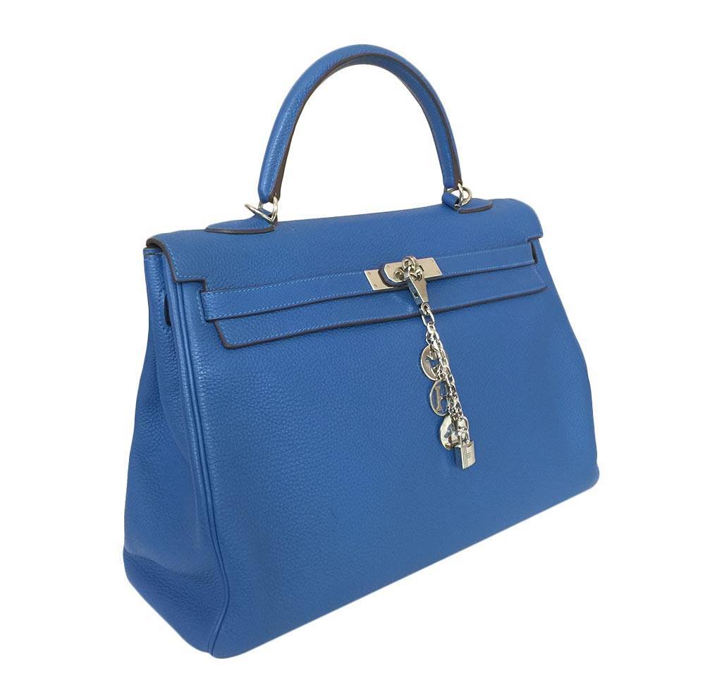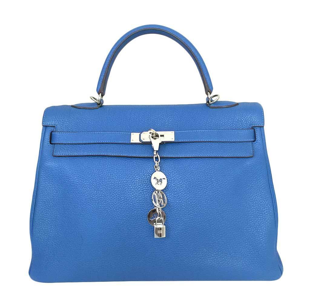 Get your hands on this gorgeous Hermès Kelly Retourne bag featured in size 35. The Mykonos color is absolutely fabulous and is very hard to find anywhere else. Made from Togo leather, this bag is almost completely scratch resistant. This bag is accentuated with palladium hardware, making it chic and sophisticated. Don't miss out on this beautiful Kelly bag by Hermès and you'll never want to leave home without it.