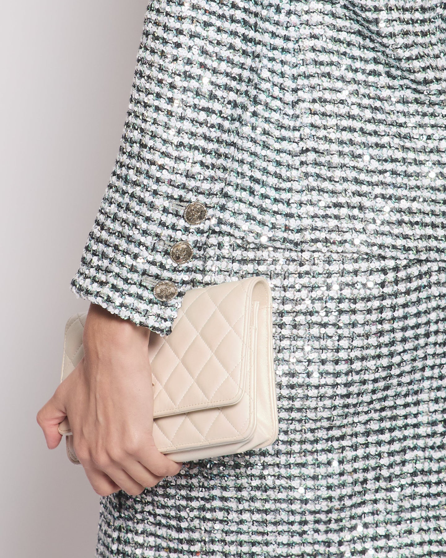 *HOT* Chanel 23P Black, White & Metallic Green Sequin Jacket and Skirt Set with CC Button Details Size FR 34/36 (UK 6/8) RRP Jacket £6,500, RRP Skirt £3,800