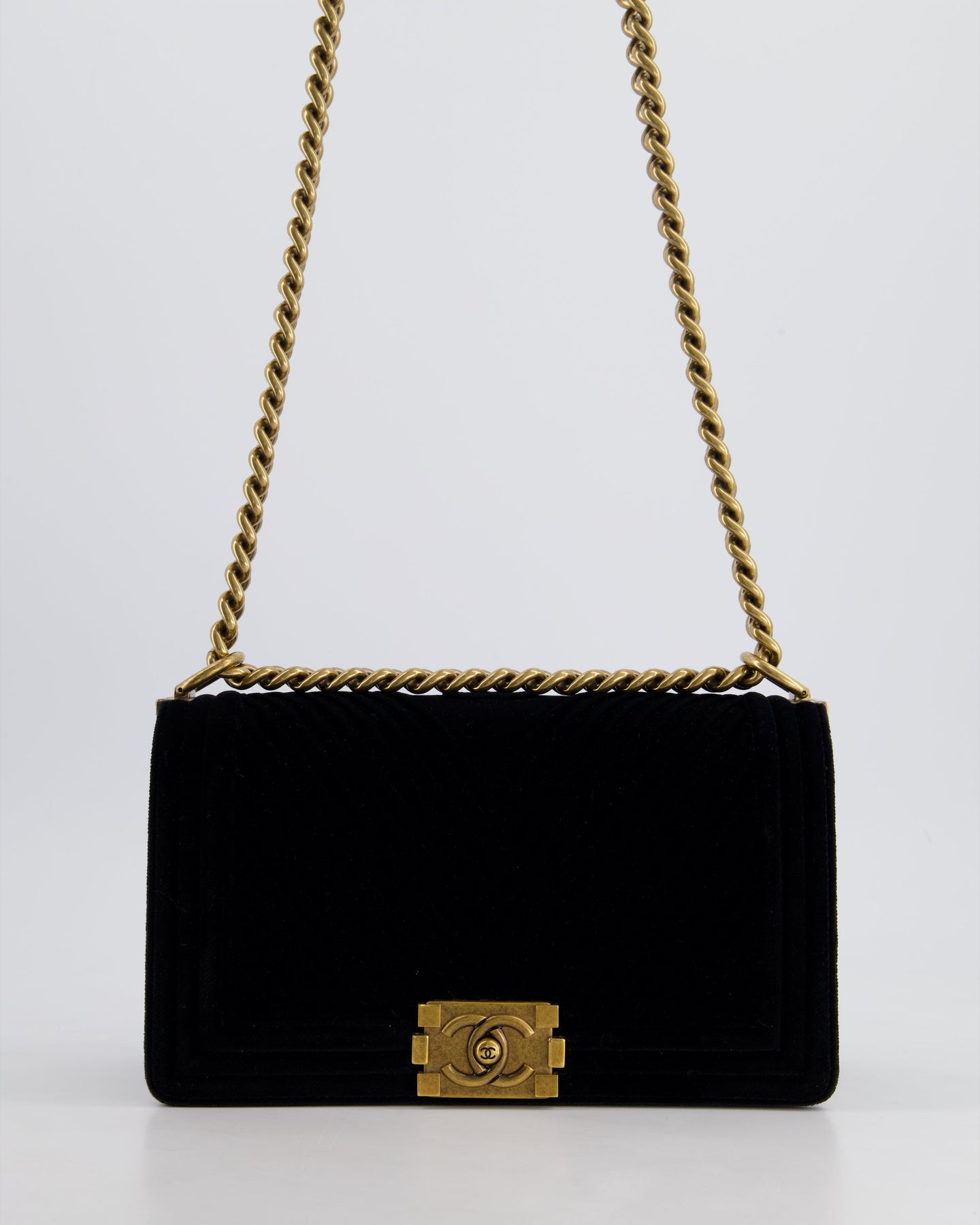*HOT* Chanel Black Velvet Chevron Medium Boy Bag with CC Logo and Antique Gold Hardware