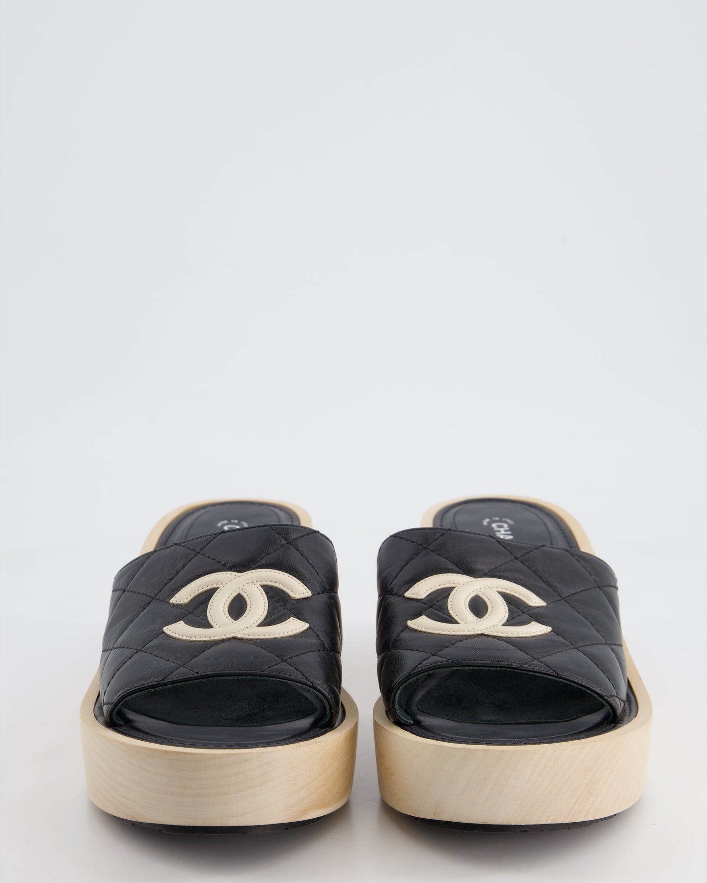 *HOT* Chanel Black Wooden Mules in Lambskin Leather with Cream CC Logo Detail Size EU 40
