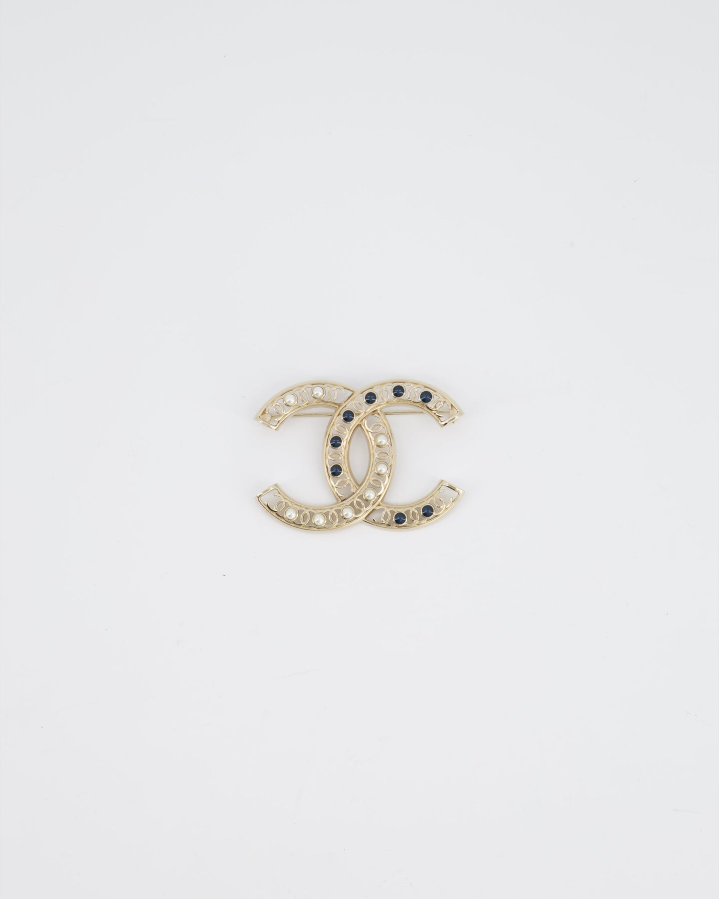 *HOT* Chanel Large CC Pearls and Blue Crystals Brooch with Champagne Gold Hardware