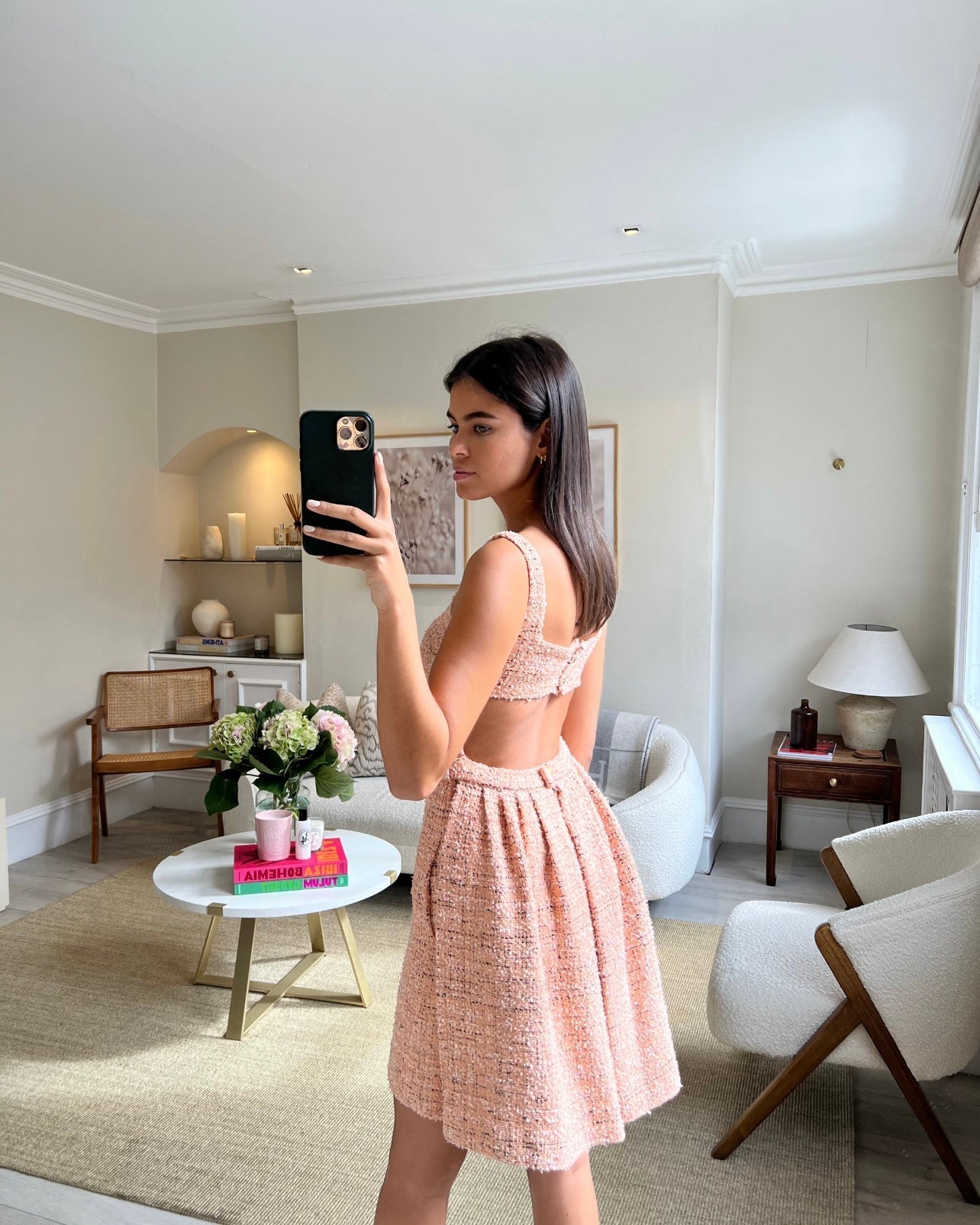 *HOT* Chanel Peach Tweed Belted Mini Dress CC Buttons FR 34 (UK 4-6)