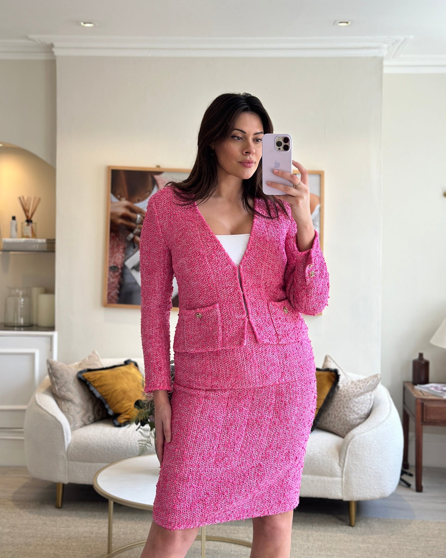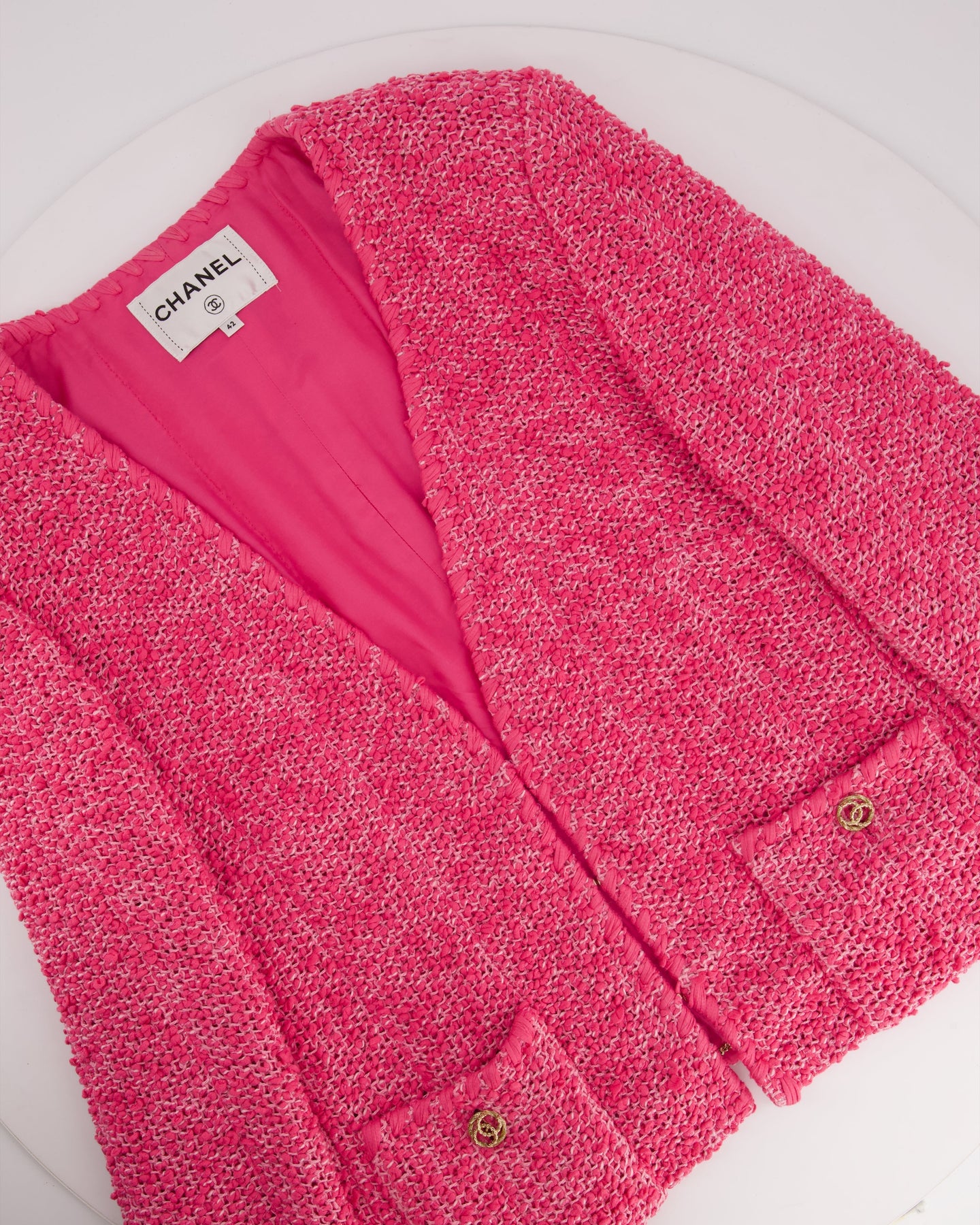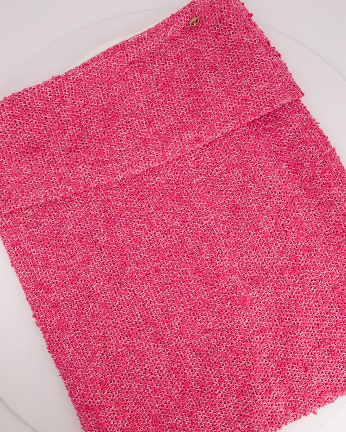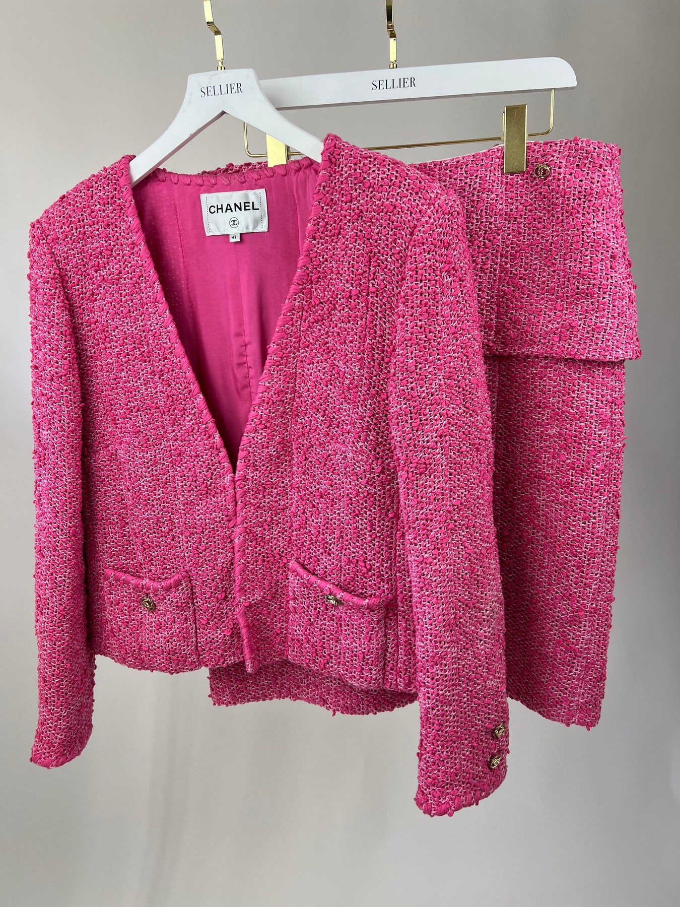 *HOT* Top Quality Chanel 21C Pink Tweed Jacket and Skirt Set with CC Logo Buttons Size FR 42 (UK 14)