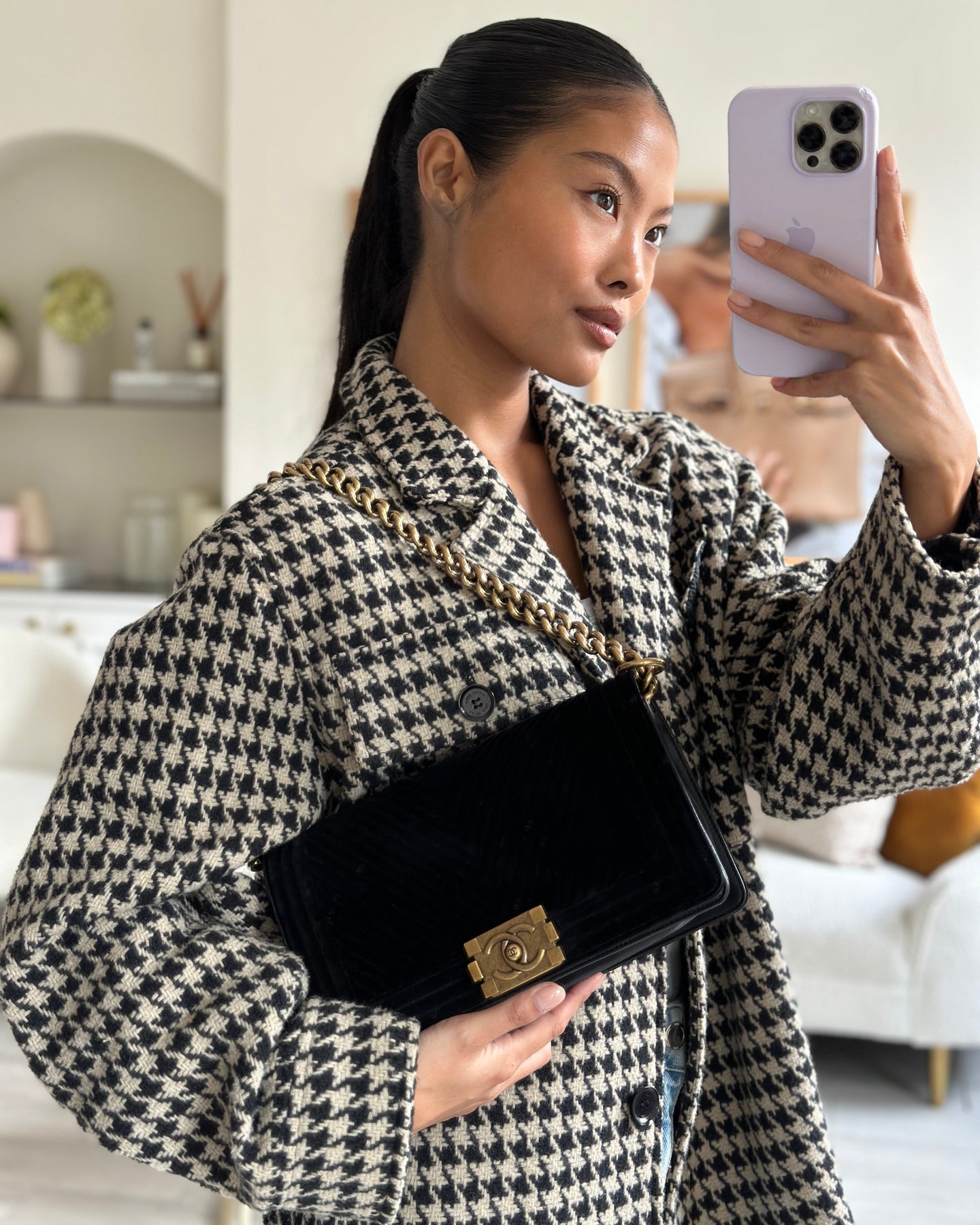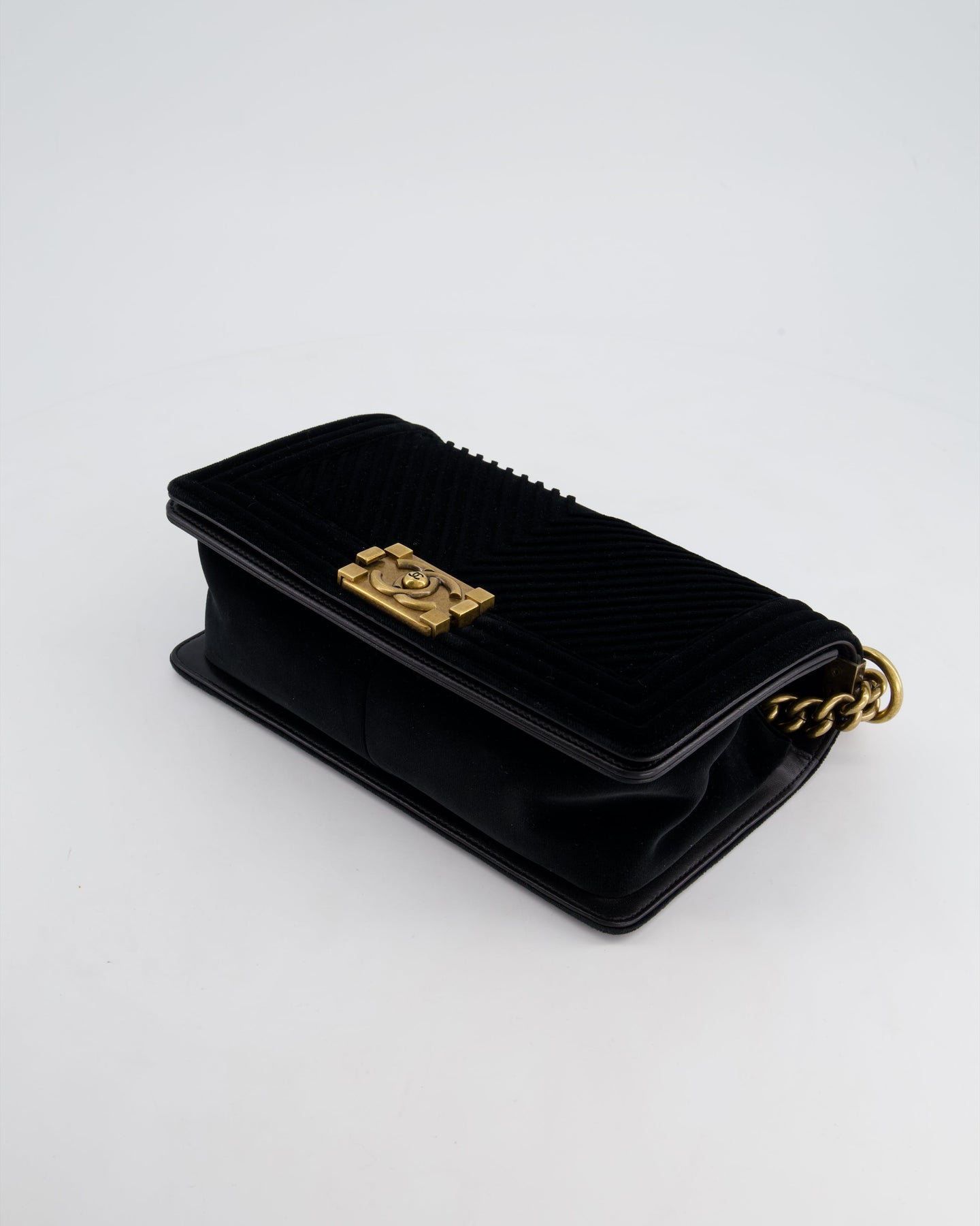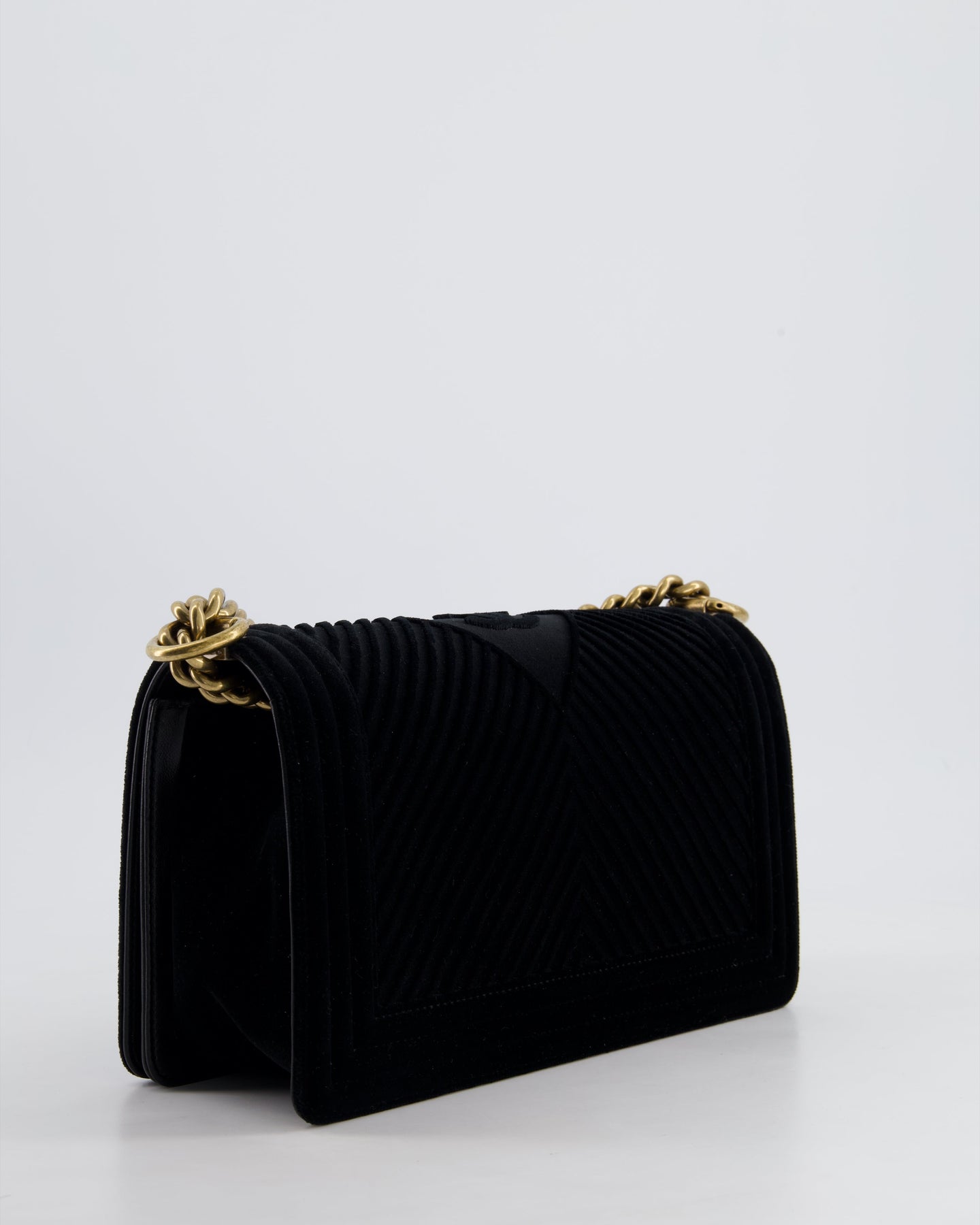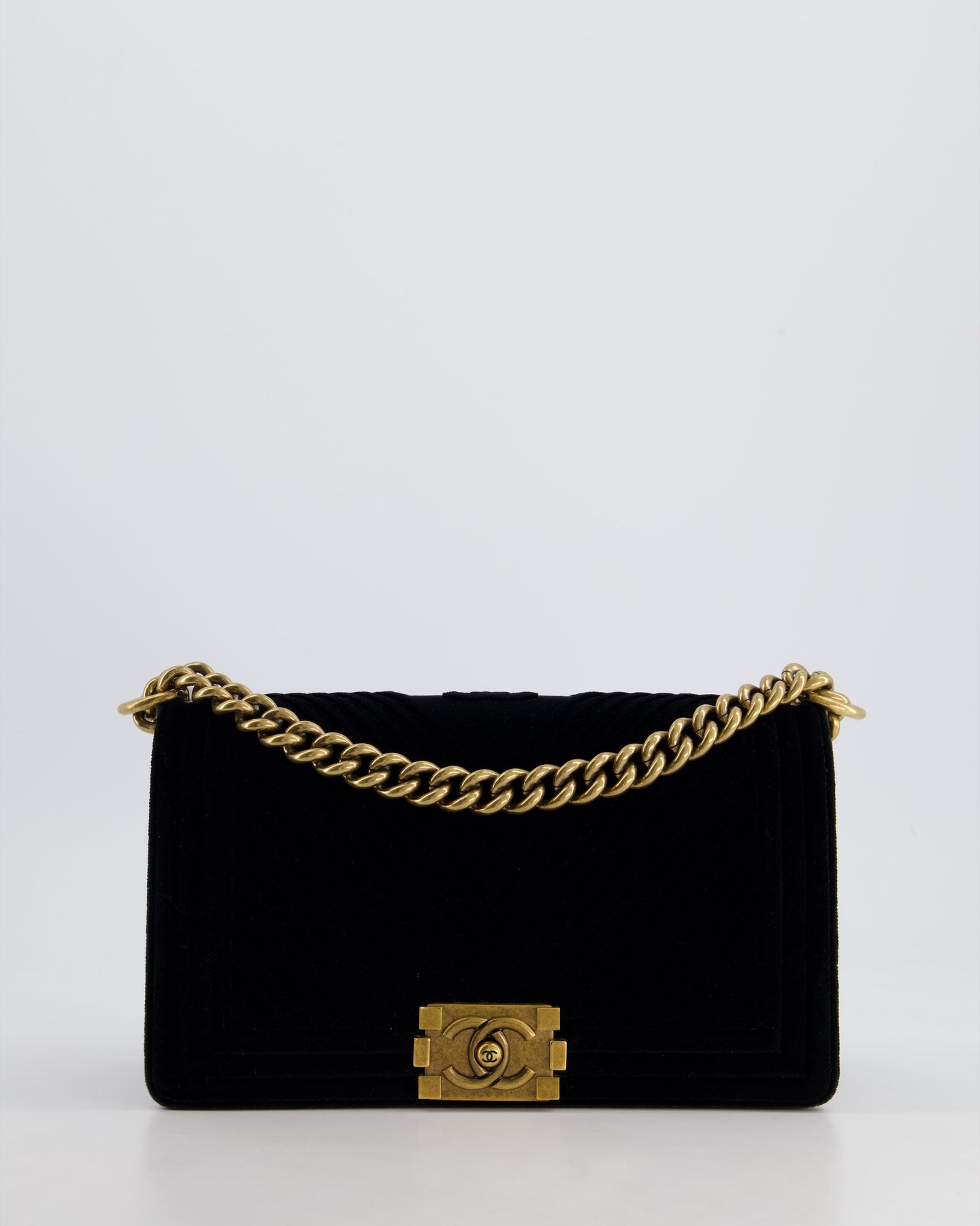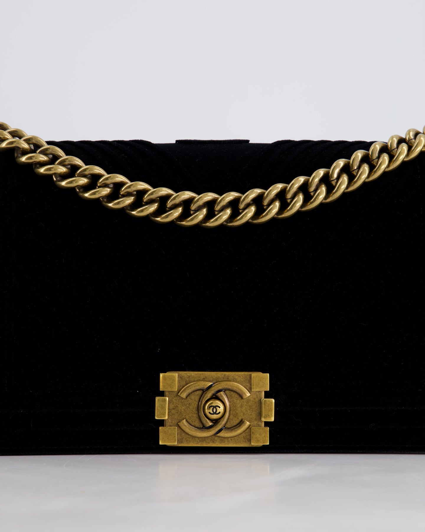 *HOT* Chanel Black Velvet Chevron Medium Boy Bag with CC Logo and Antique Gold Hardware