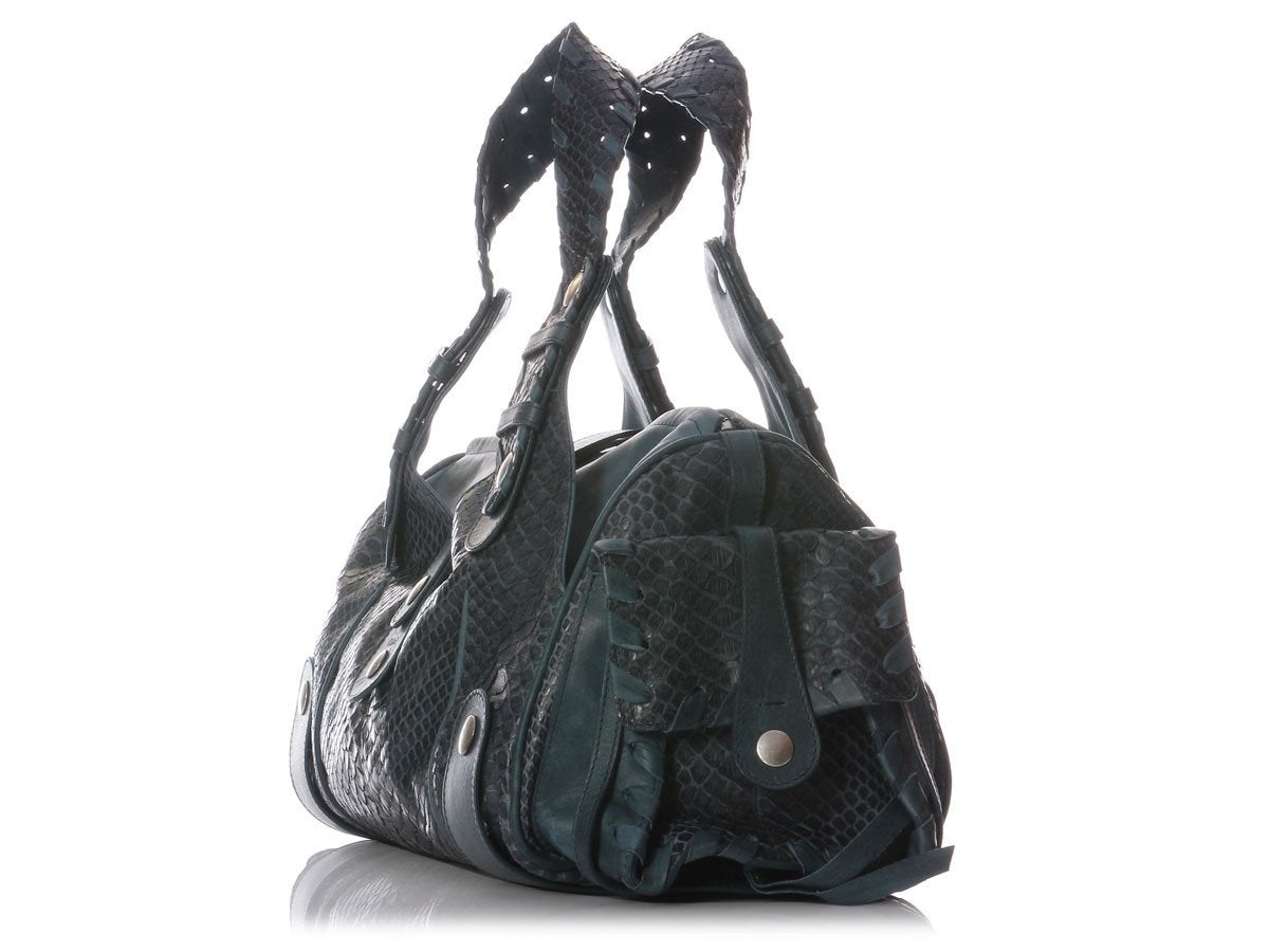 Chloé's Indigo Python Silverado has that cool strappy snappy look that Chloé is known for! Coming with a dustbag, there is wear on the blue leather at the bottom and under the flap. The narrow flap has a silver snap that opens for you to unzip the top to the beige fabric lining with a zipped pocket and a slide pocket inside. Between the straps with their drop of seven and a half inches, there is a big slide pocket on the front and the back, while the ends each have a magnetic pocket. The blue python has whip-stitched detailing on this large bag – another of Chloé's tricks!