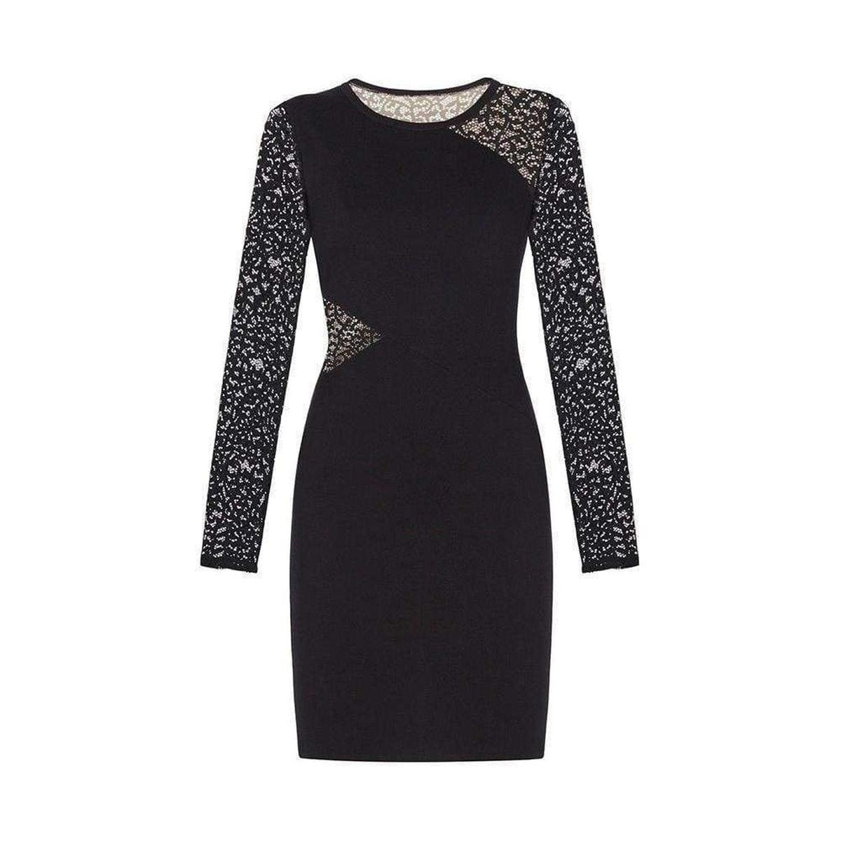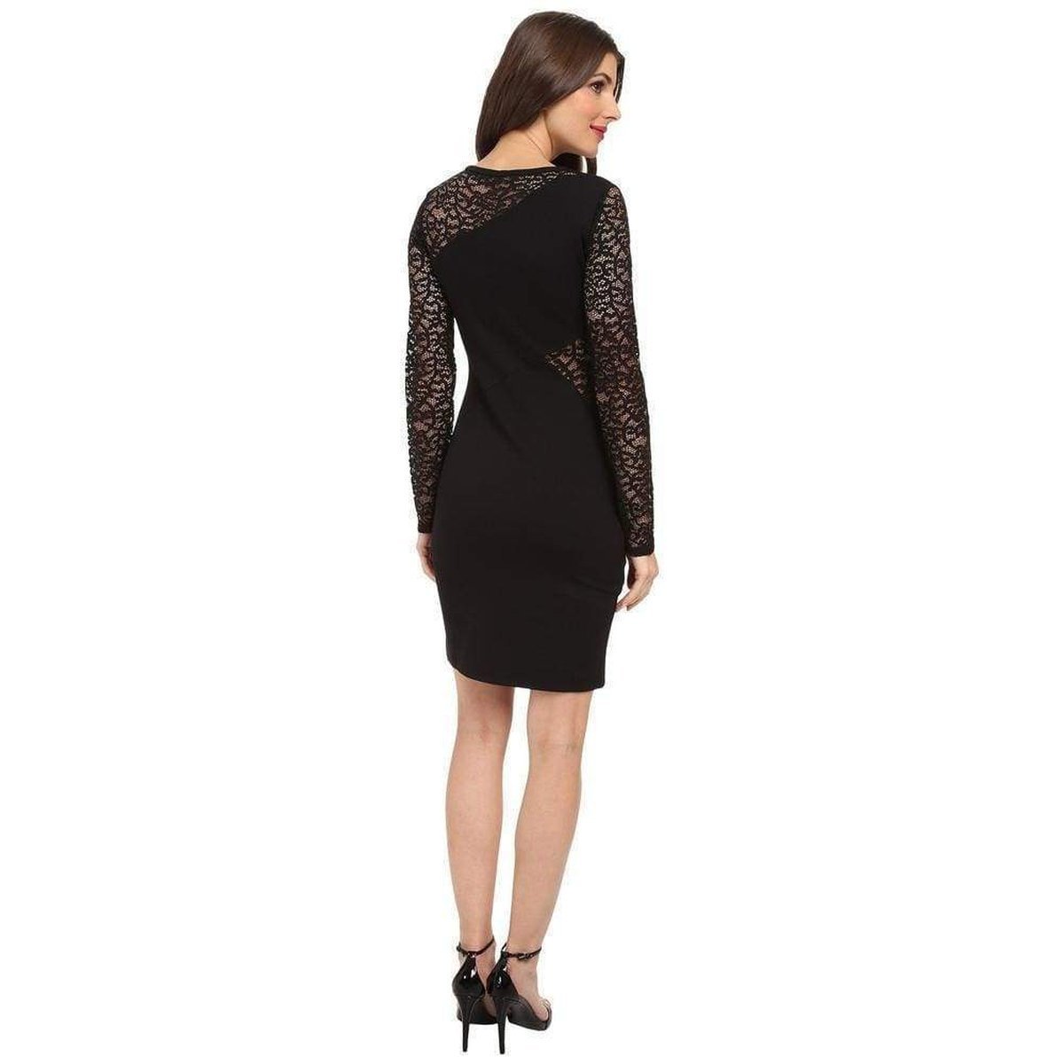 Fitted cocktail dress boasts lace sleeves and lace insets throughout.