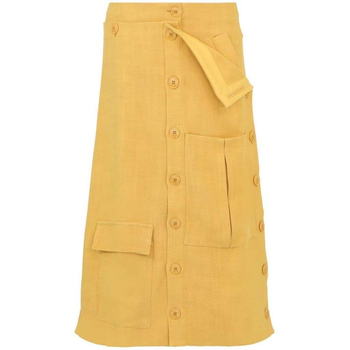 Featuring an a-line shape, an asymmetric style, a high rise, a front button fastening, patch pockets and a mid-length.