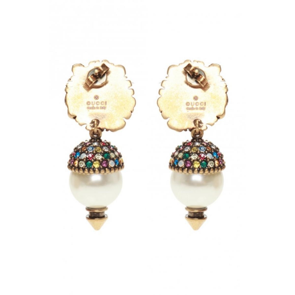 Crystal cut detailing in multicolor and faux-pearl accent at drop.