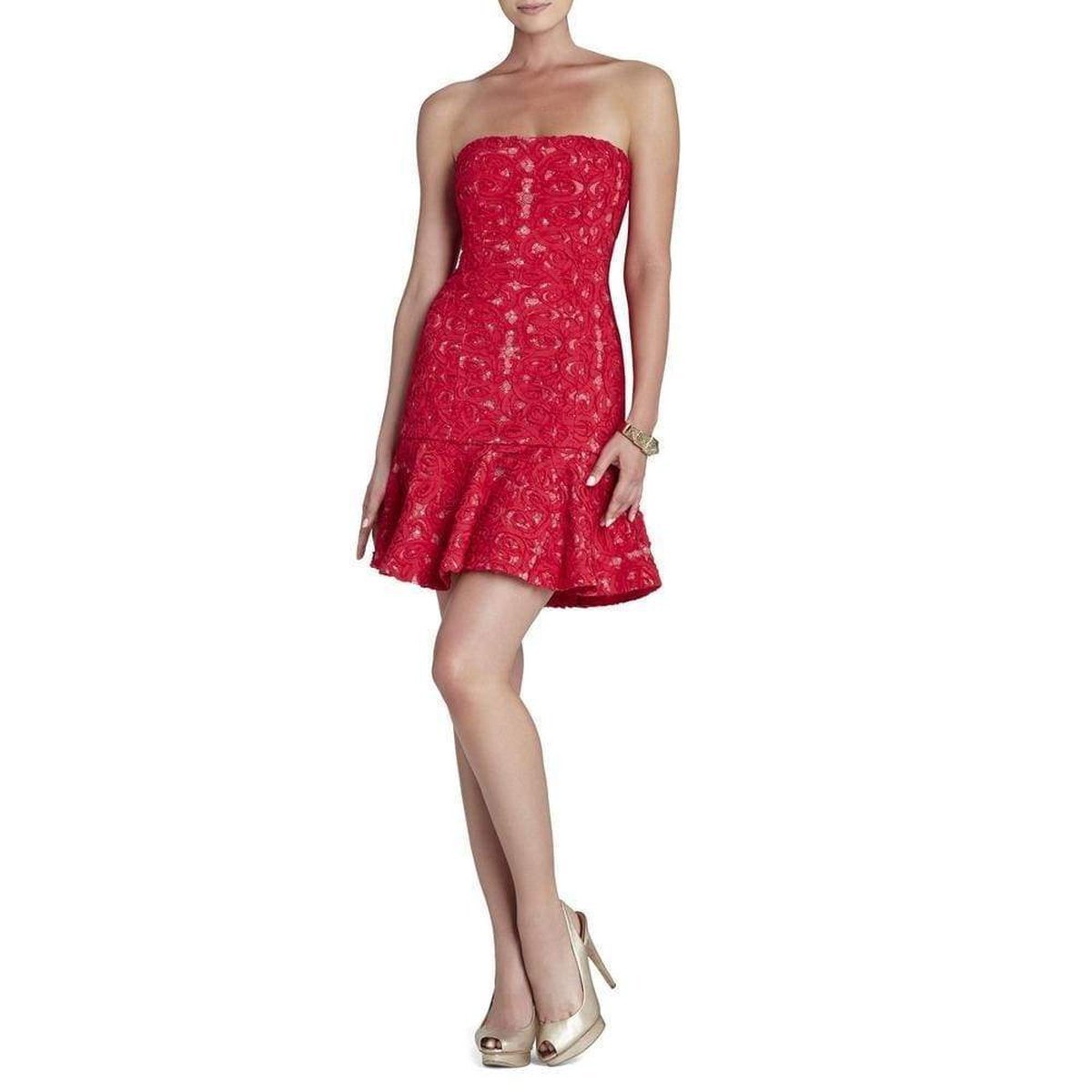 Construct a flawless figure with this intricately textured ruffle-hem dress.