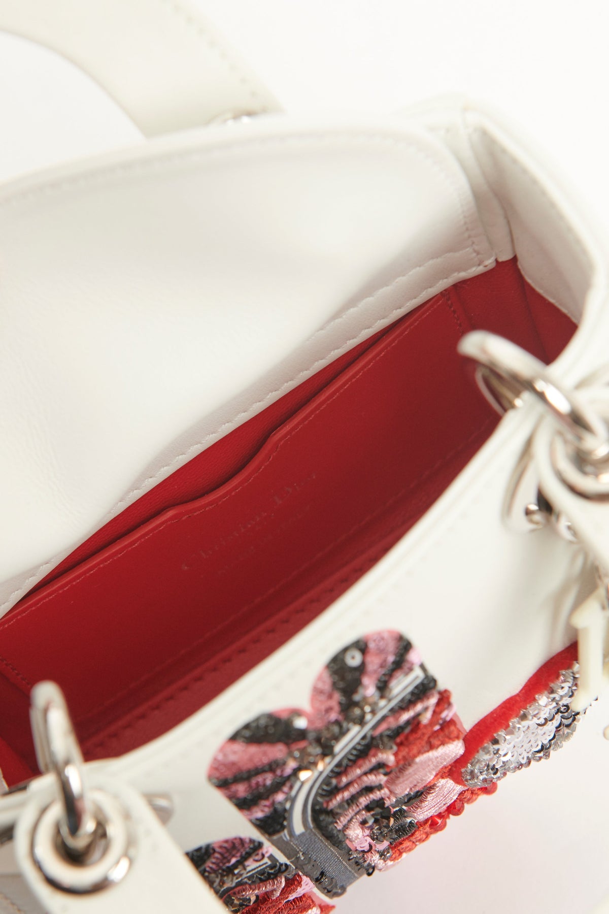 • Elevate your collection with the timeless elegance of this 2015 White Dior Lady Dior Bag, exquisitely adorned with delicate micro sequins for a touch of subtle glamour.