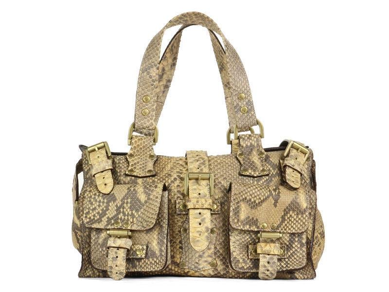With brass buckle details, Mulberry's Natural Python Roxanne is a great slouchy look! The fold over top has three little magnetic flaps that open to the brown suede and leather lining with a zipped pocket inside. On the front are two magnetic pockets, while the top has an eight inch drop to the handles. Coming with a dustbag and the missing rivet from the top of the bag, some scales are lifting on the handles with a couple of others on the bag itself. Natural python is just beautiful - naturally!