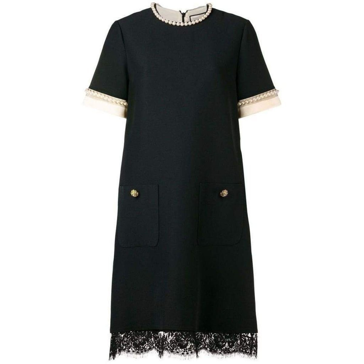 Crafted from silk-blend, this dress features a round neck, short sleeves, a shift silhouette, front pockets, a lace-trimmed hem and faux pearl embellishments