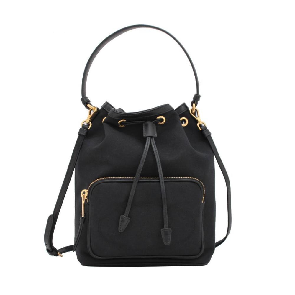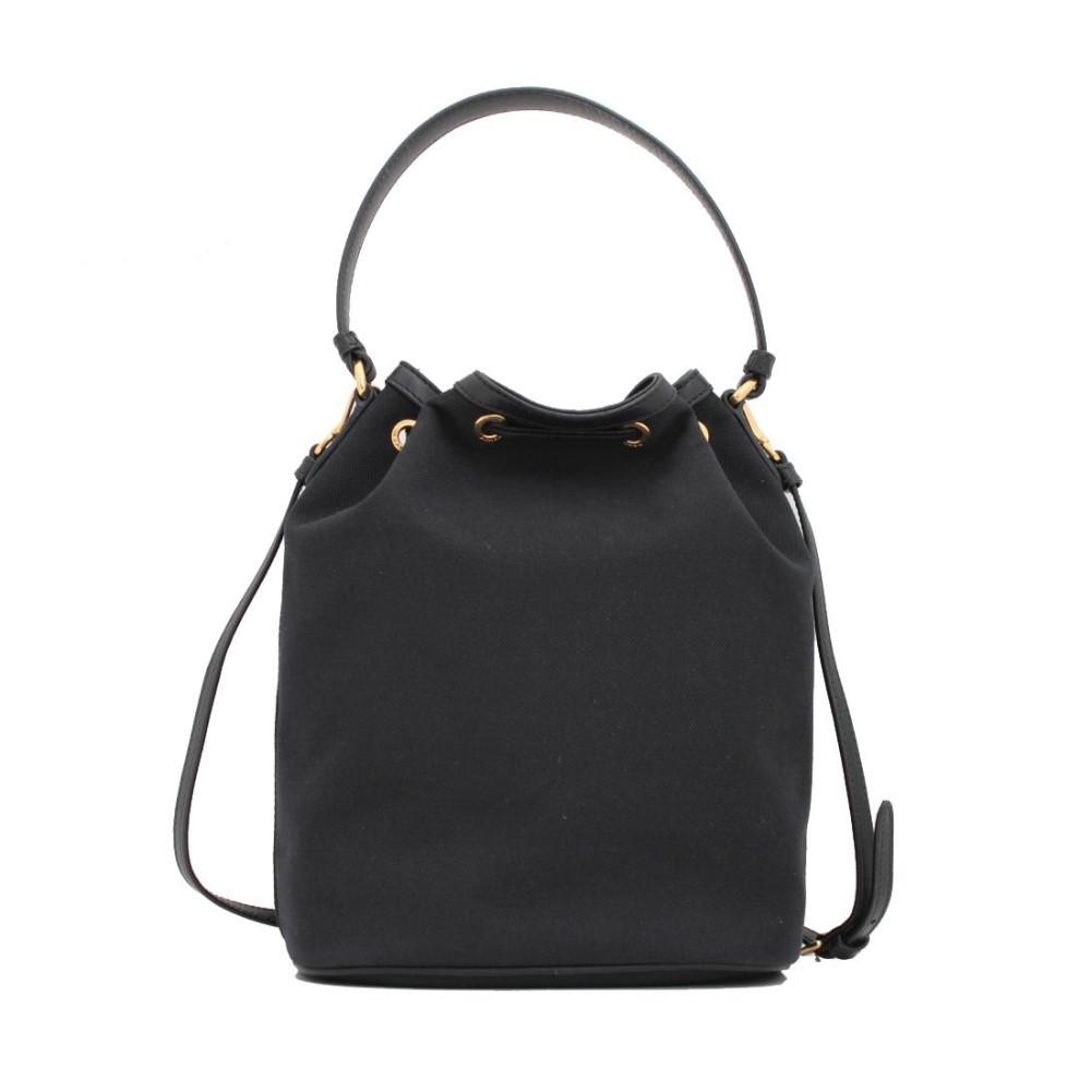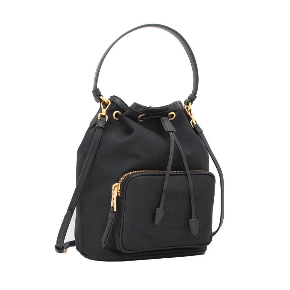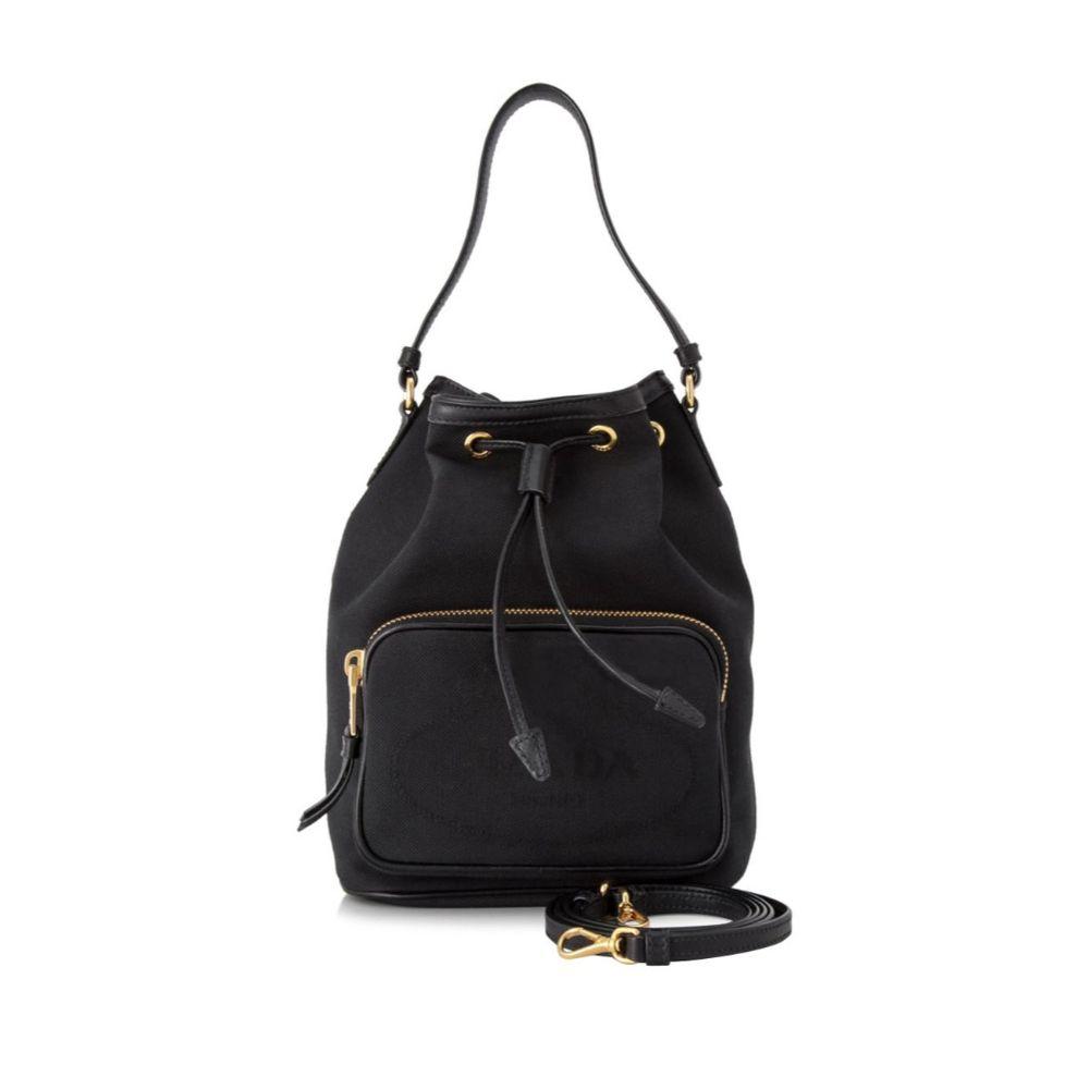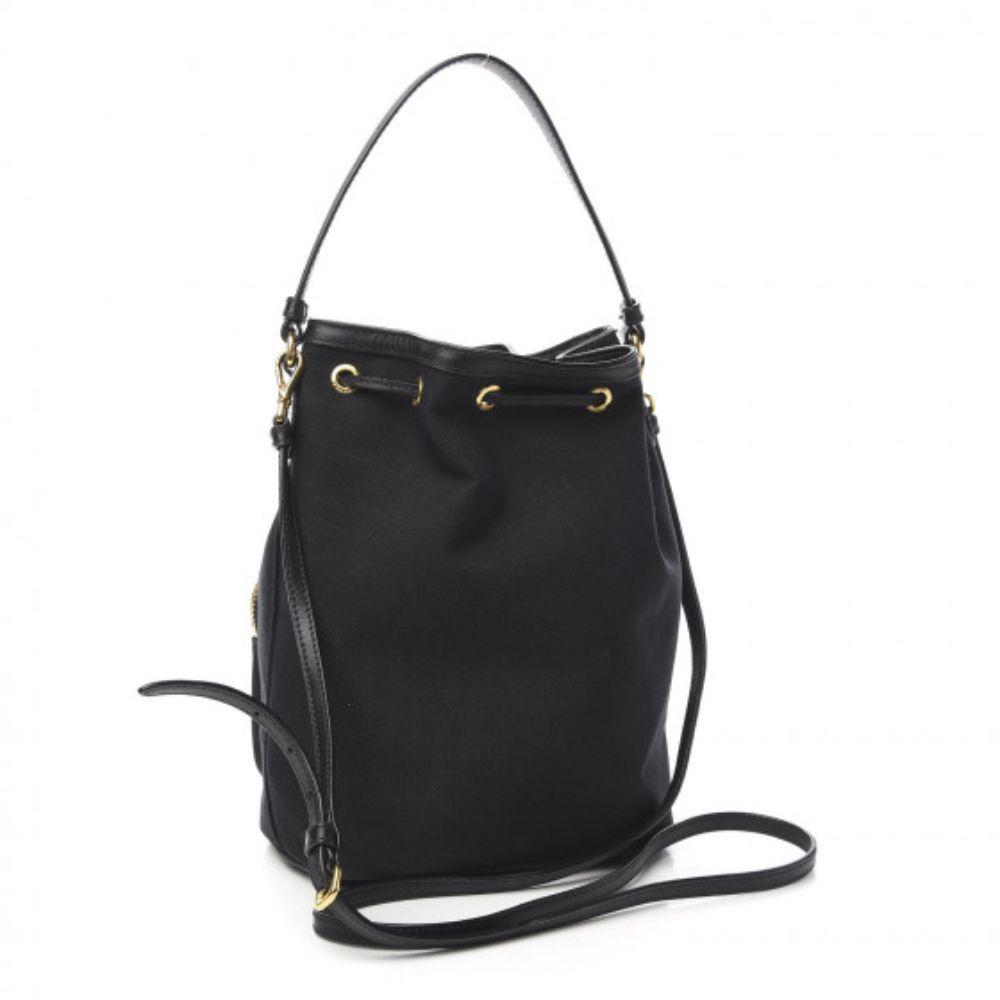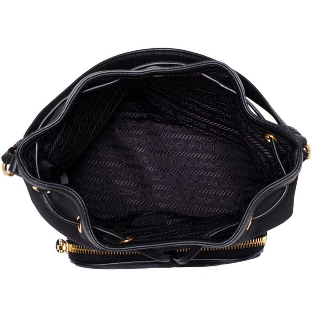 This bucket bag from Prada is constructed with a canvas material that is trimmed with a smooth black calfskin leather. Its drawstring fastening opens to a spacious interior that is lined with black jacquard nylon. The front of the bag features a zipper compartment that is adorned with the Prada jacquard logo. The detachable strap adds versatility to this bag, making it the perfect addition for everyday wear. Snag this beautiful designer bucket bag before it's gone!