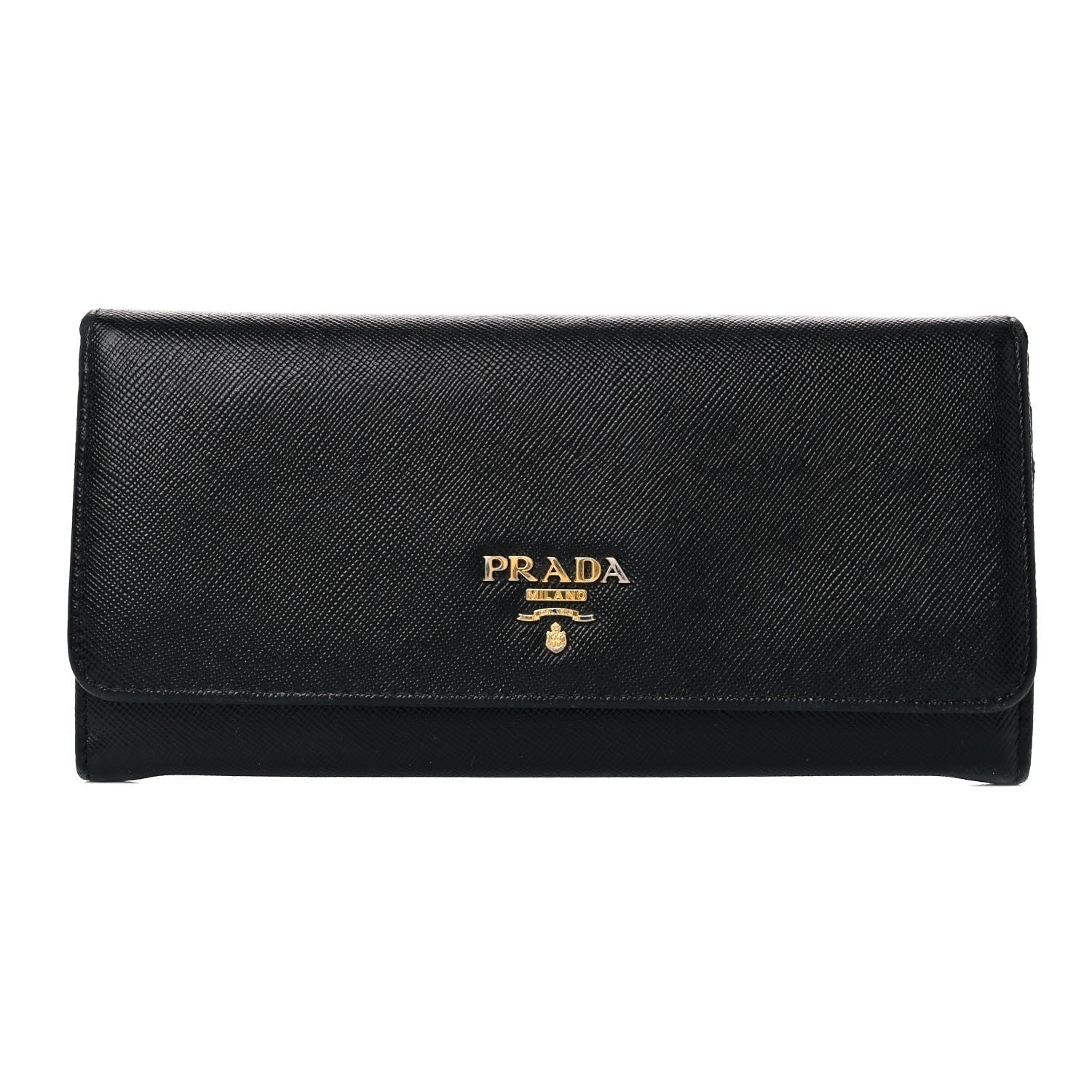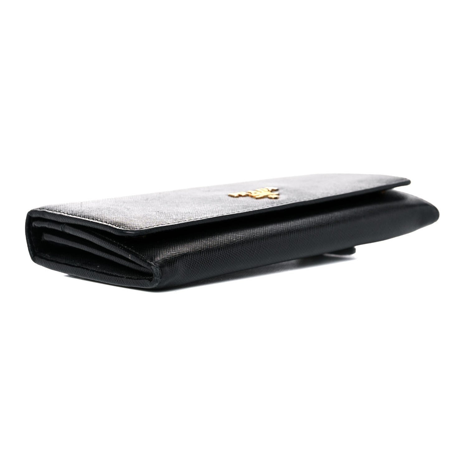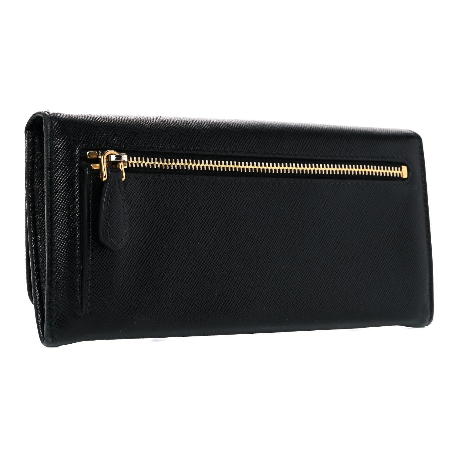 This Prada black saffiano leather wallet is beautiful. Its striking style complements any look. Use it to organize your bills, credit cards, and coins with its various storage pouches. This wallet features ten credit card slots, an ID holder, six bill compartments, and a zipper pouch on the back.