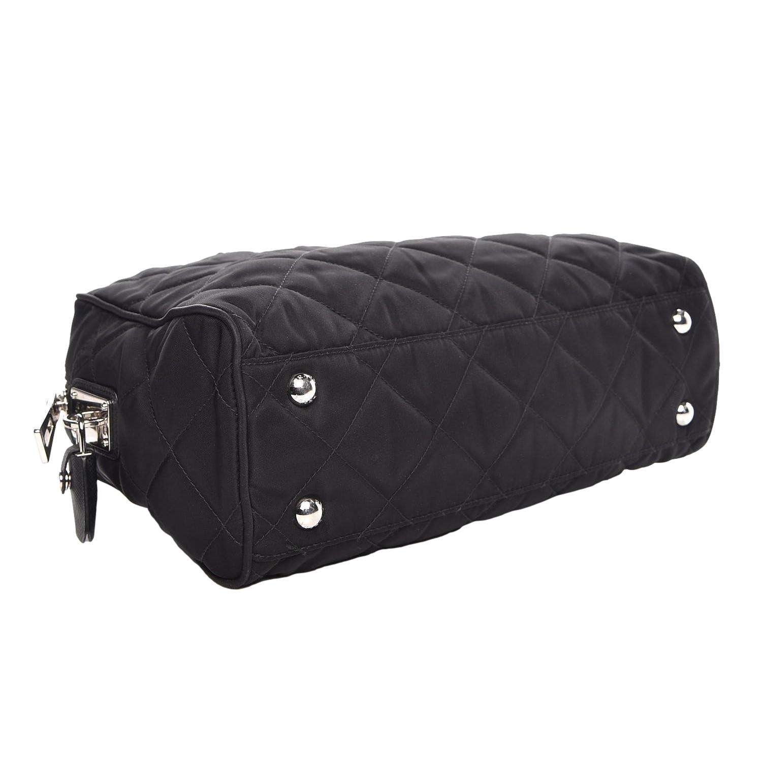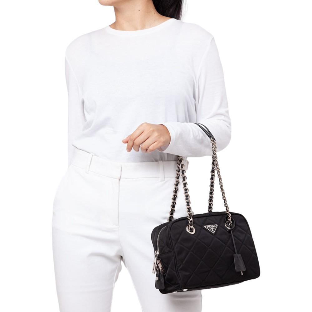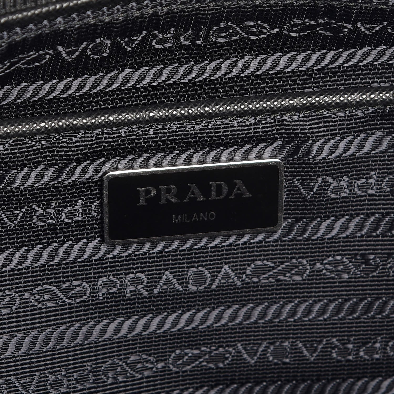 This black Prada bag is crafted with nylon that is detailed with a quilted pattern and iconic silver enameled Prada triangle logo. Convenience was not spared with the addition of four protective metal feet to protect the bottom of the bag from everyday wear. Top zip closure, or use optional padlock to keep your items safe. It also features ten-inch drop handles that comfortably sit on your shoulder.