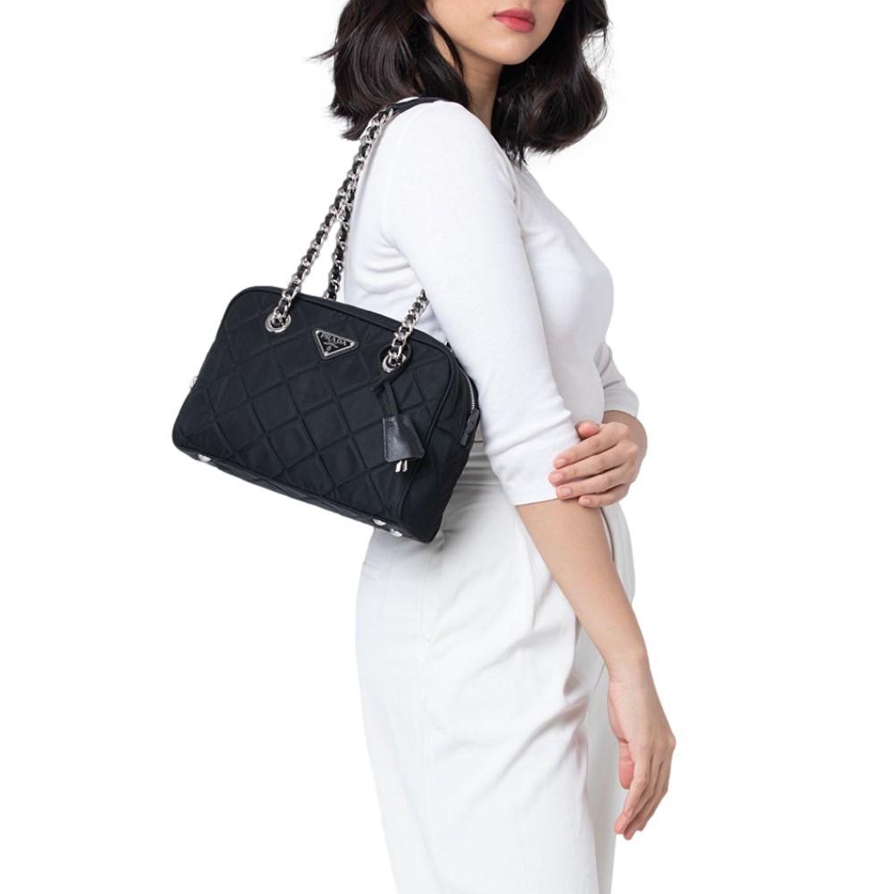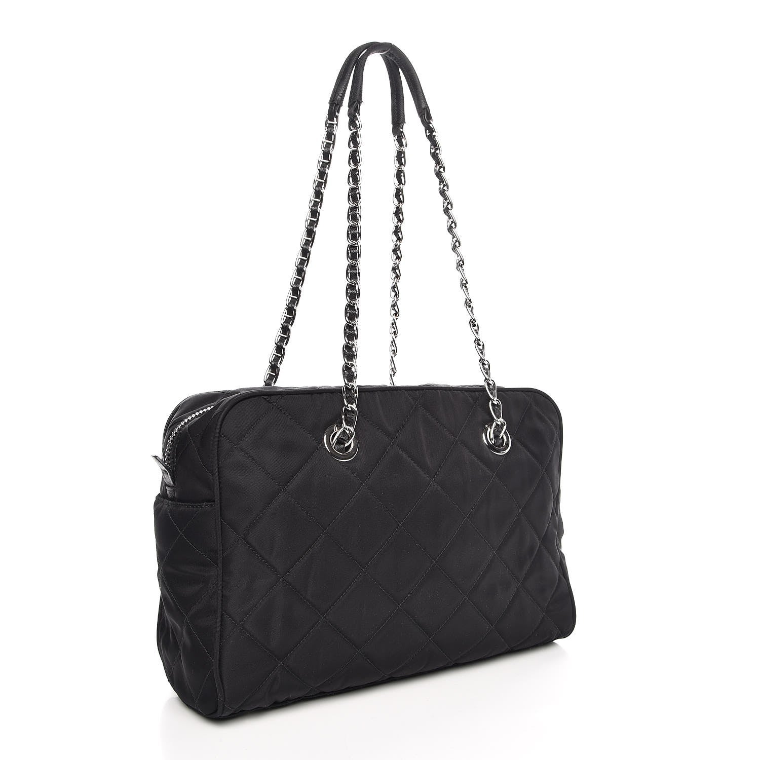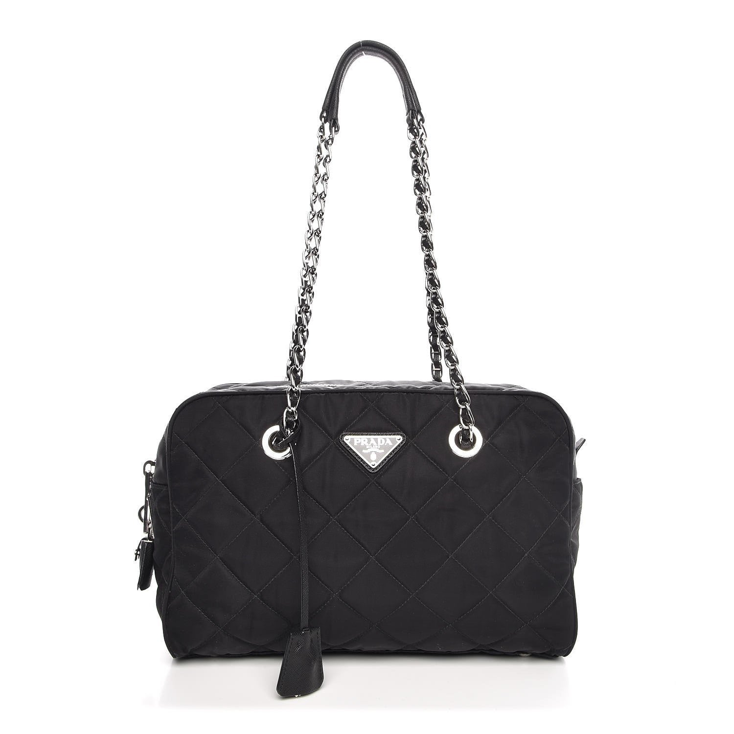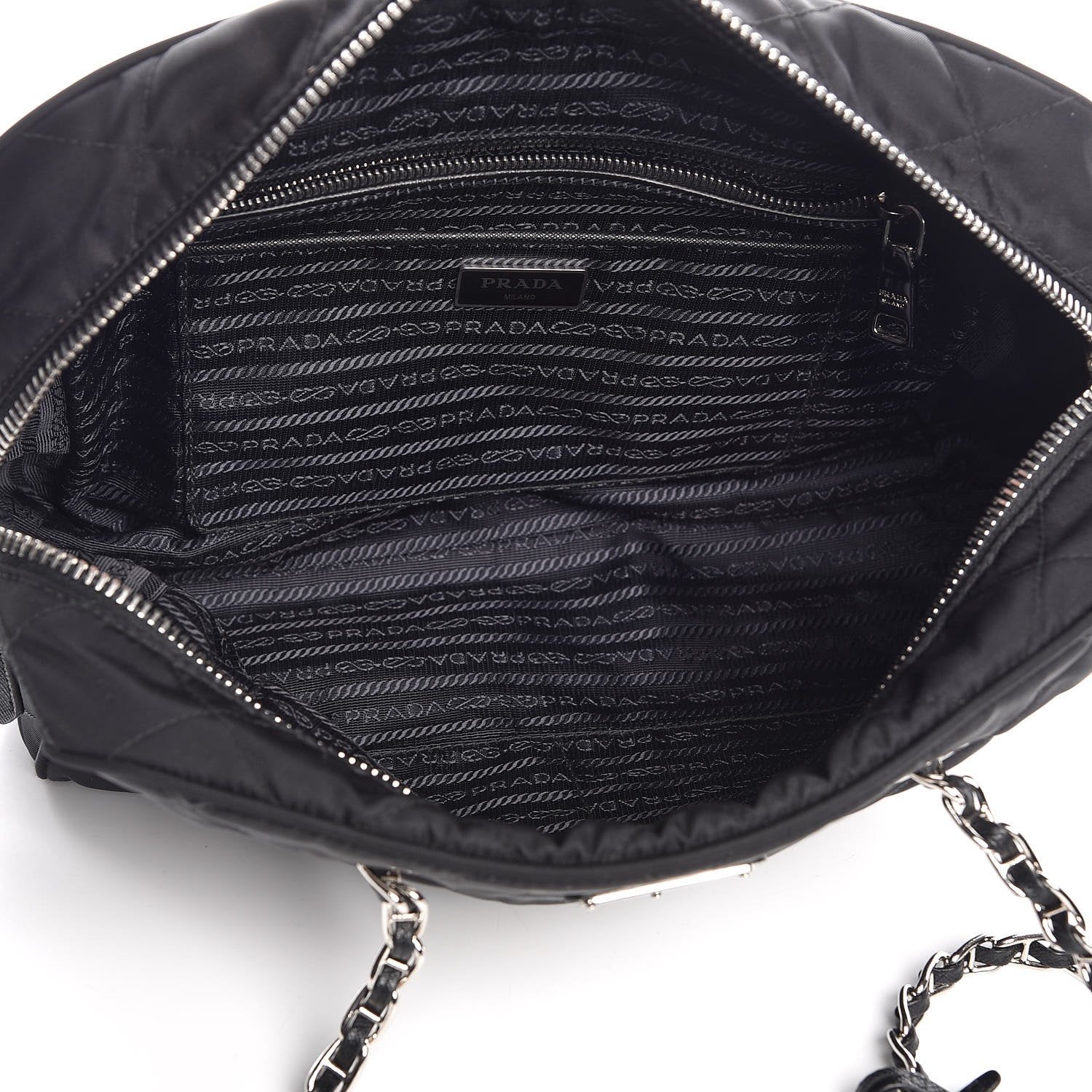 This black Prada bag is crafted with nylon that is detailed with a quilted pattern and iconic silver enameled Prada triangle logo. Convenience was not spared with the addition of four protective metal feet to protect the bottom of the bag from everyday wear. Top zip closure, or use optional padlock to keep your items safe. It also features ten-inch drop handles that comfortably sit on your shoulder.