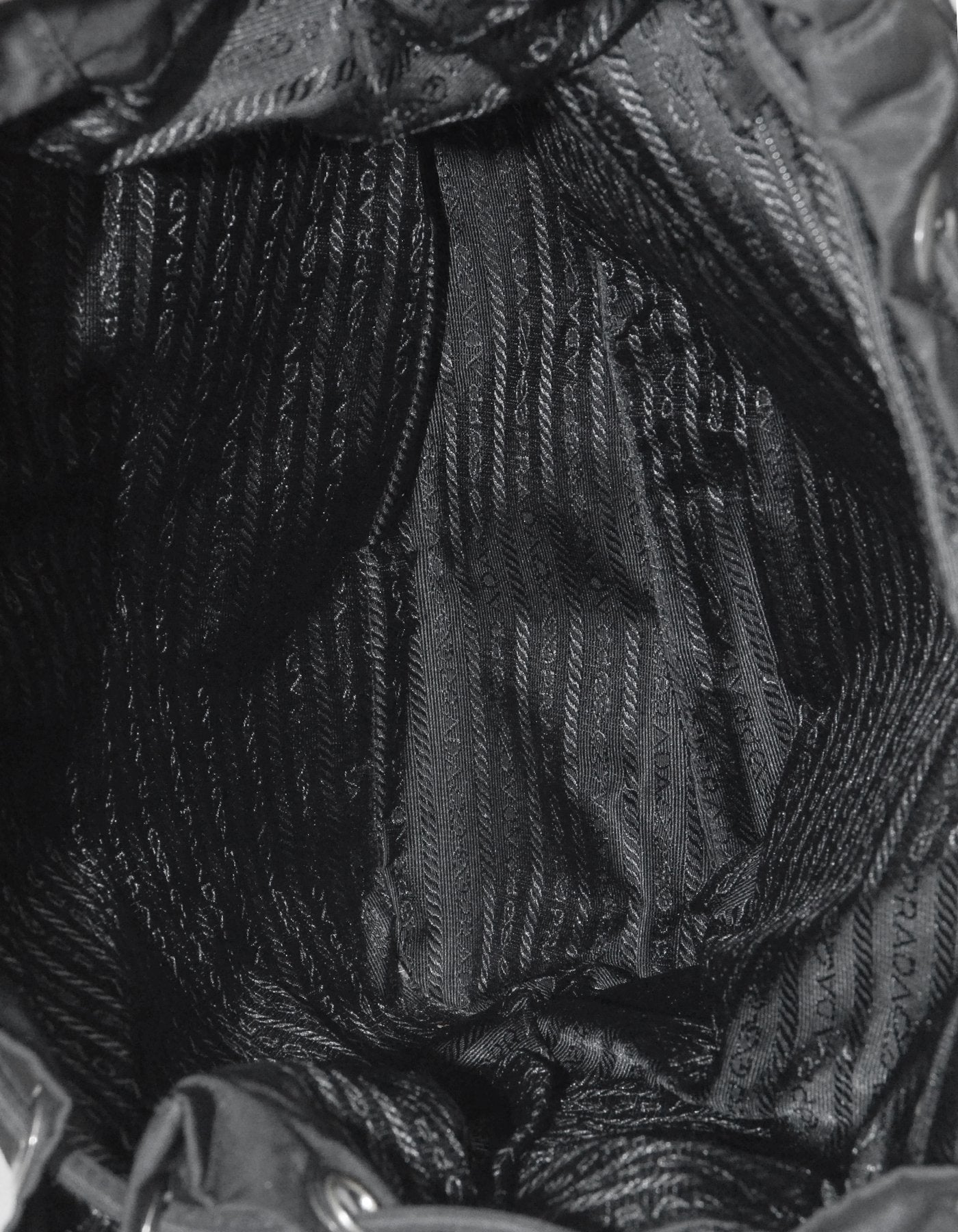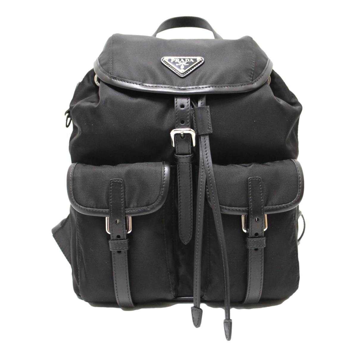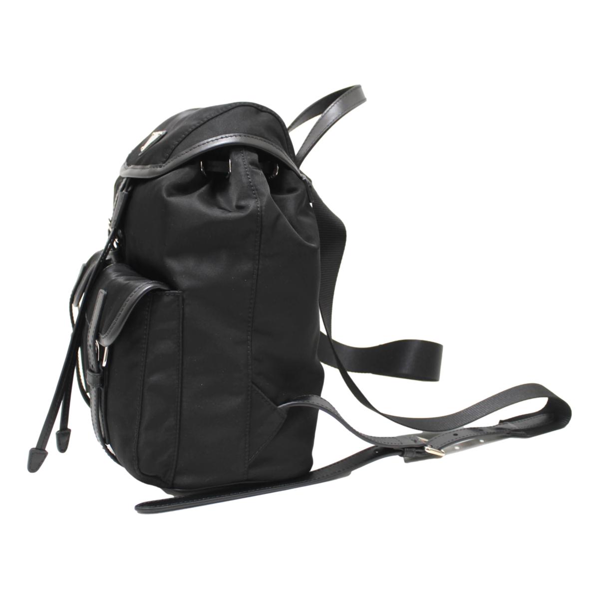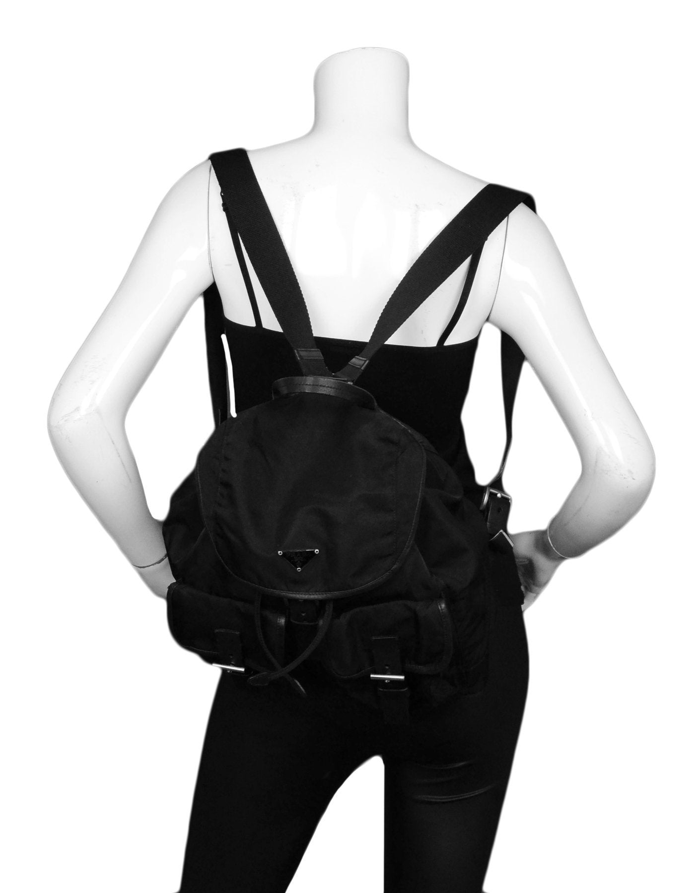 This authentic designer Prada backpack will quickly become your travel go-to! It carries all your personal belongings easily with its two exterior pouches and one main compartment. The bag features silver-tone hardware, soft calf leather trim, the iconic Prada logo at the top and adjustable shoulder straps. Both magnetic snap and buckle closures. Claim this beautiful bag before it's gone!