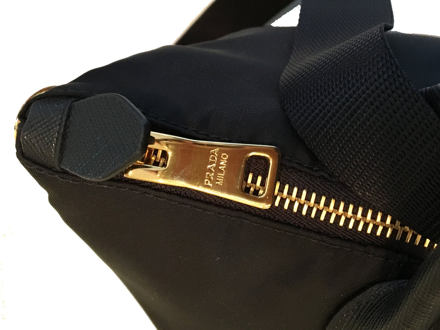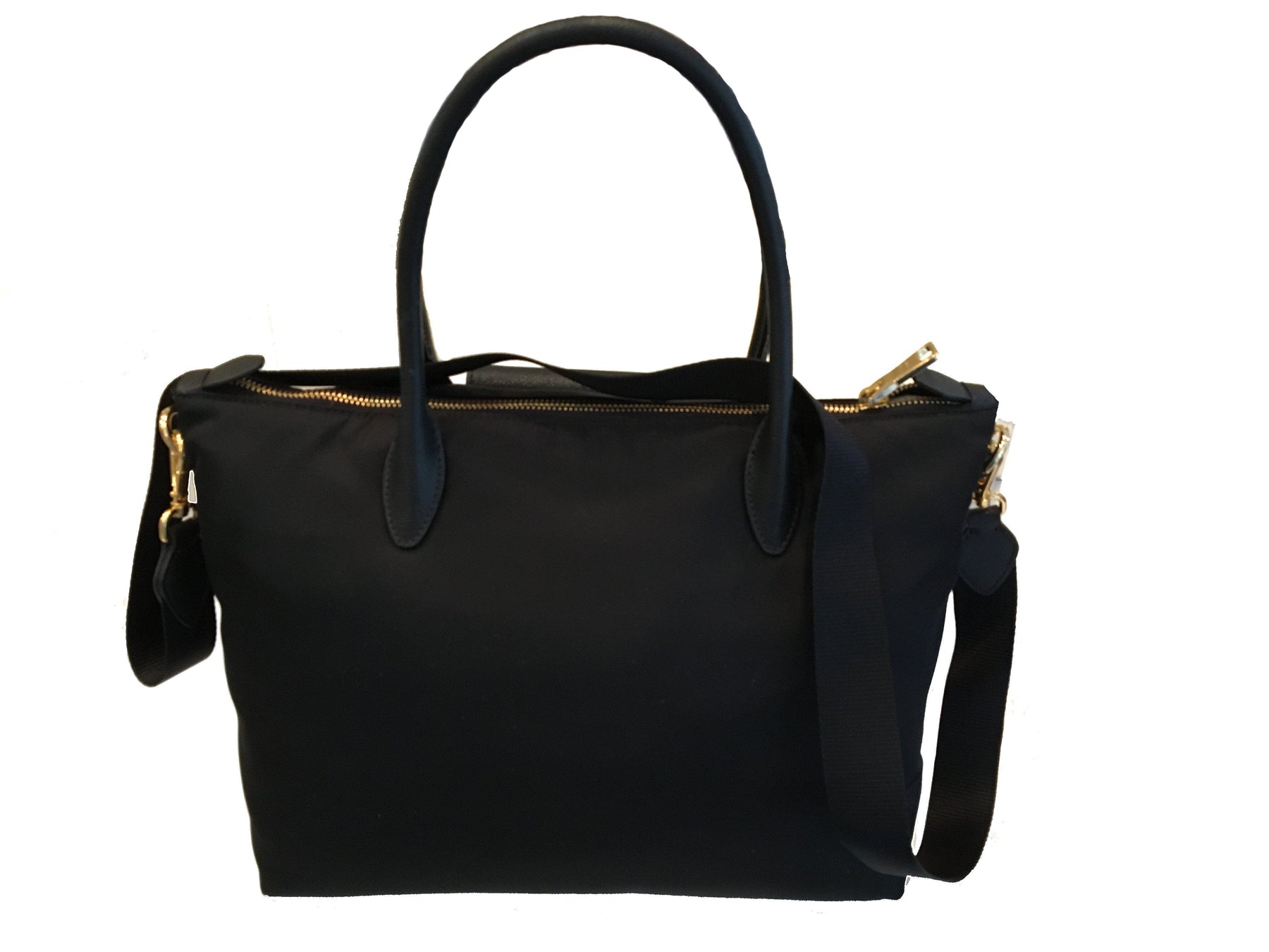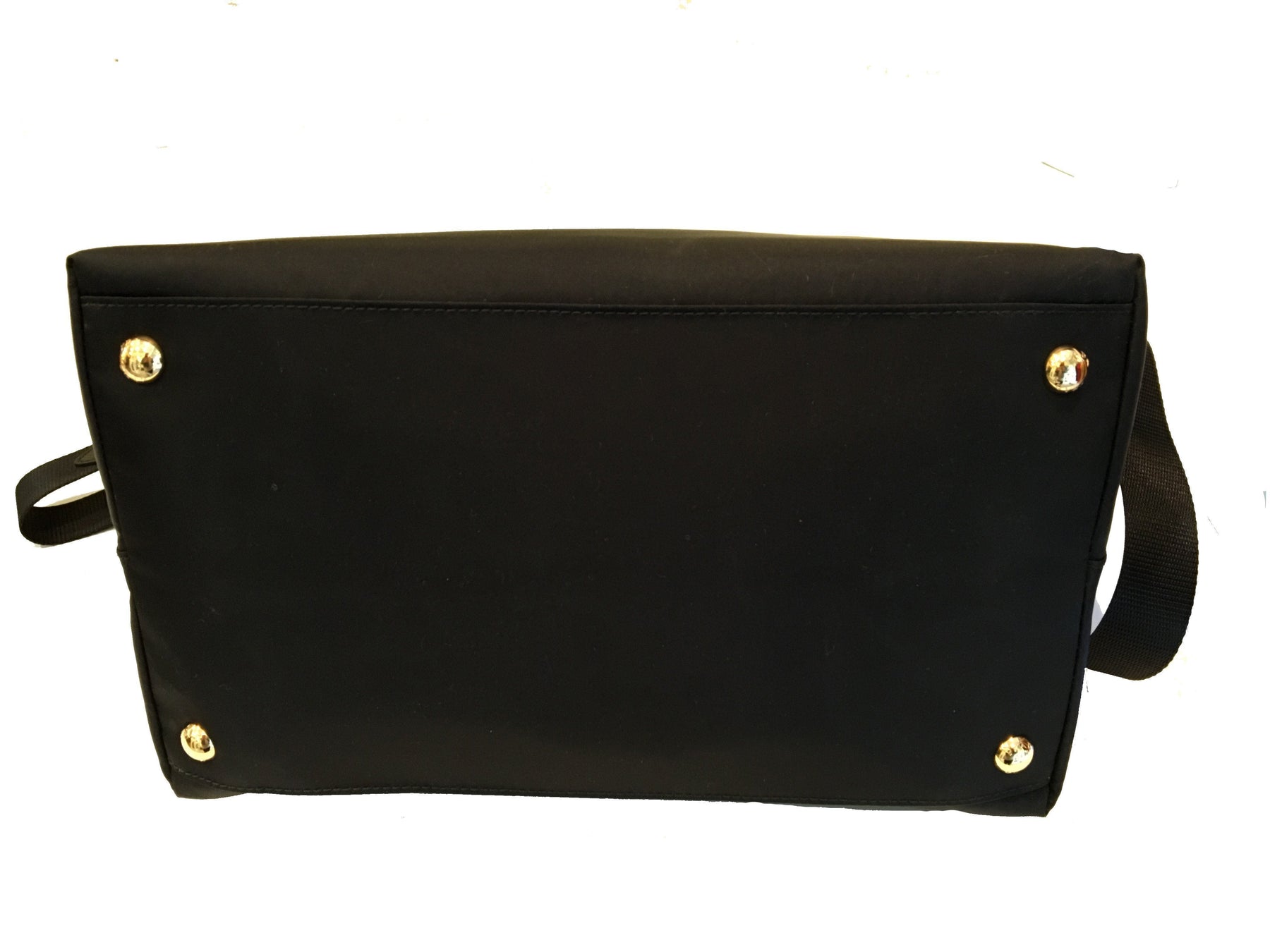 This Prada black shopping tote is classic as well as luxurious. With plenty of room for all your essentials you can pack up and go almost anywhere. Signature gold-tone hardware is a glamorous contrast to the durable and light-weight nylon. There is also luxurious Saffiano calf leather trim on the bag. Ideal for the sophisticated lady who prefers an understated bag with effortless practicality. There are two leather drop handles for easy carrying as well as a detachable shoulder strap. The bottom of the bag features protective gold-toned feet so you don't have to worry about getting your bag dirty when you set it down. The zipper closure makes it easy for you to get in and out of the bag. Inside the main compartment you'll find a slip pocket and a zippered pocket to help keep your items organized. The Prada triangle enamel logo adorns the front flap of the bag, which not only provides a nice contrast detail but also a practical exterior pocket with a magnetic snap closure.