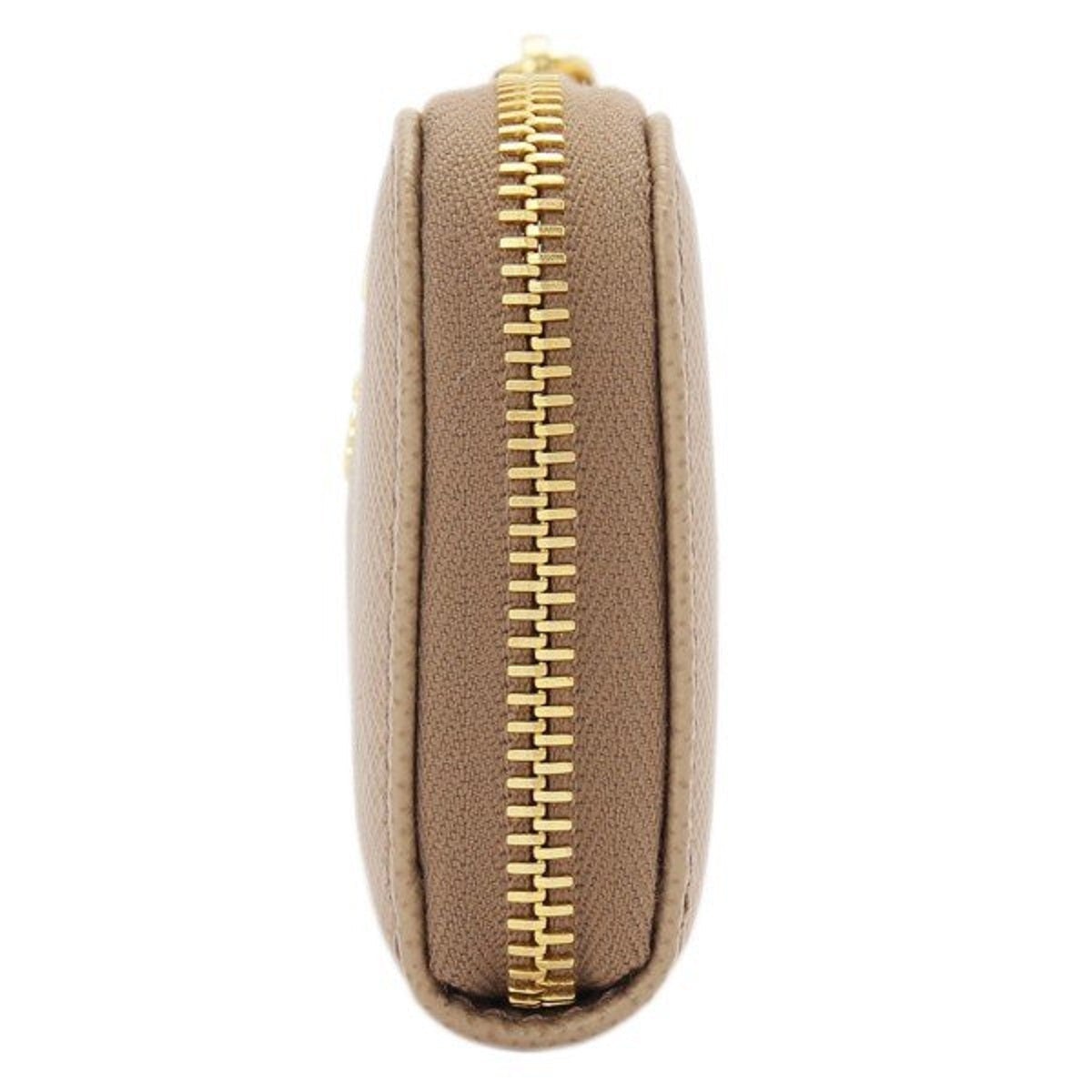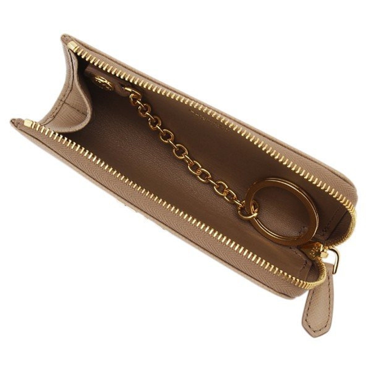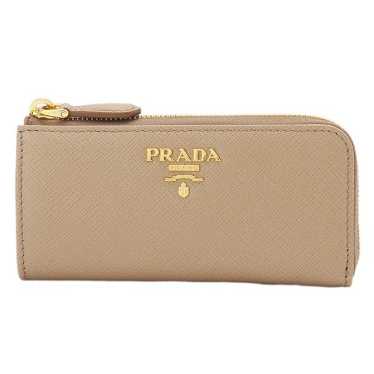 This Prada keychain wallet is constructed with beige saffiano leather. The zipper fastening opens to a smooth beige leather interior with a detachable keychain. The key holder wallet can fit keys, credit cards, bills, and coins. This functional and stylish piece from Prada is the perfect size to hold your essentials!