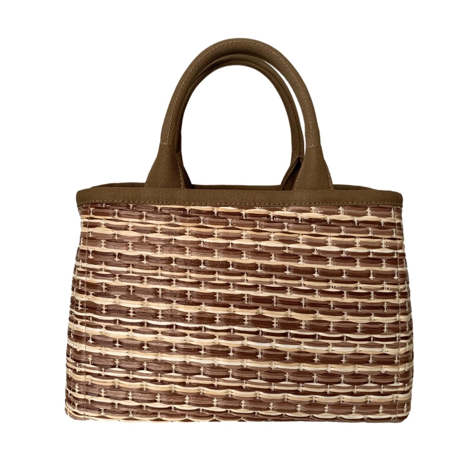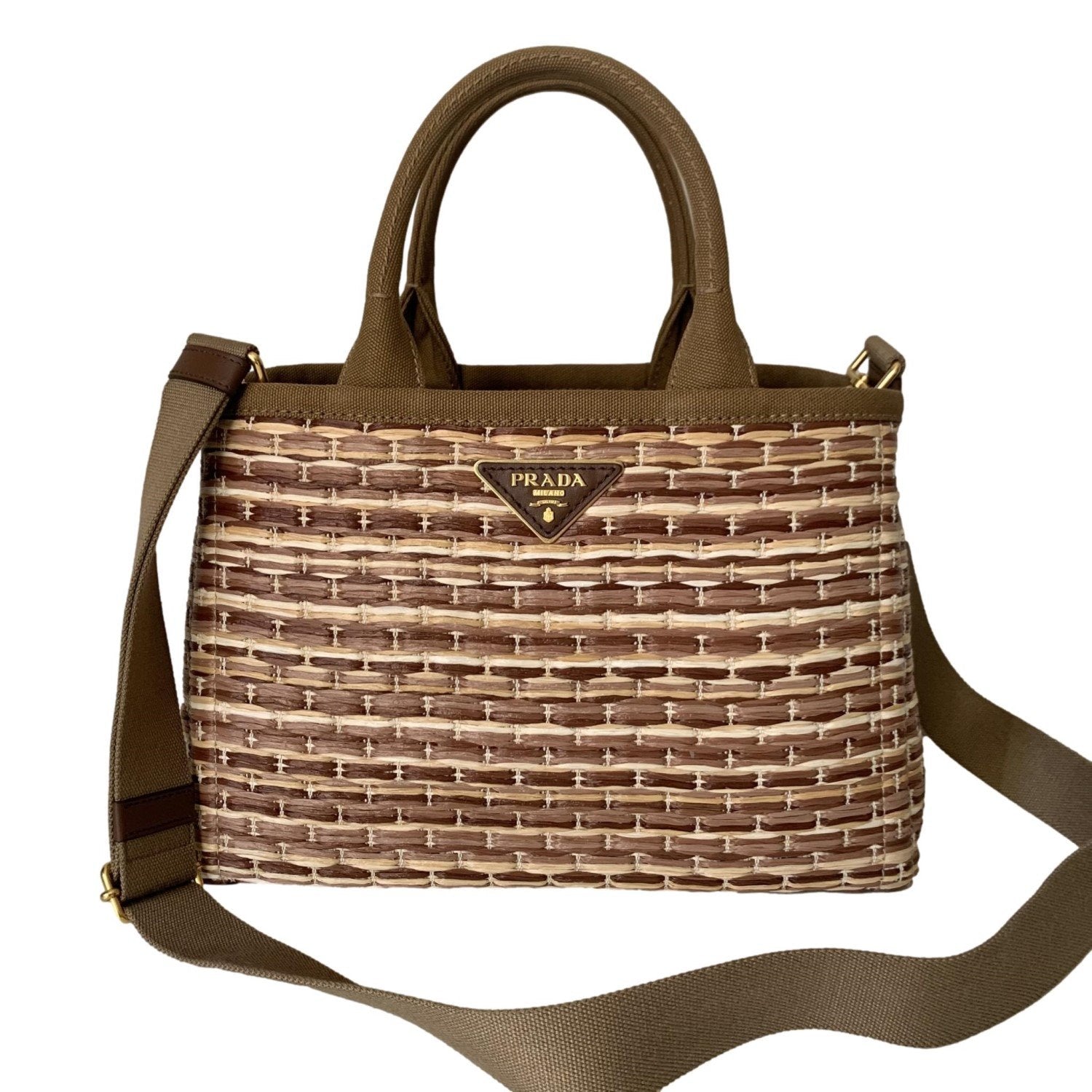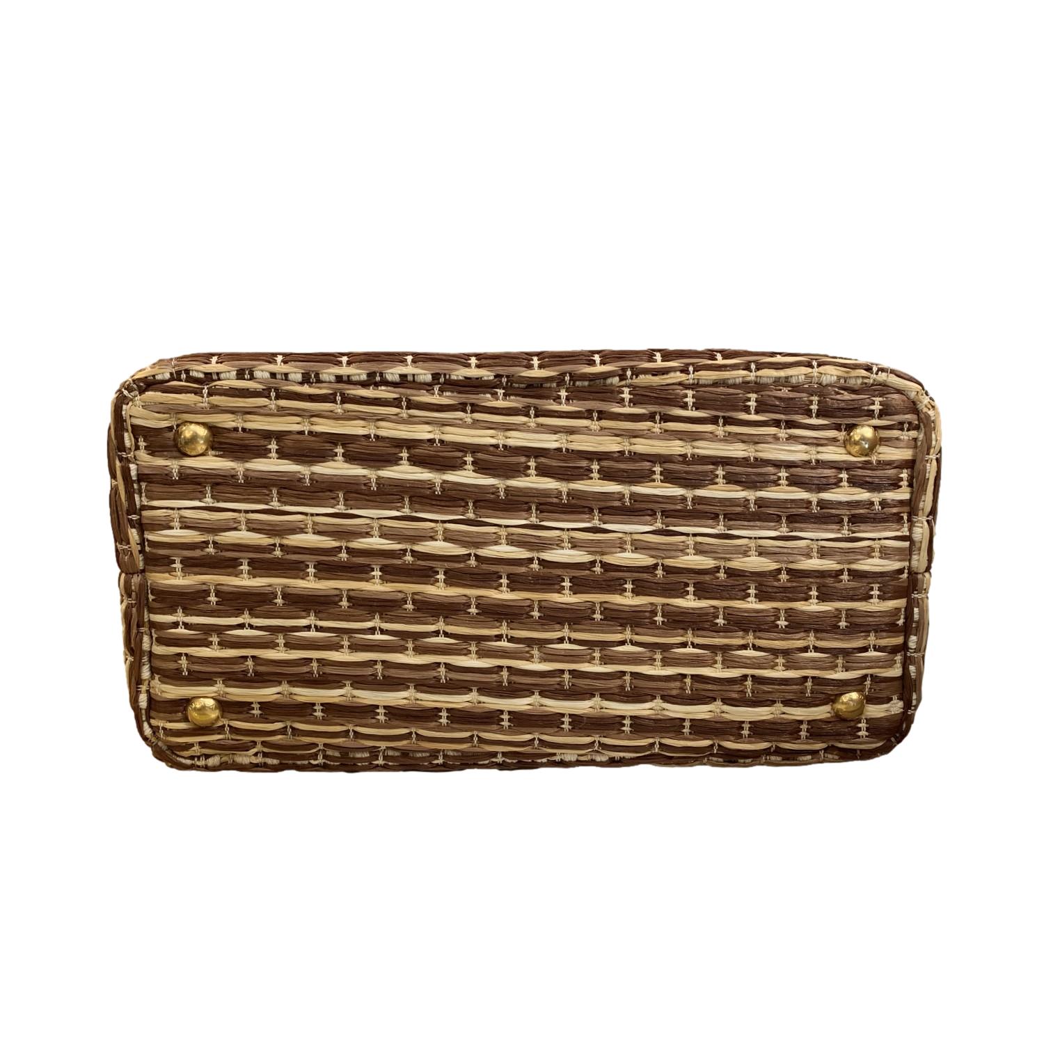 The convertible top handle bag from Prada is crafted with a beautiful multicolor tan woven straw all around with all gold-toned hardware accents. The bag is lined with tan canvas along with the double handle and adjustable strap. This gorgeous Prada tote is the perfect for warmer weather!
