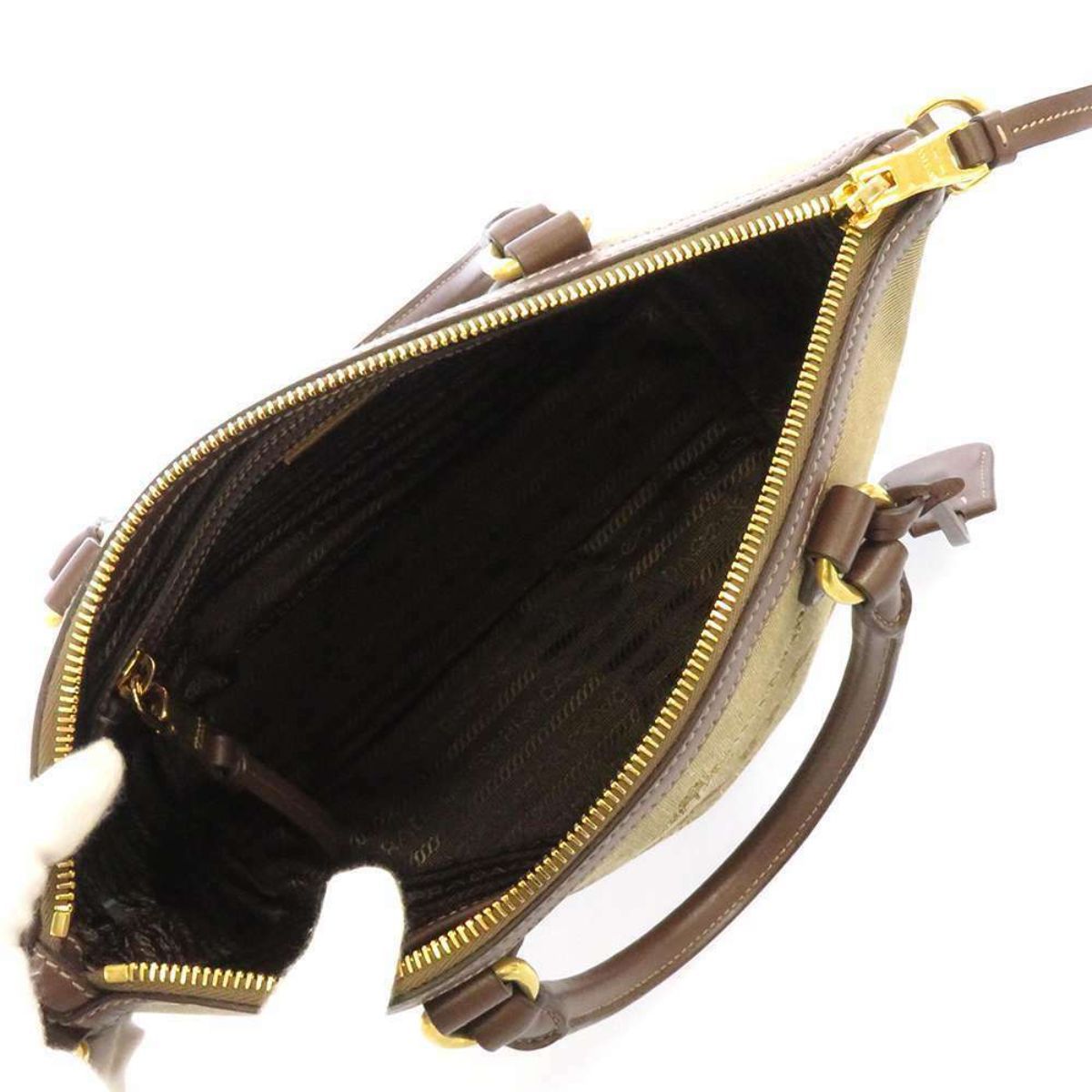 This top-handle convertible handbag from Prada is crafted with a beige canvas and trimmed with smooth brown leather details. The top zipper opens to a jacquard fabric lined interior with a zip pocket and patch pocket. It has double rolled top handles and a detachable shoulder strap. This bag has room for all your essential needs, making it the perfect everyday bag!