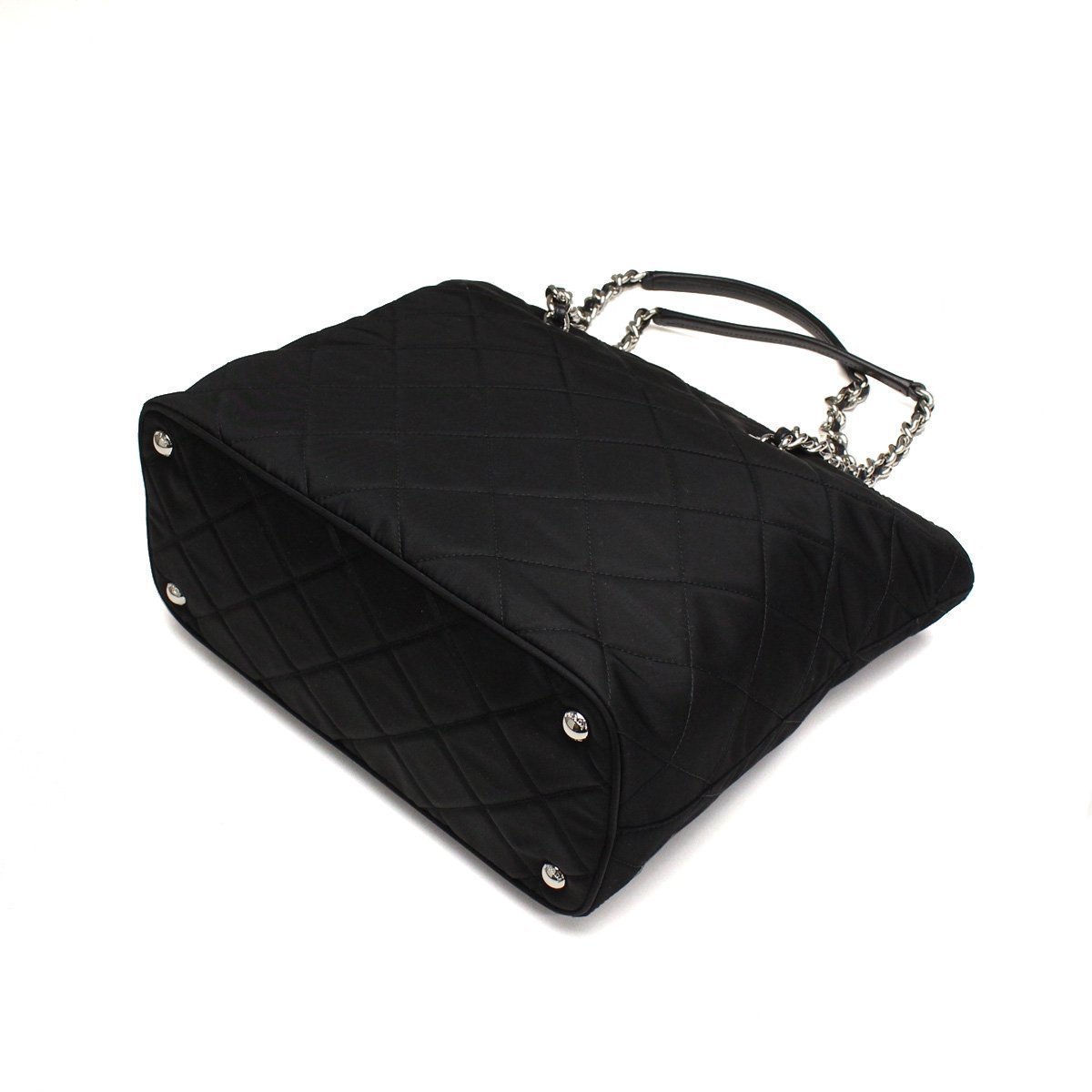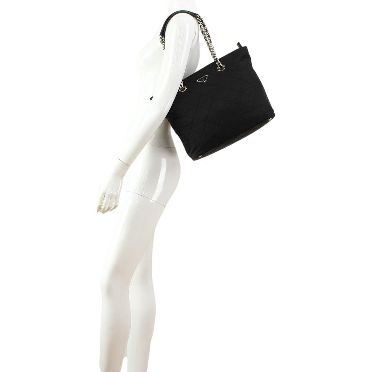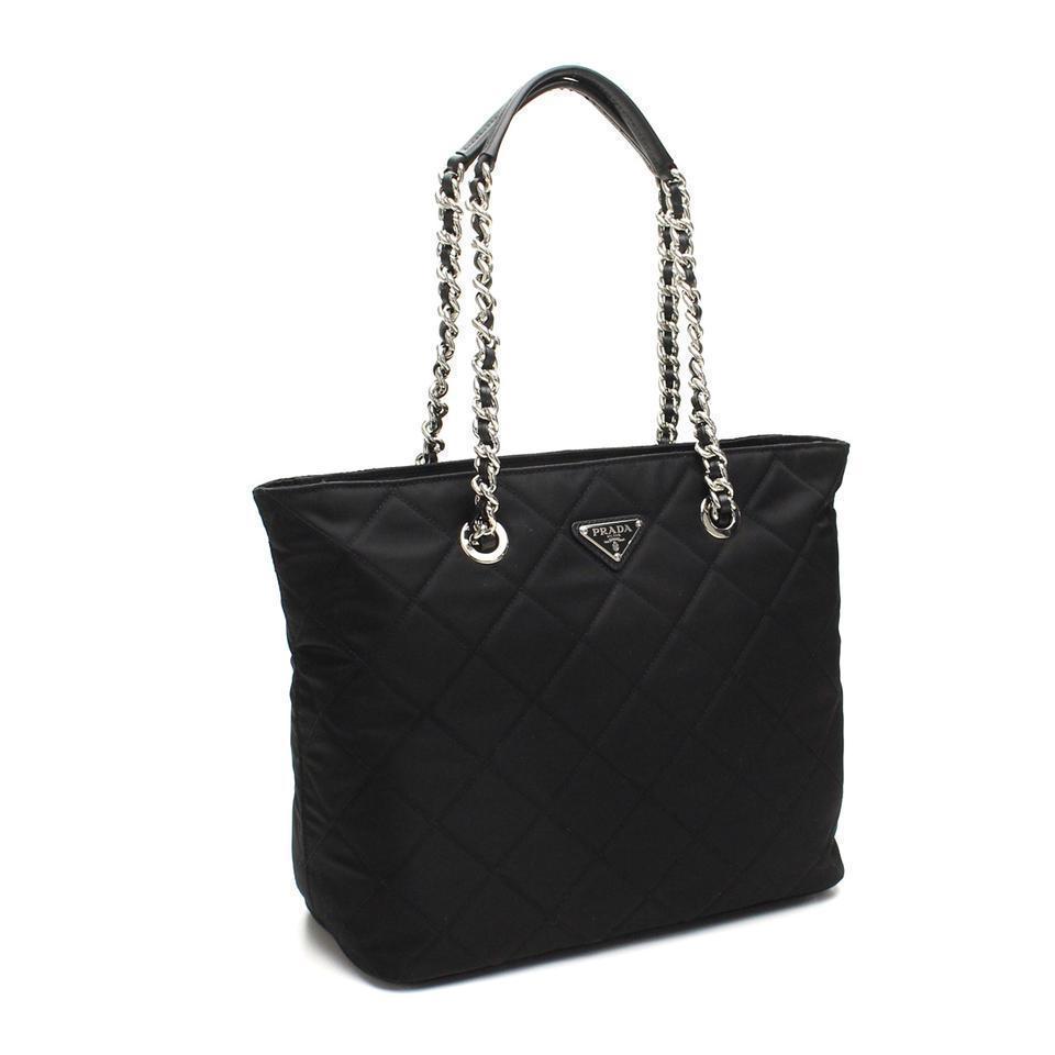 This stylish Prada bag is perfect way to complete an outfit. The silver chain giving it a luxurious feel and gives a pop of color to the black bag. The two way zipper opens to a nylon interior with one zipper pocket and one other large pocket. This tote is the perfect size for your shopping ventures.