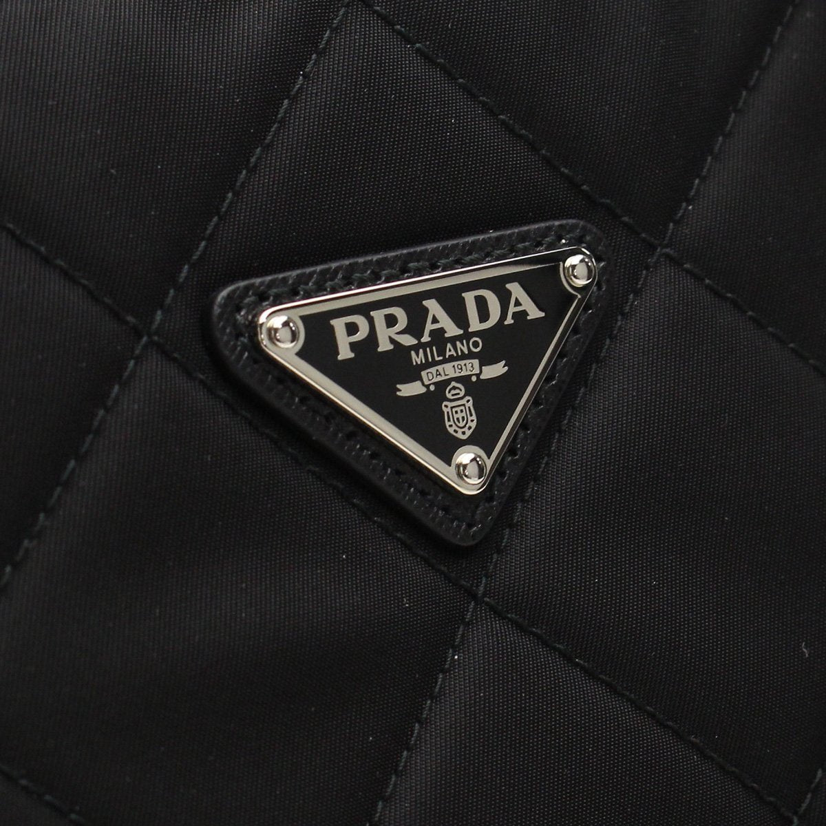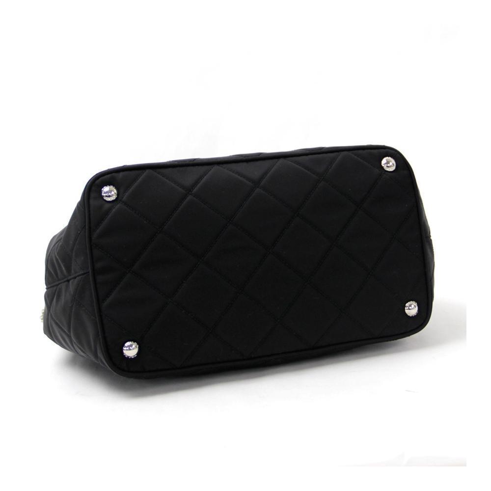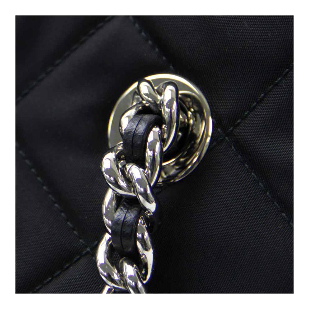 This stylish Prada bag is perfect way to complete an outfit. The silver chain giving it a luxurious feel and gives a pop of color to the black bag. The two way zipper opens to a nylon interior with one zipper pocket and one other large pocket. This tote is the perfect size for your shopping ventures.