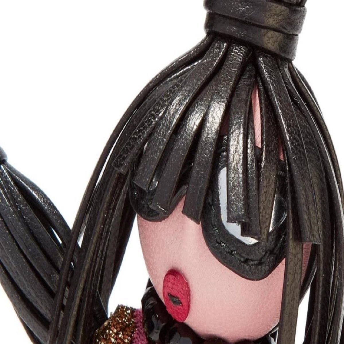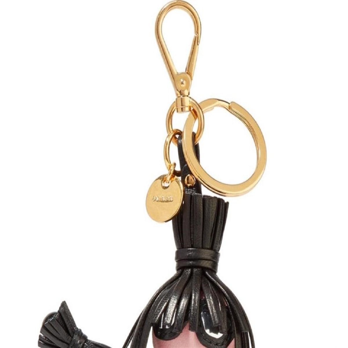Prada's leather Jasmine key ring features a pink brocade fabric dress with black leather belt. A lobster clasp closure, spring-ring fastening, gold-tone hardware with an engraved logo charm makes this the perfect accessory for your bag or keys.