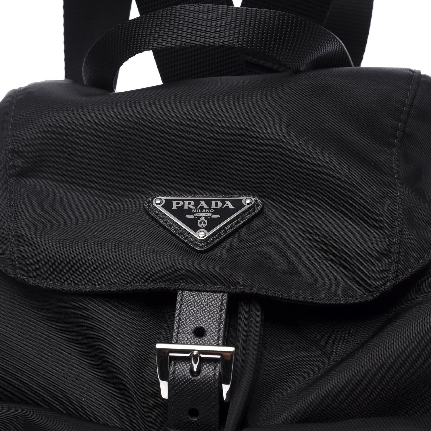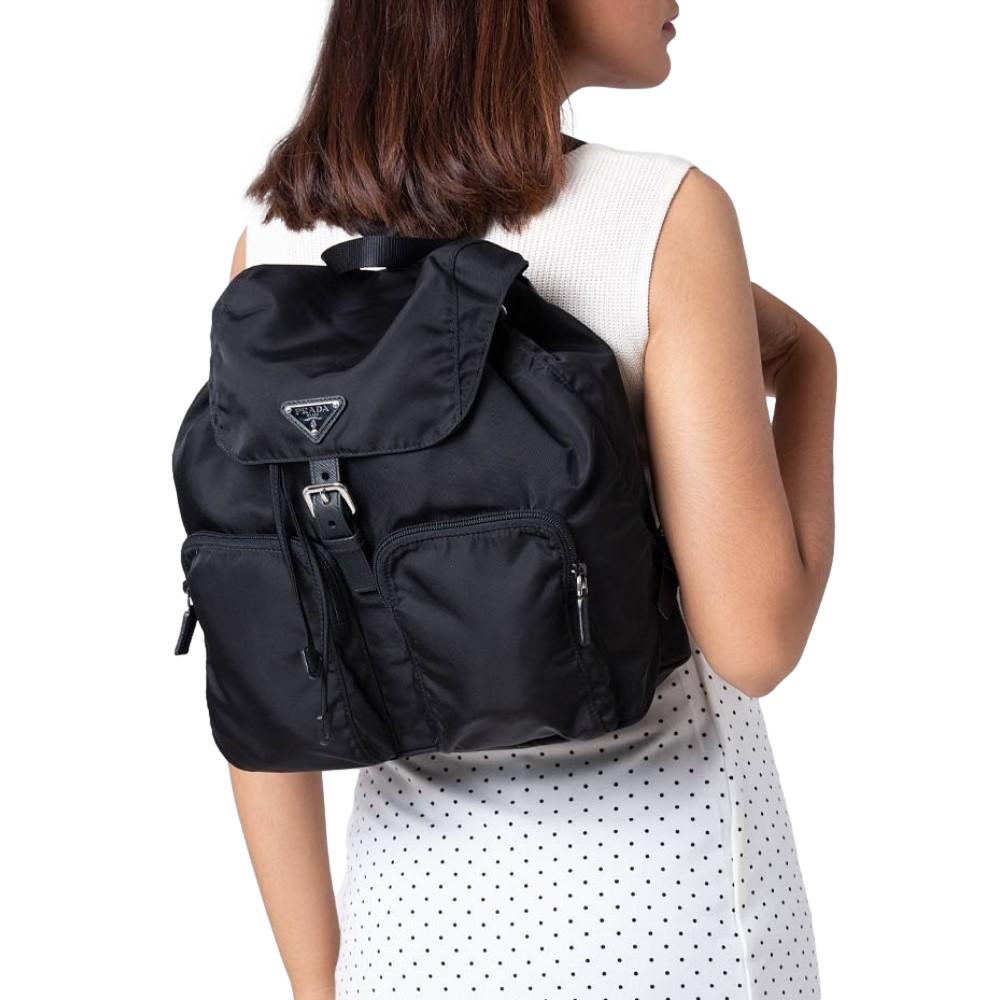 This Prada backpack is an elevated take on a hands-free bag that is sure to be your go-to for everyday use. It is made of nylon with Saffiano leather trim. The shoulder straps are adjustable, and it also has a top handle to make it easy to grab quickly. This bag features a drawstring closure, hidden beneath the flap that secures with a buckle. There are two front zippered pockets and the large main compartment has an additional zippered pocket to keep you organized.