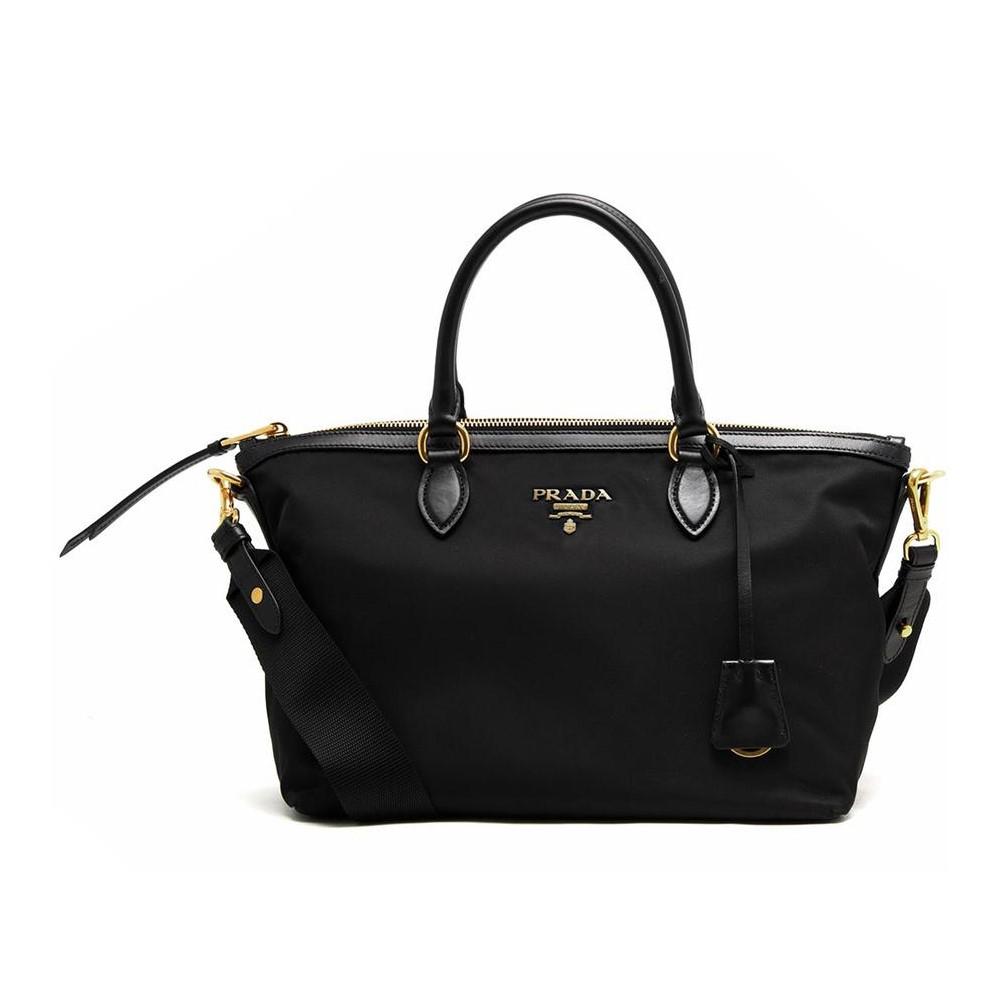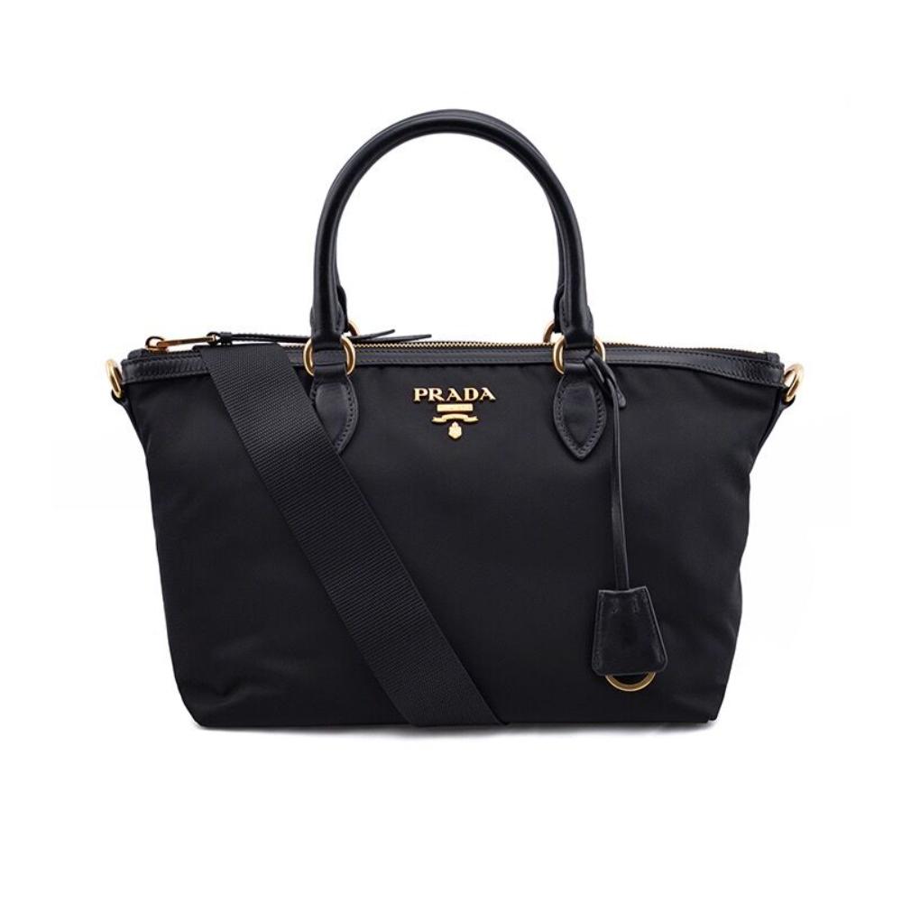 A Prada classic, this tessuto nylon two-way bag is perfect for everyday wear. The large open interior can fit all of your necessities, and has a zip top closure. There is one zip pocket, and one magnetic slip pocket on the interior. On the exterior, the Prada logo is in gold hardware. Double rolled smooth leather top handle, and includes removable nylon strap. Wear as a shoulder bag, or carry as a tote. This bag is lightweight, and would be a great bag for travel.