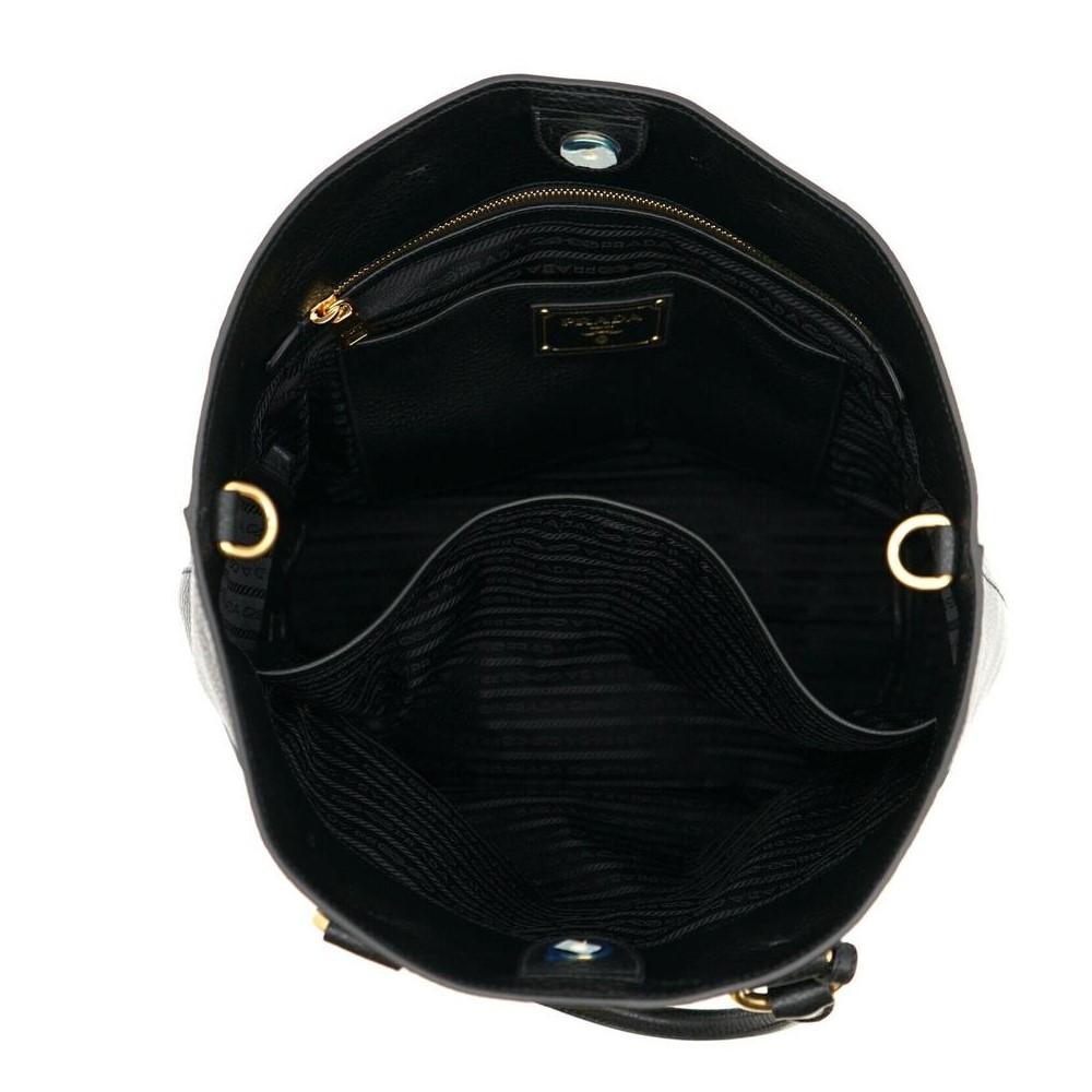 This classic handbag is crafted with a black Vitello Phenix pebbled calfskin leather and gold-tone hardware. The three interior pockets and magnetic snap closure make it easy to access your belongings. Its spacious jacquard-lined interior has room for a laptop, tablet, and all your other essentials. The detachable and adjustable leather shoulder strap add functionality to this handbag. This versatile bag is perfect for everyday use, travel, and work, with the distinctive style and quality from Prada!