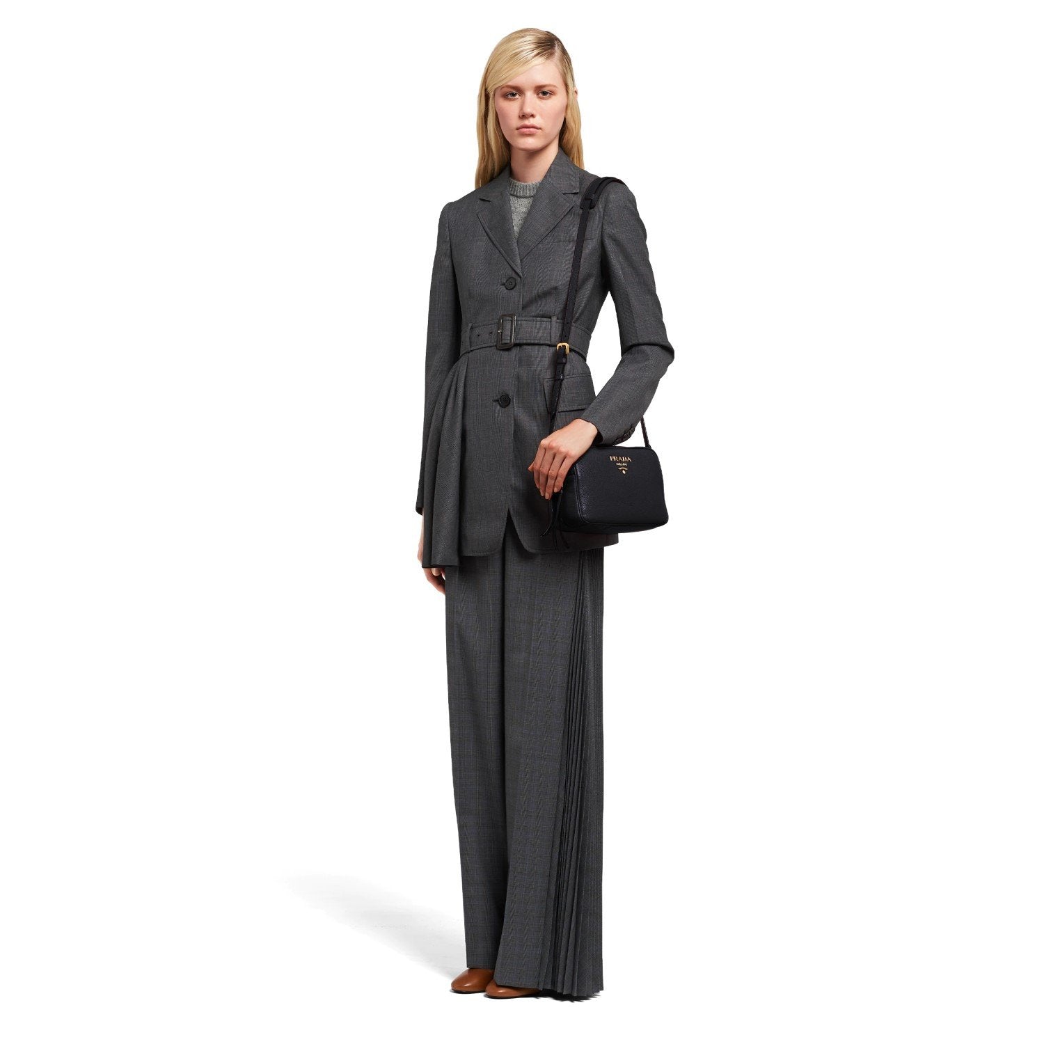 This crossbody bag is crafted with black vitello phenix leather. The bag features a gold Prada Milano logo on the front and an adjustable leather strap. The two zipper compartments open to a spacious jacquard lined interior that allows for convenient storage and organization. This Prada handbag is great for everyday use with the distinctive quality and style of Prada!