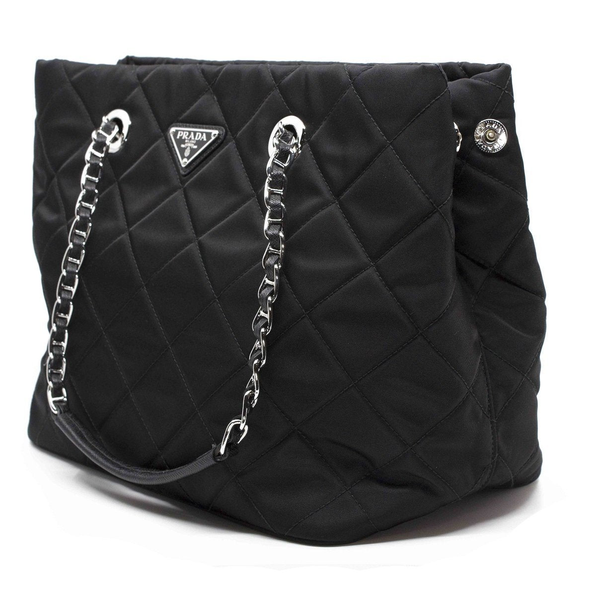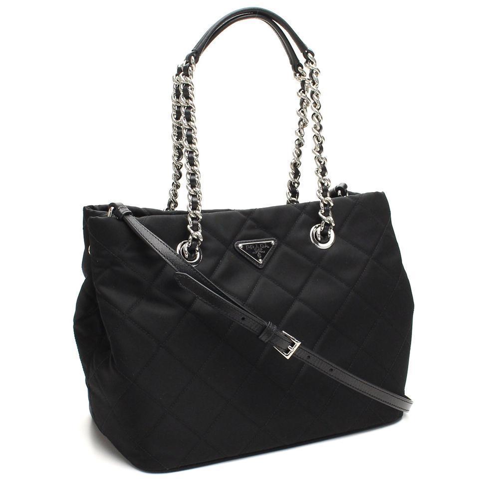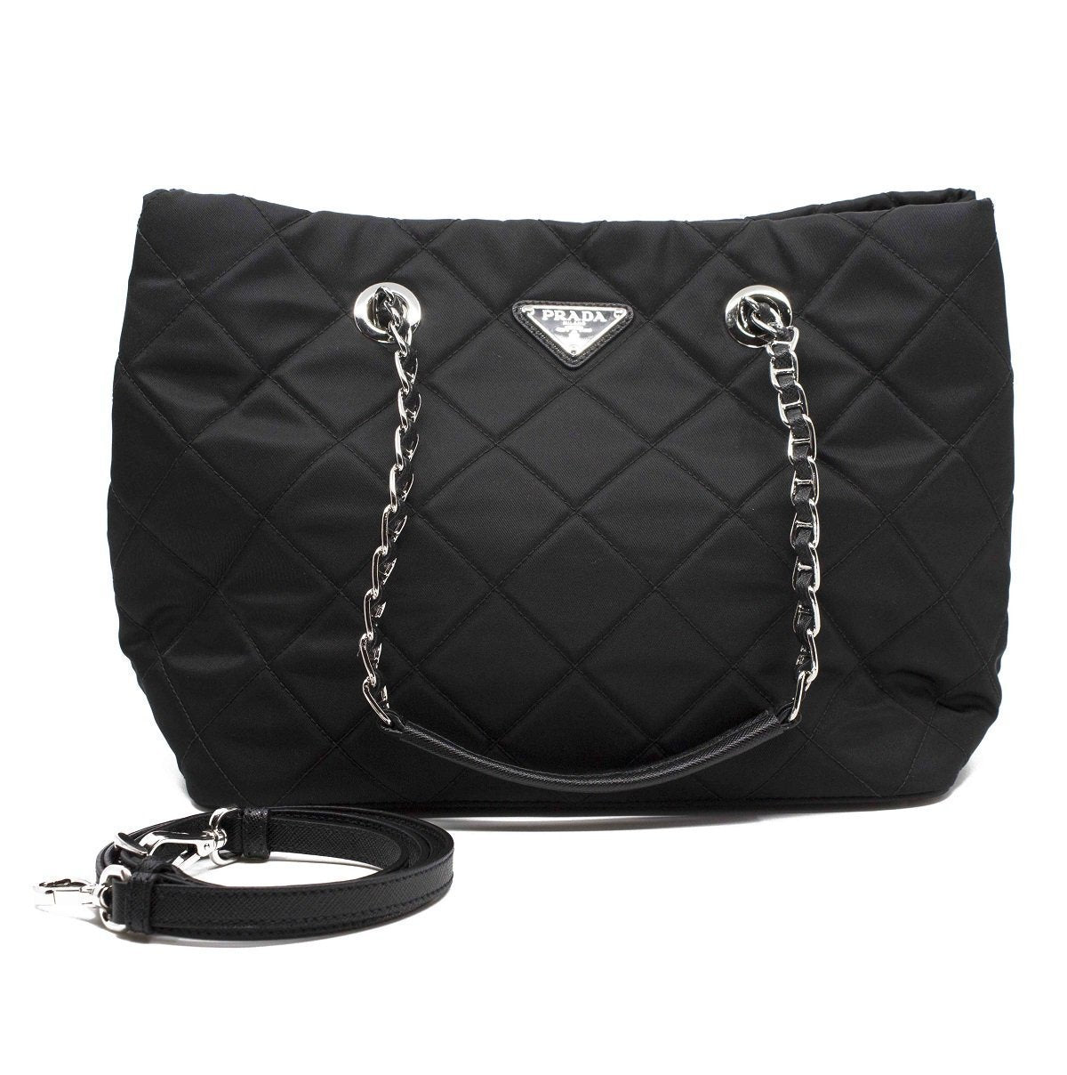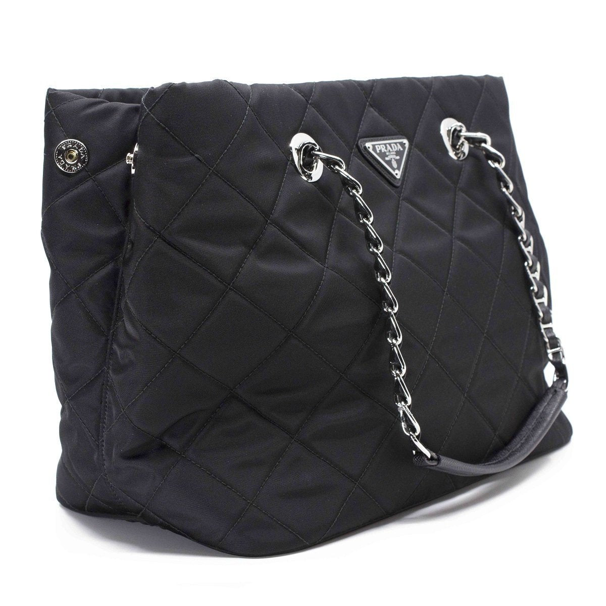 This Prada Nylon Bag is perfect for everyday use. The nylon is easy to care for and black goes with everything. There are two chain handles with leather shoulder pads for comfort as well as a detachable and adjustable leather strap. The Prada triangle logo is made of enamel and featured on the front of the bag. The interior is spacious with a zippered compartment and two slip pockets. There are protective bottom feet to ensure that when you set this bag down the nylon won't be resting directly on the floor.