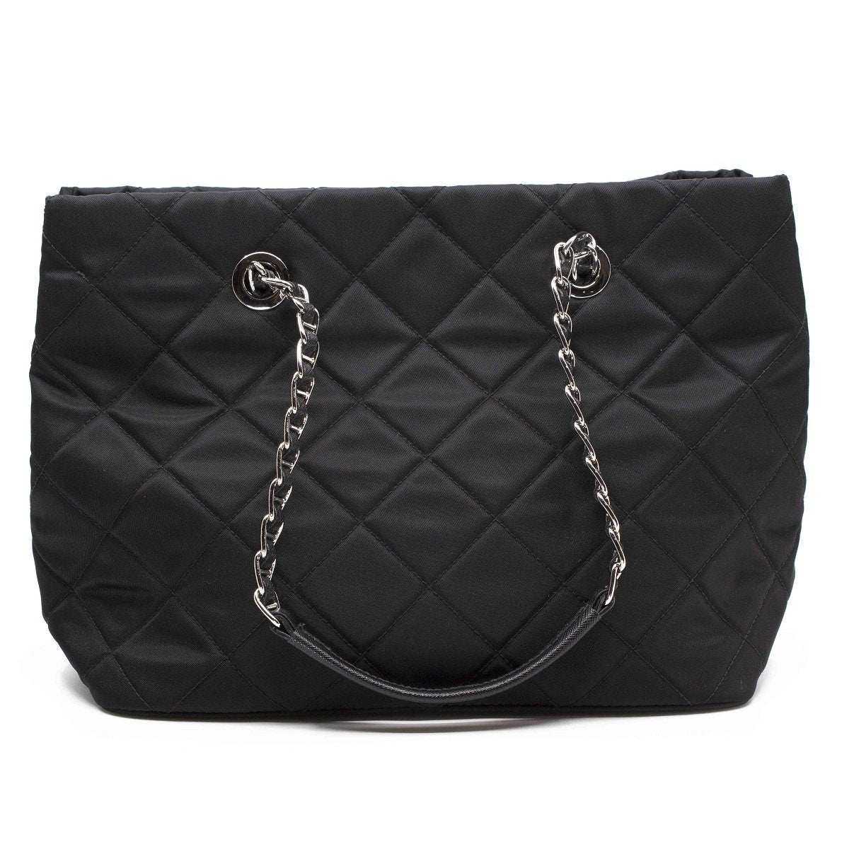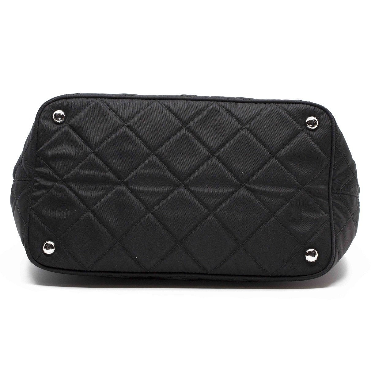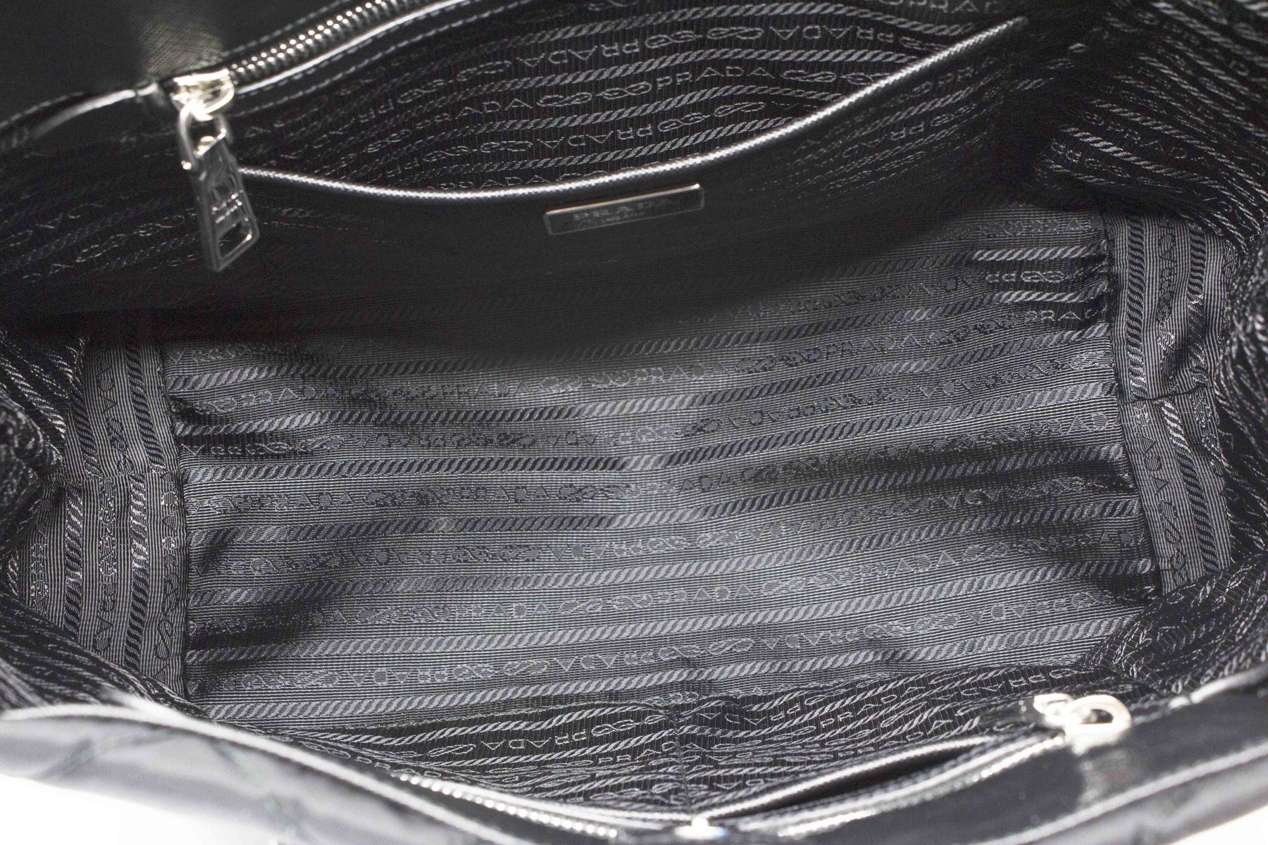 This Prada Nylon Bag is perfect for everyday use. The nylon is easy to care for and black goes with everything. There are two chain handles with leather shoulder pads for comfort as well as a detachable and adjustable leather strap. The Prada triangle logo is made of enamel and featured on the front of the bag. The interior is spacious with a zippered compartment and two slip pockets. There are protective bottom feet to ensure that when you set this bag down the nylon won't be resting directly on the floor.