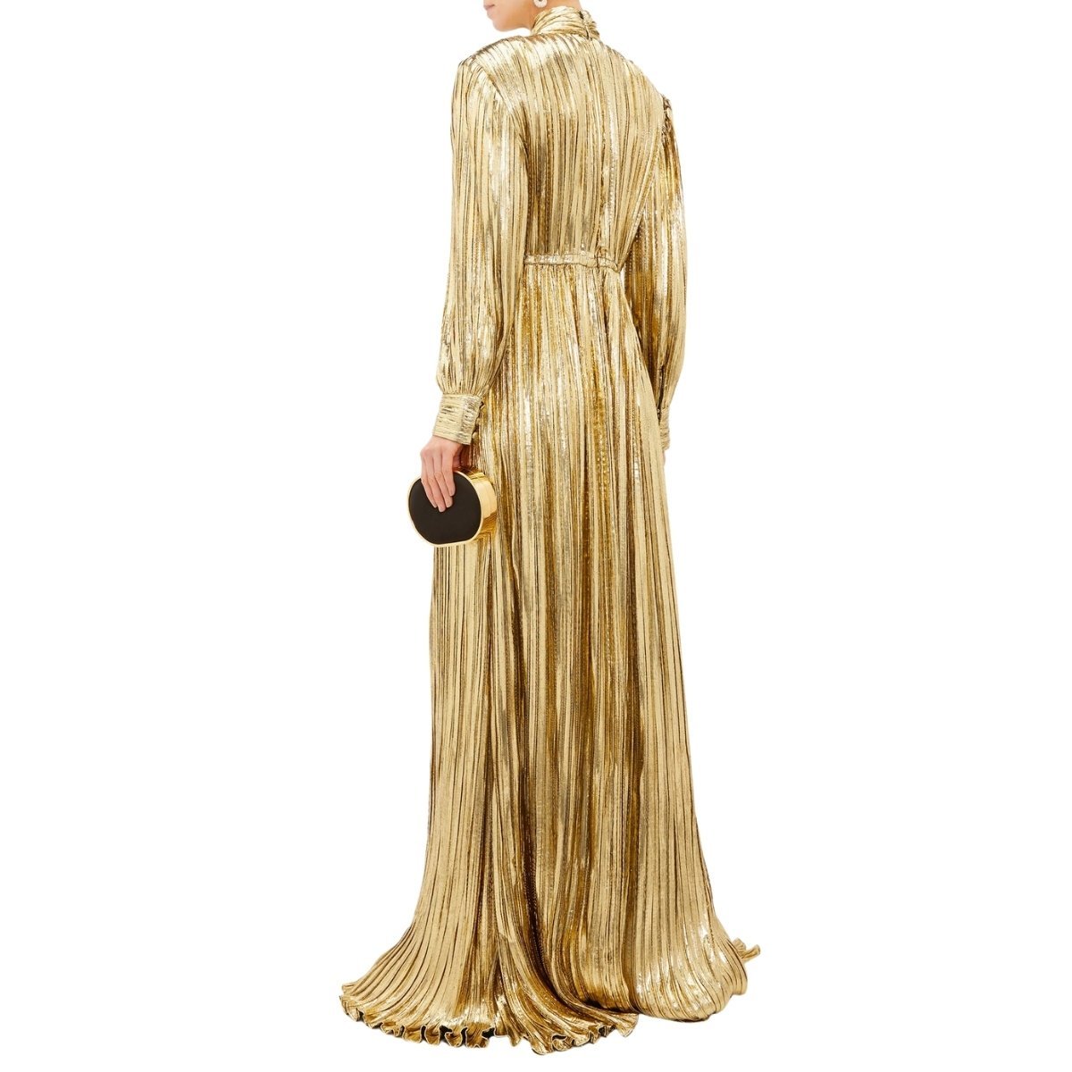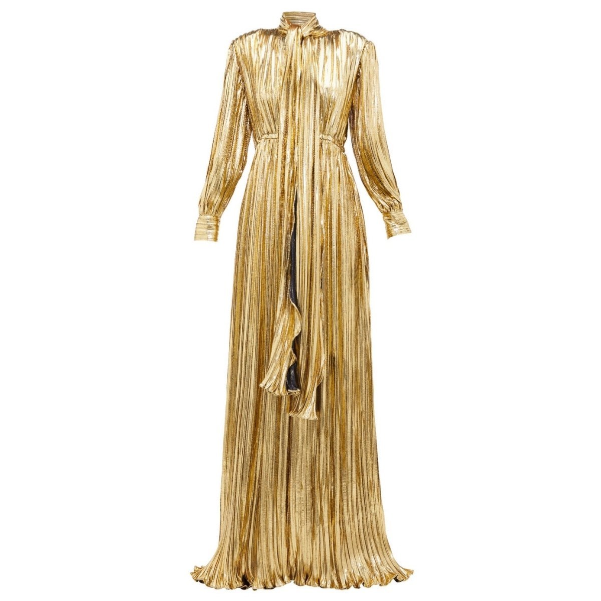 It’s crafted in Italy from plissé silk-blend lamé with wide pussy-bow ties and defined padded shoulders, falling loosely to the undulating, floor-pooling hem. Team it with platform sandals to evoke the house's signature styling.