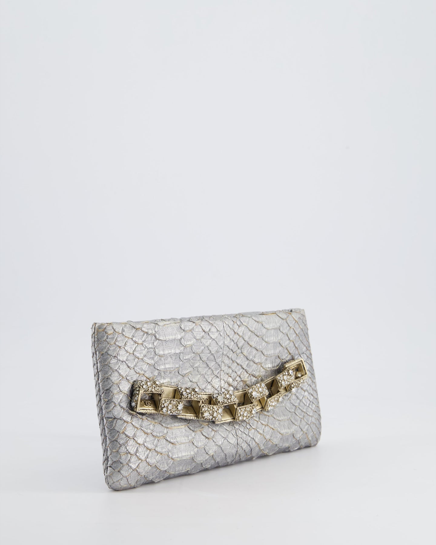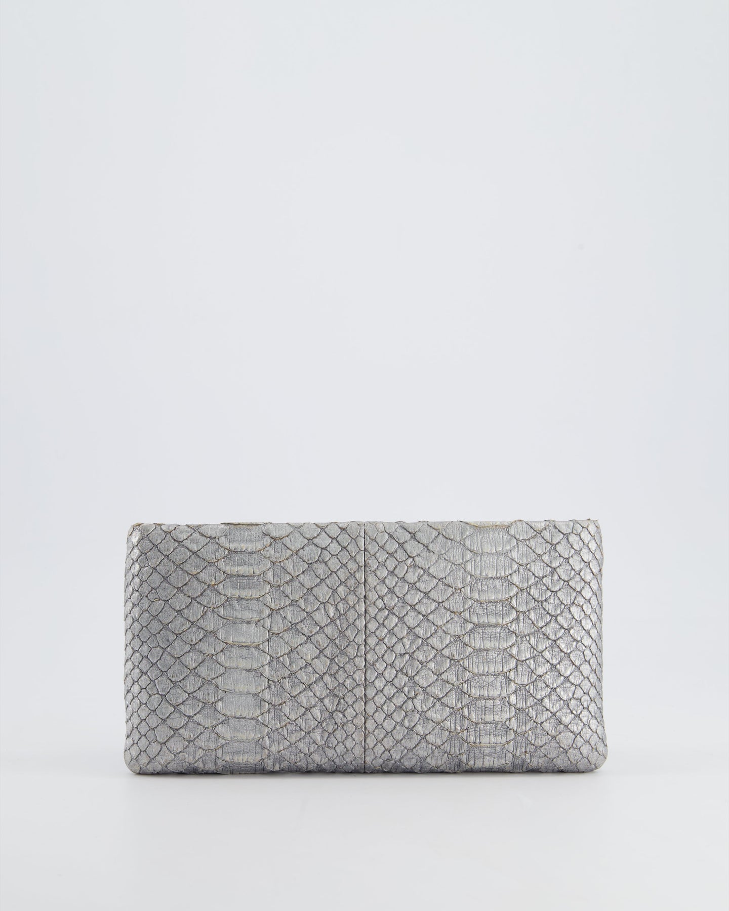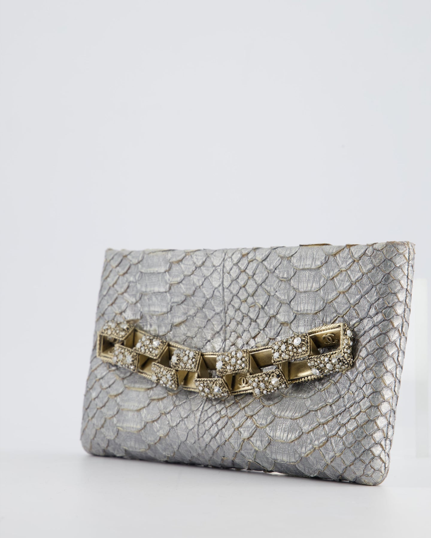*RARE* Chanel Metallic Silver Paris Bombay Clutch in Python Leather and Antique Gold Hardware with Embellished Crystals