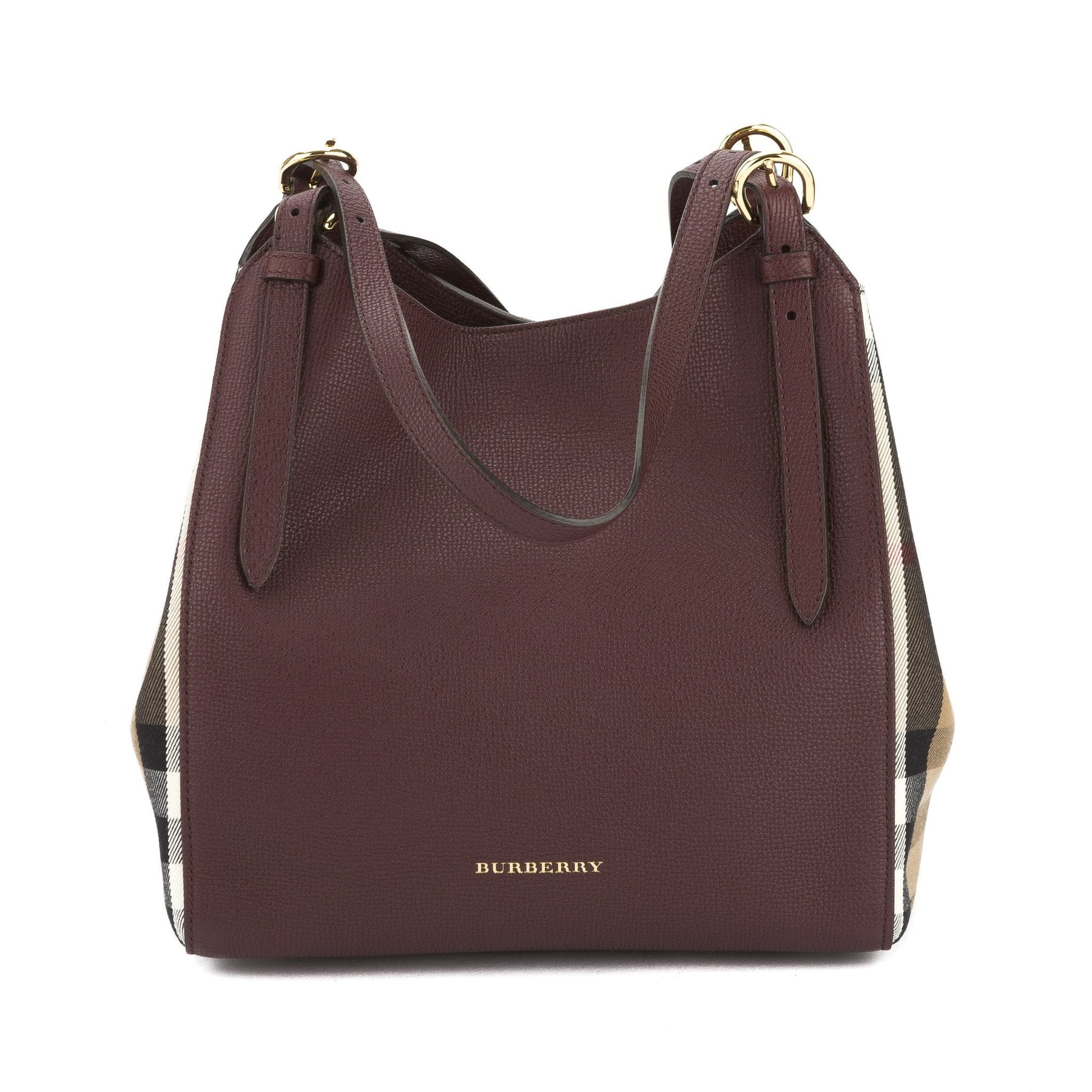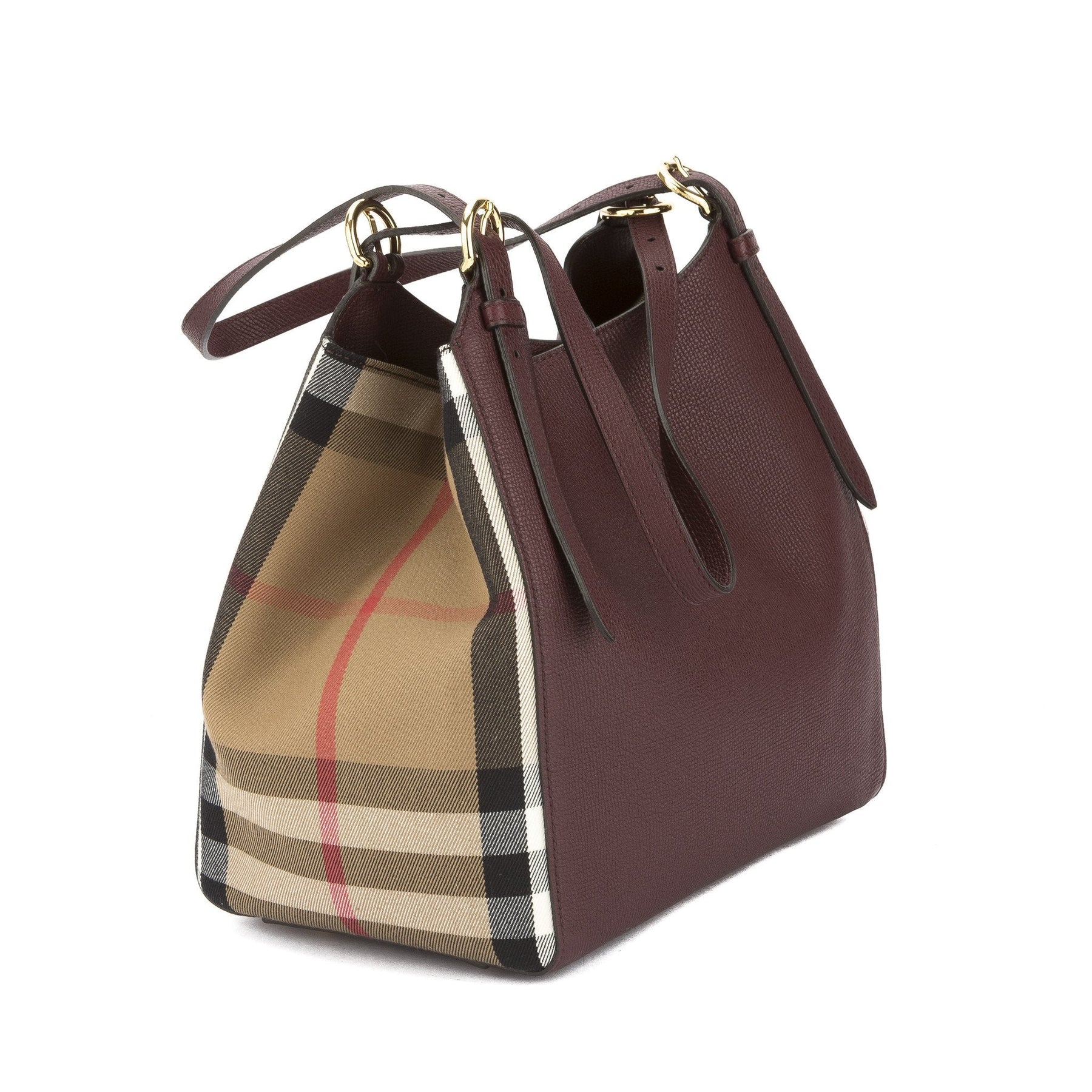 This authentic BURBERRY Mahogany Red Leather and House Check Small Canter Tote Bag is a magnificent. It features a burgundy grainy calf leather canvas with house check sides. It has adjustable buckle shoulder straps, a leather stay fastener to cinch in the sides, gold foil logo on the front, and gold-tone hardware. The interior has a black fabric lining with one zip pocket, one open pocket, and a snap magnetic closure. Made in Italy. This is an elegant handbag for every day from the house of Burberry. This item is new with tags.