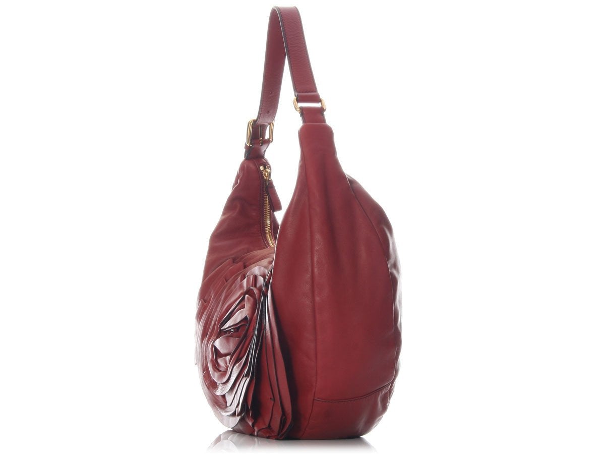 Buttery soft lambskin makes the big layered flower on Valentino's Red Petal Hobo Deluxe! Coming with a dustbag, there is a bit of wear on the gold metal plate on the back. The adjustable strap is shown here with a fifteen inch drop above the zipped top. Inside is a black fabric lining with a slide pocket and a cell phone pocket. Very big and slouchy with amazing leather, a curved bottom and a built in corsage!