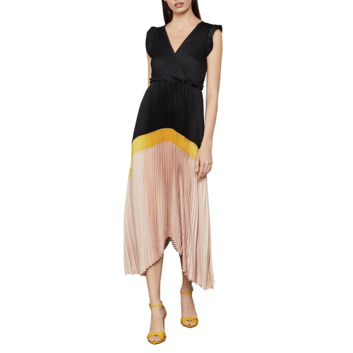Both elegant and understated, this pleated satin dress is designed with colorblocking at the asymmetric skirt, with ruffled sleeves framing the surplice V-neckline.