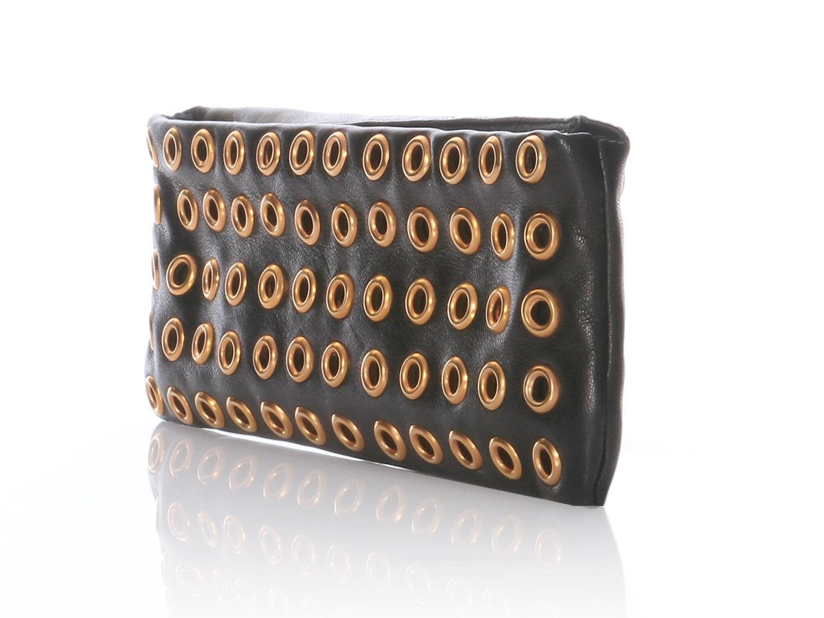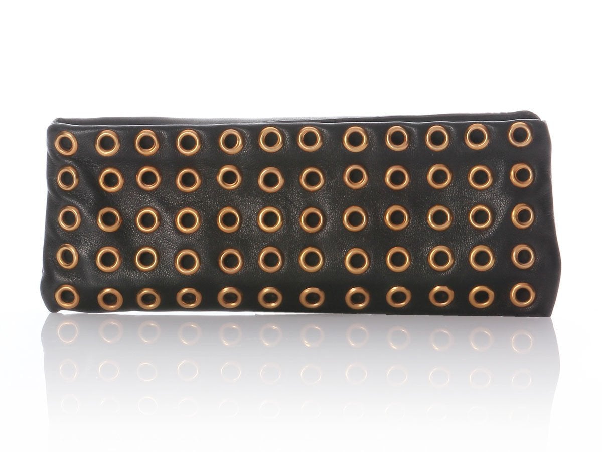 Prada's Slim Black Case with Grommets is made of soft black leather with a gold metal logo on one side, too! With wear on the corners, it opens with a zipper to a black satin lining. Good for pencils, among other things!