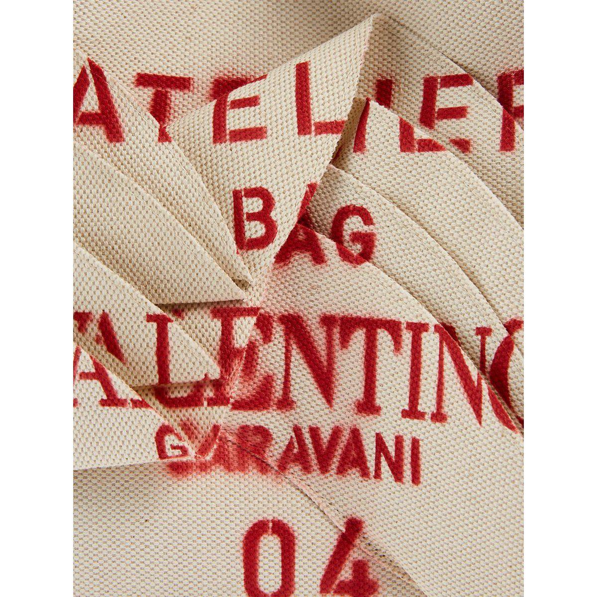 The VALENTINO GARAVANI Atelier Bag 04 Bow Edition canvas tote features a 3D maxi bow printed with "Atelier Bag Valentino Garavani 04". Equipped with a removable, adjustable strap and double top handles, this artfully crafted bag includes a coordinating zippered pouch inside.