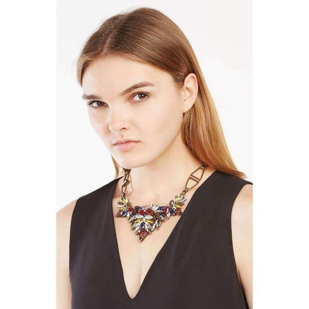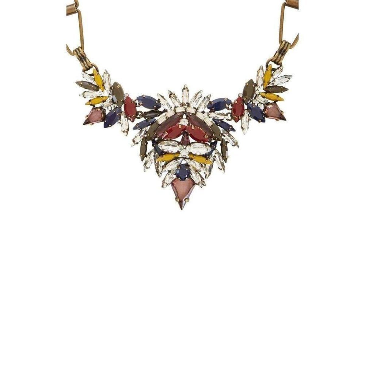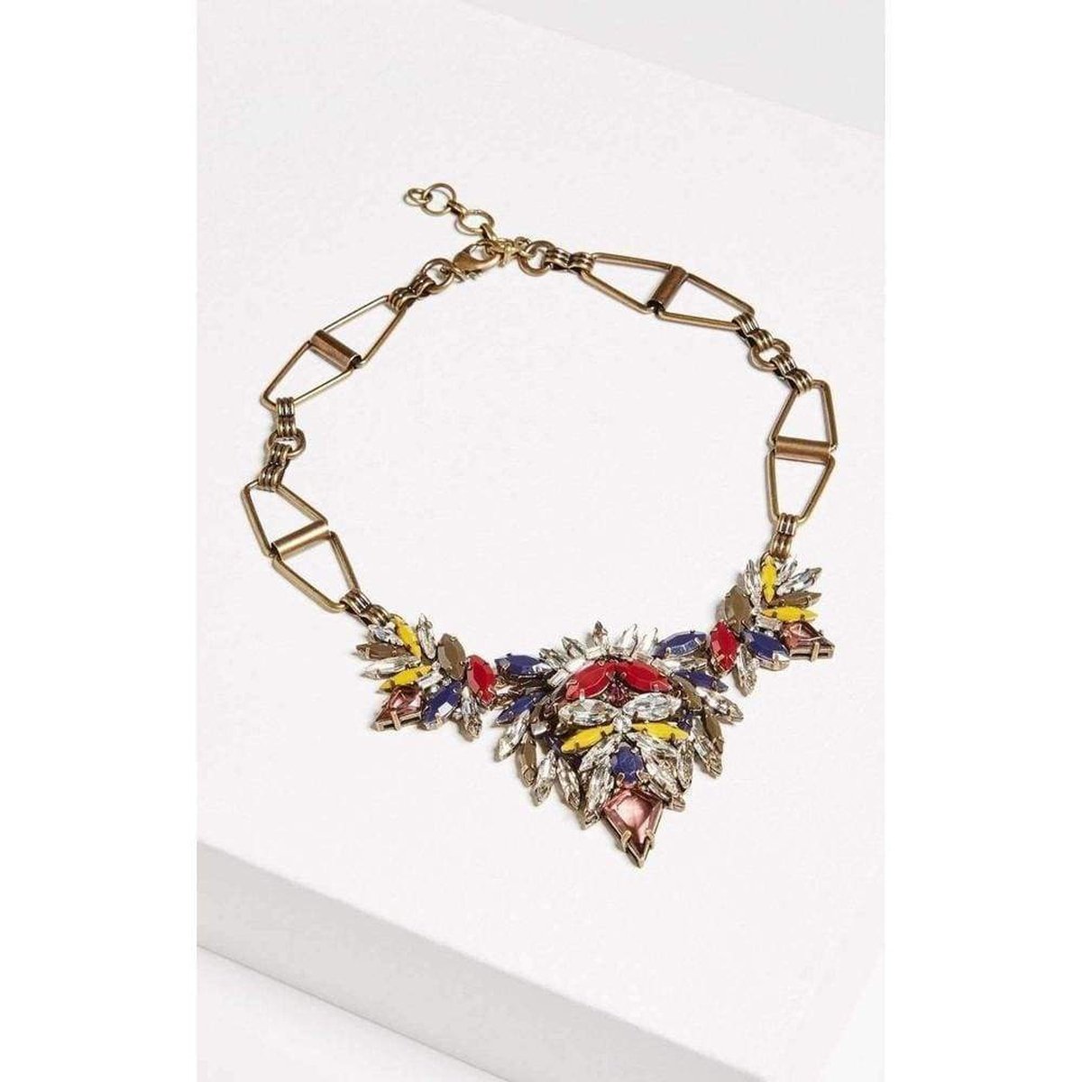 Decorate your decolletage with a statement neckpiece, embellished with light-catching glass stones and finished with a geometric brass chain that's adjustable for your desired fit.