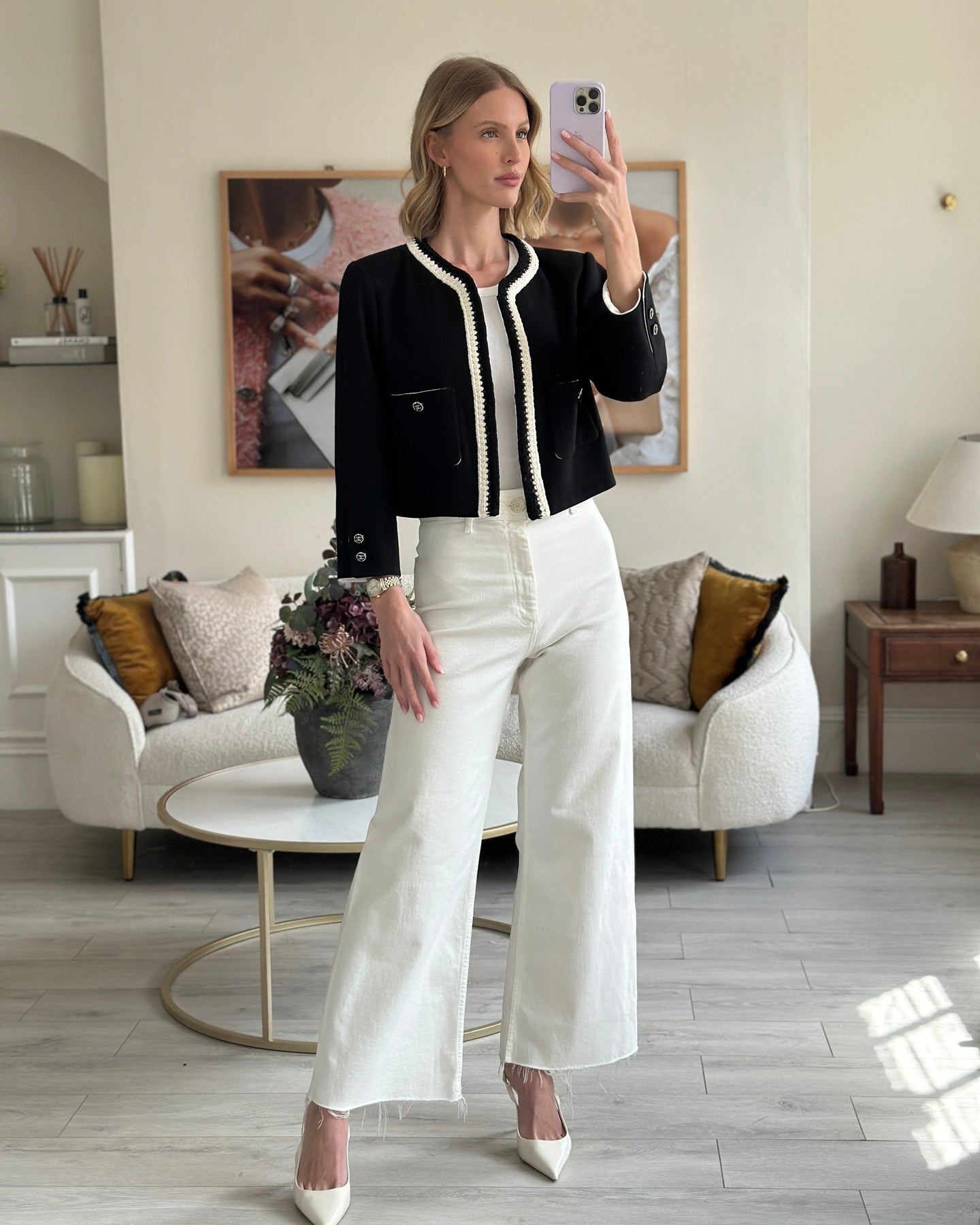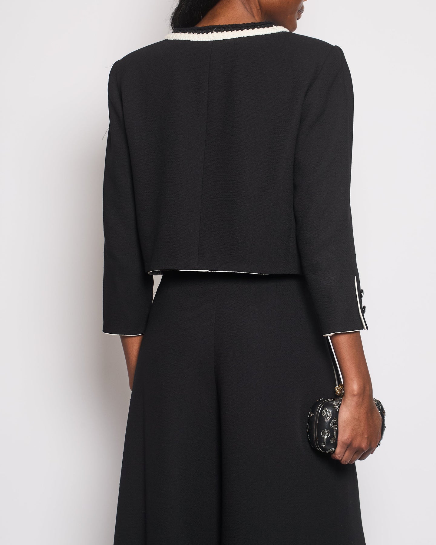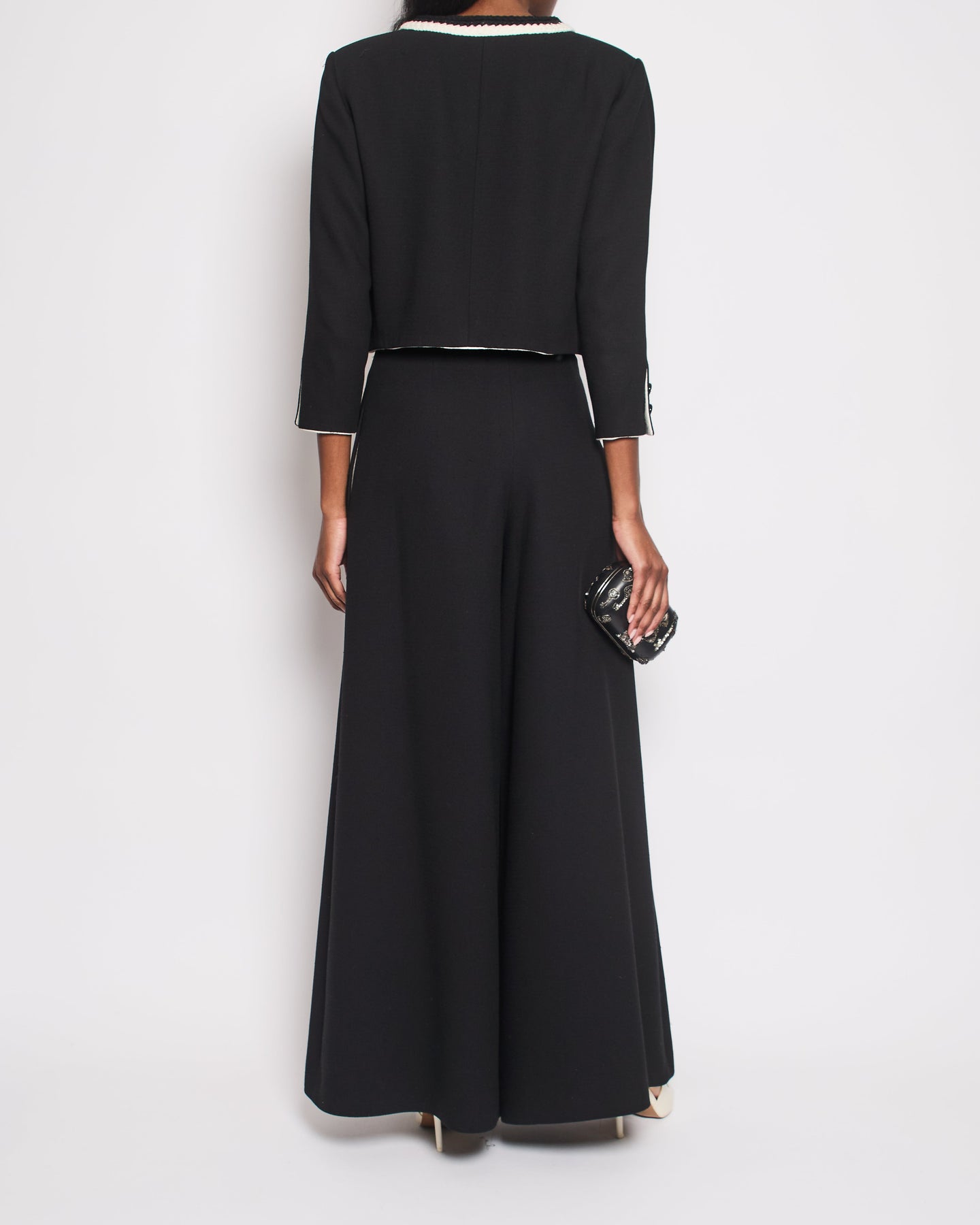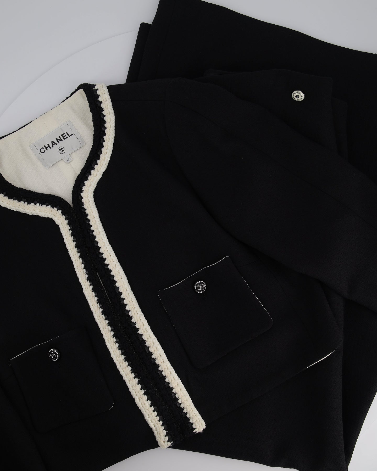 Chanel 22C Black, White Metallic Tweed Trim Silk Jacket and Wide-Leg Trouser Set with Crystal CC Logo Detail Size FR 42-44 (UK 14-16) Jacket RRP £5,420