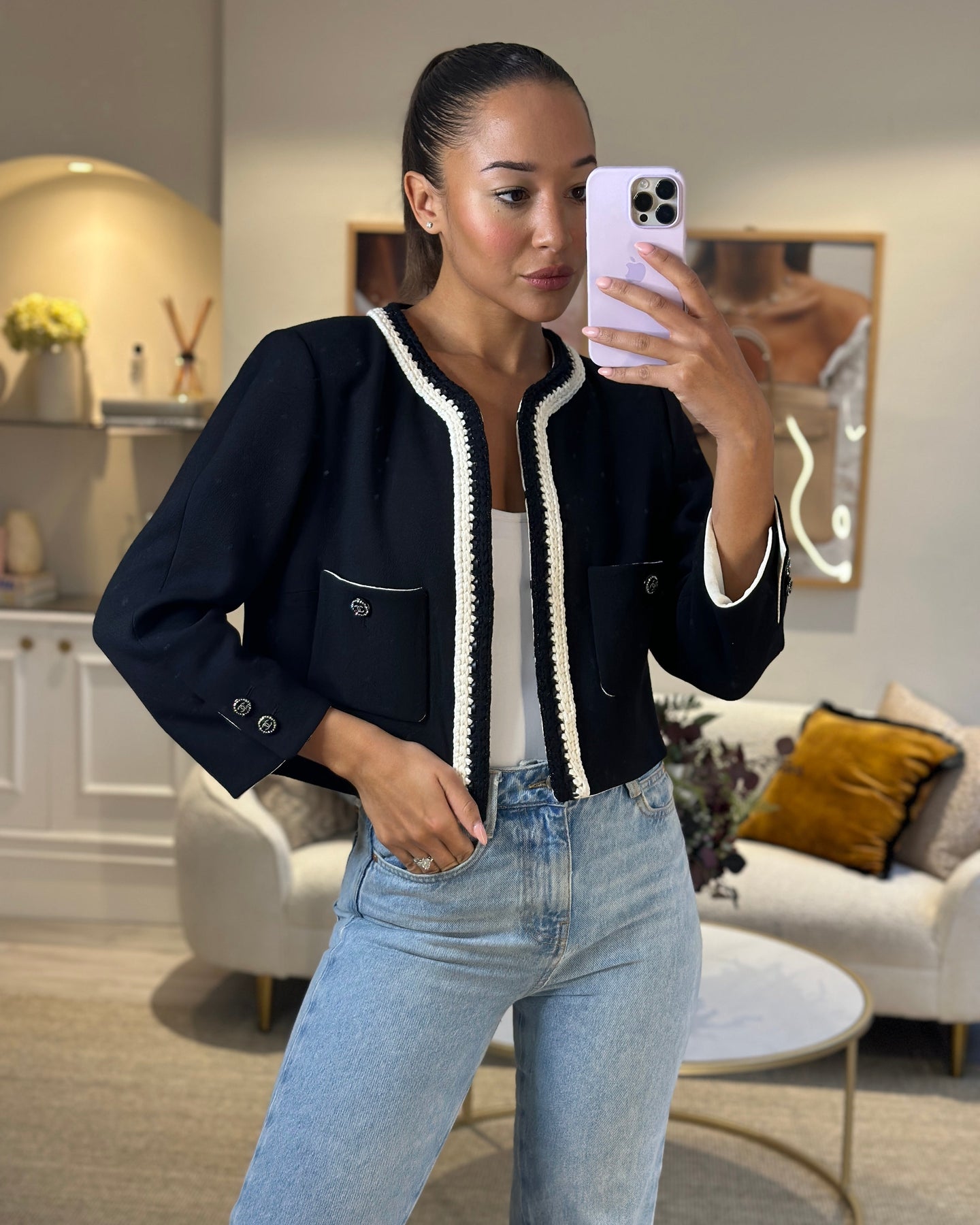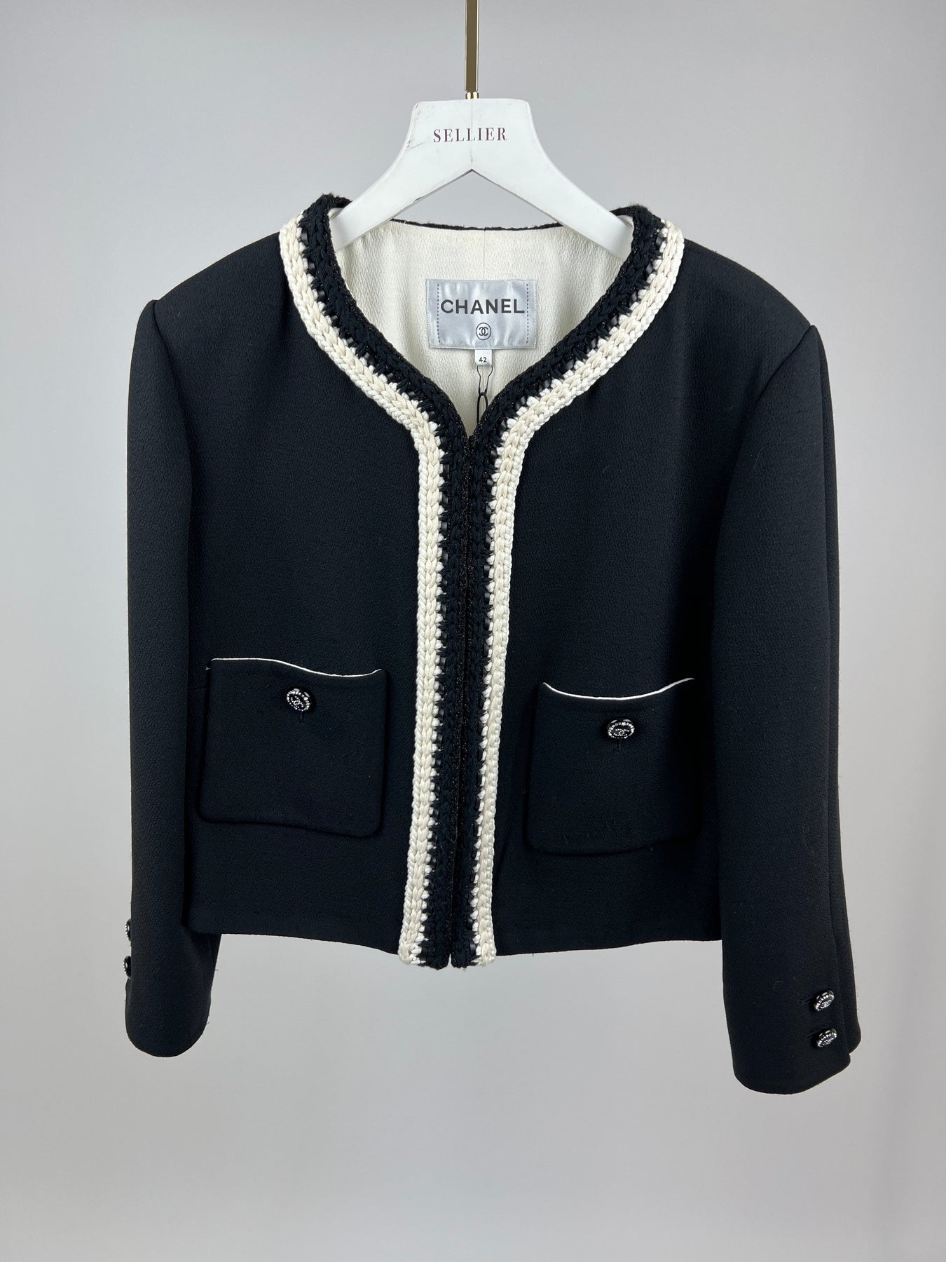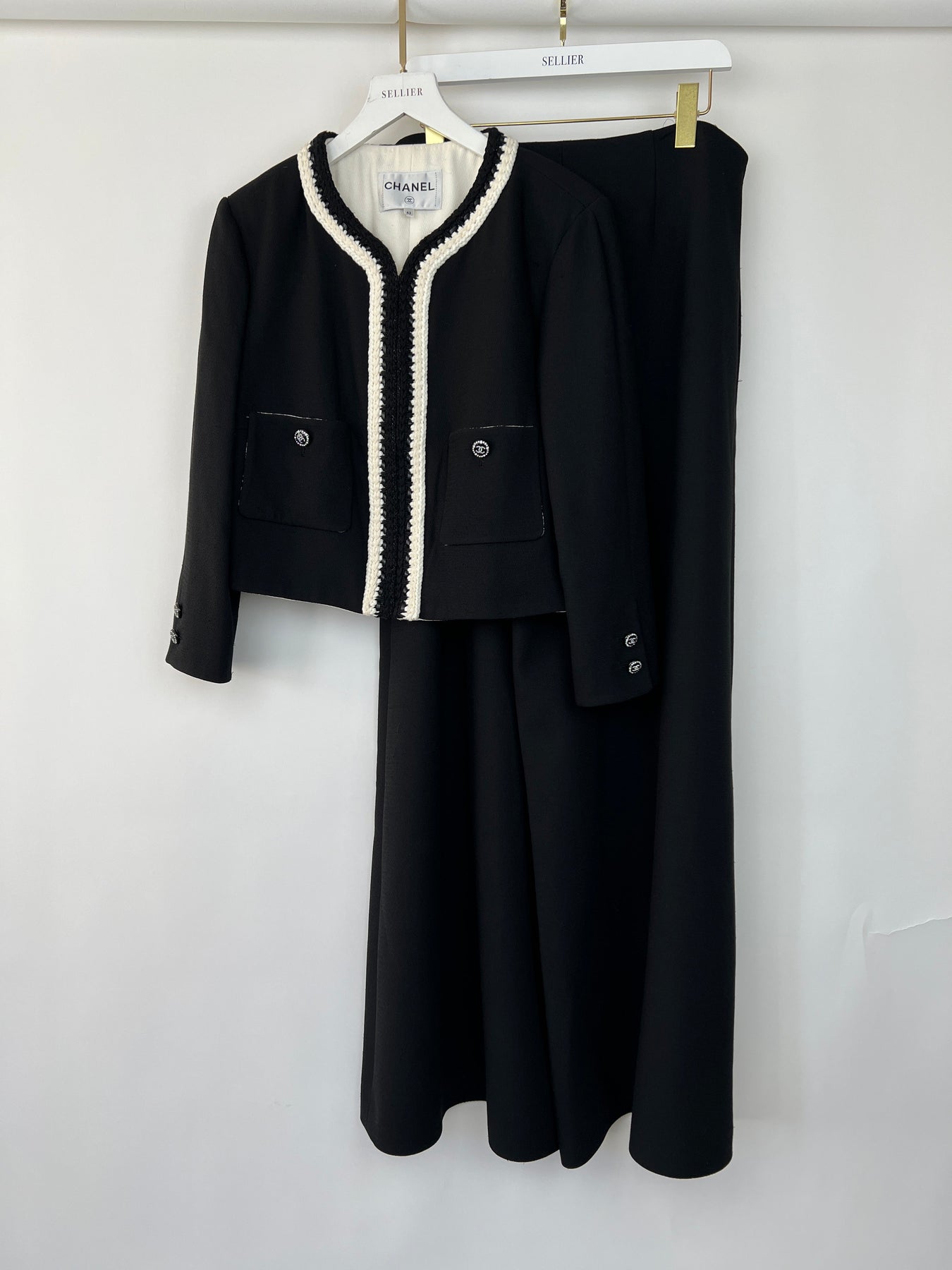 *SUPER HOT* Chanel 22C Black, White Metallic Tweed Trim Silk Jacket and Wide-Leg Trouser Set with Crystal CC Logo Detail Size FR 42-44 (UK 14-16) Jacket RRP £5,420