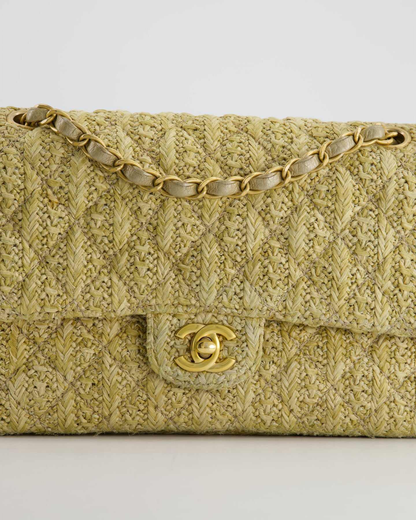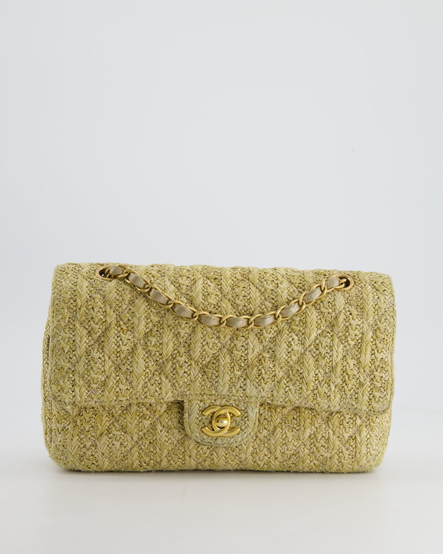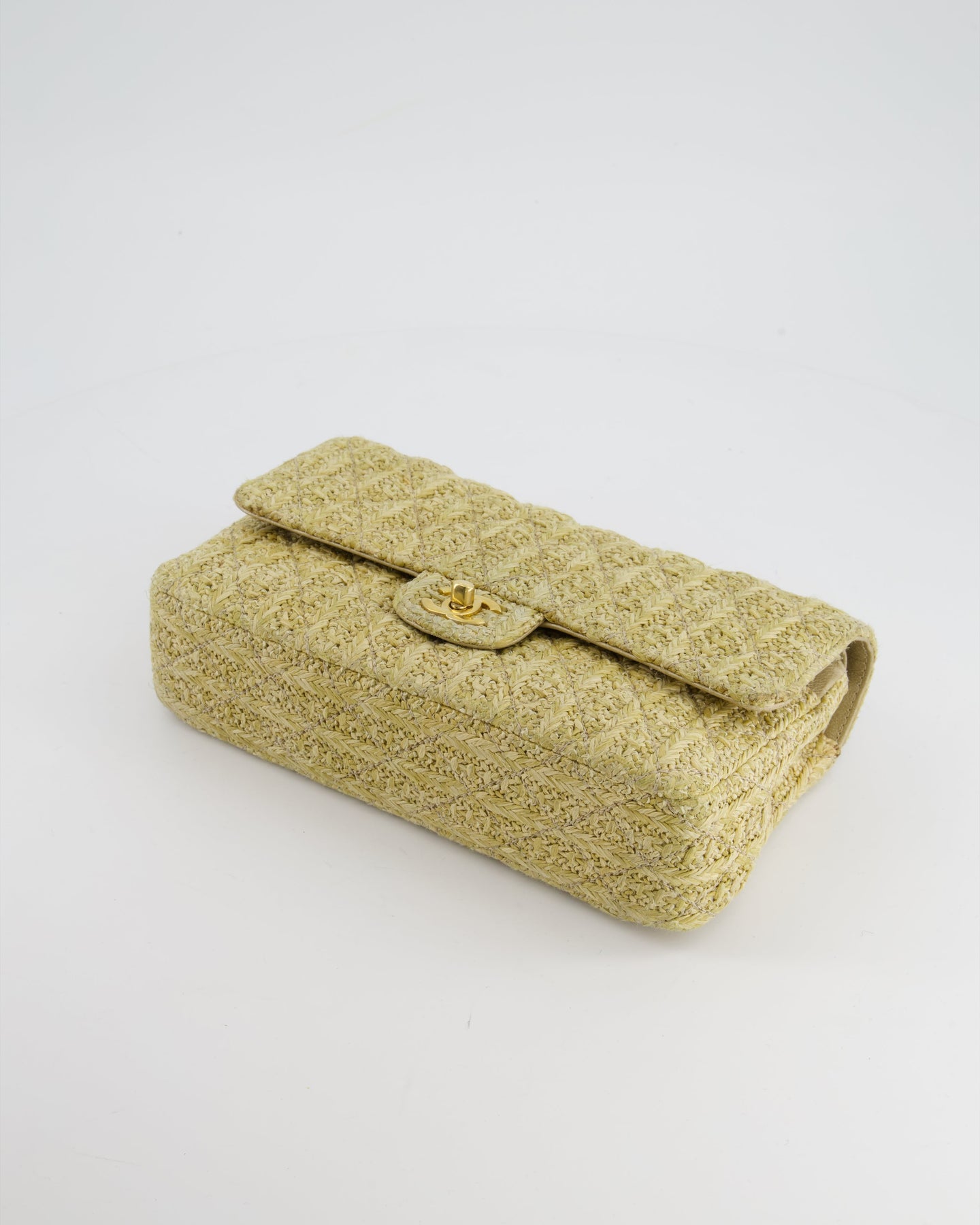 *SUPER HOT* Chanel Beige Raffia Medium Classic Double Flap Bag with Brushed Gold Hardware and Gold Leather Interior