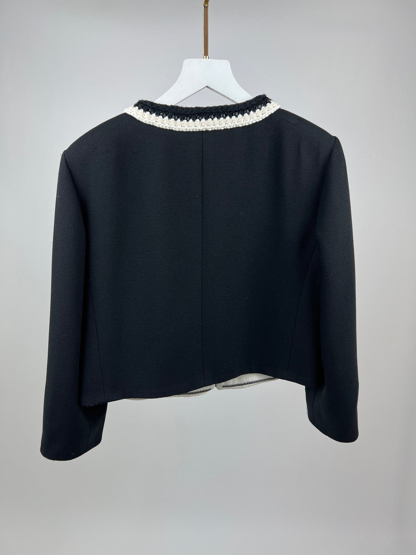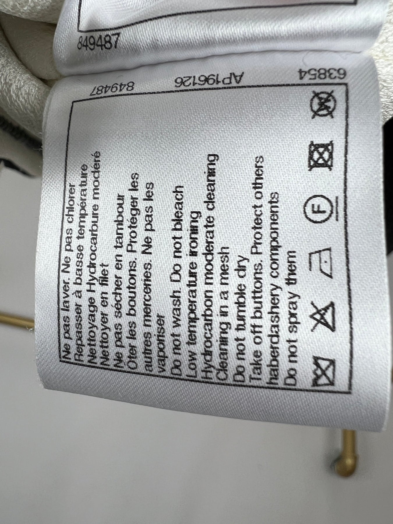 - Jacket fastens with a hook and eye at the front of the garment.