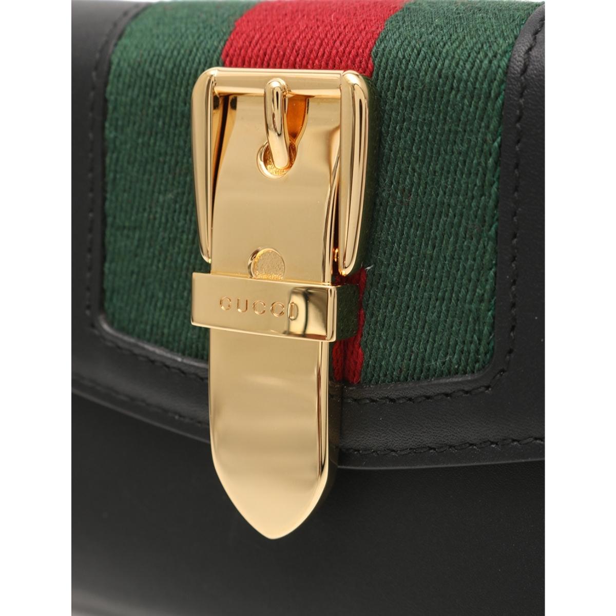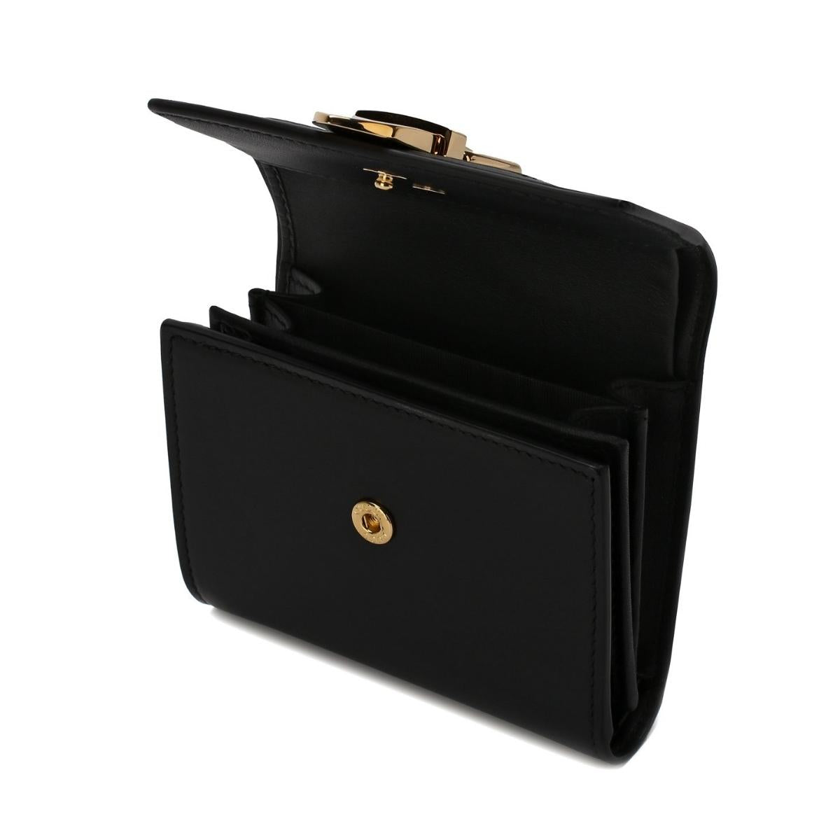 The Sylvie wallet in a small size and flap top. The metal buckle closure was taken from the House’s archives, and is mixed playfully with the Web stripe. Made in a smooth, classic leather. This stylish wallet is crafted of soft calfskin leather in black and features a dark green and red web nylon down the center of the flap with a gold faux buckle on the front. The flap opens to a black leather interior with one bill compartment, and card slots.