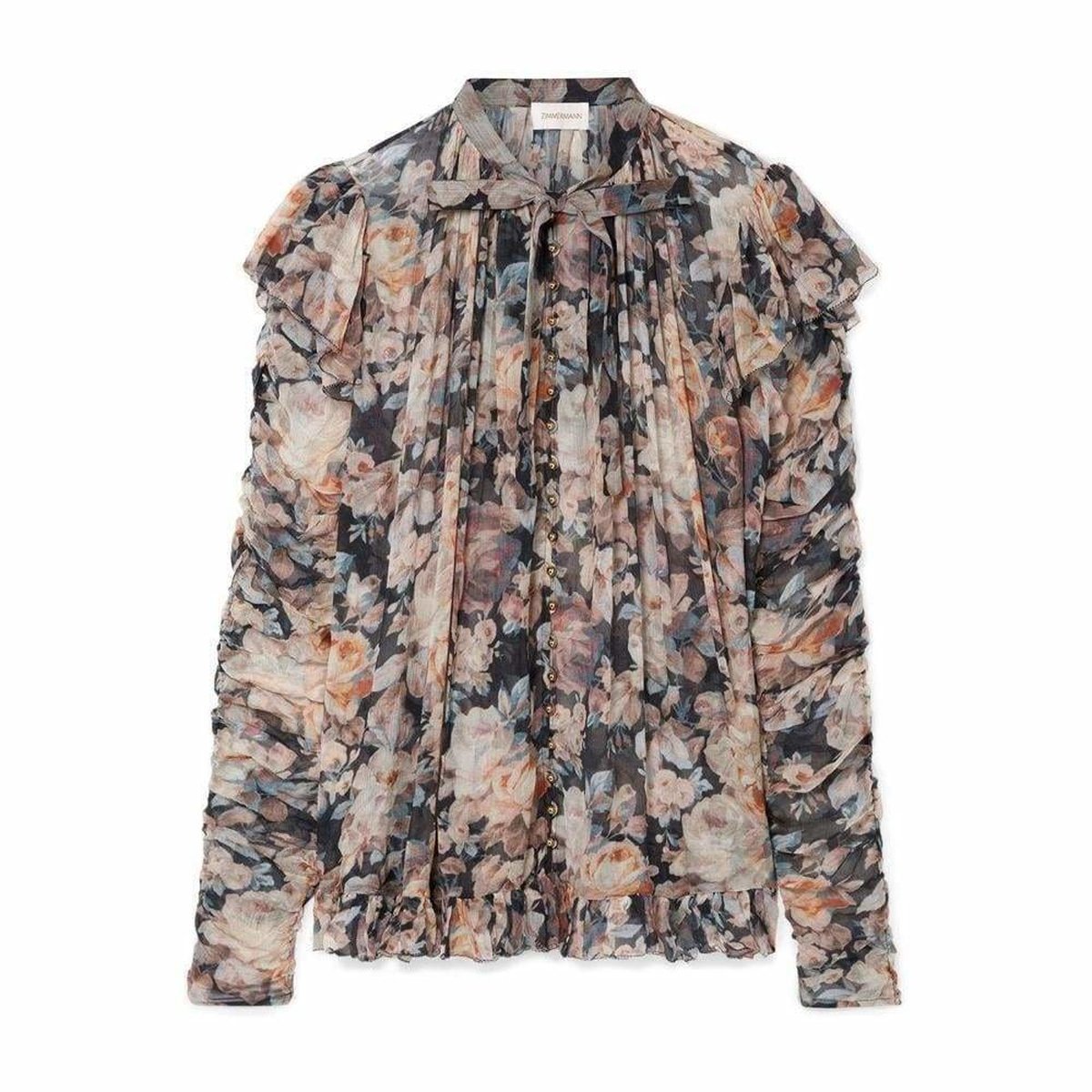 Made from diaphanous silk-georgette, it's outlined by wispy picot-trimmed ruffles and has sweeping neck ties.