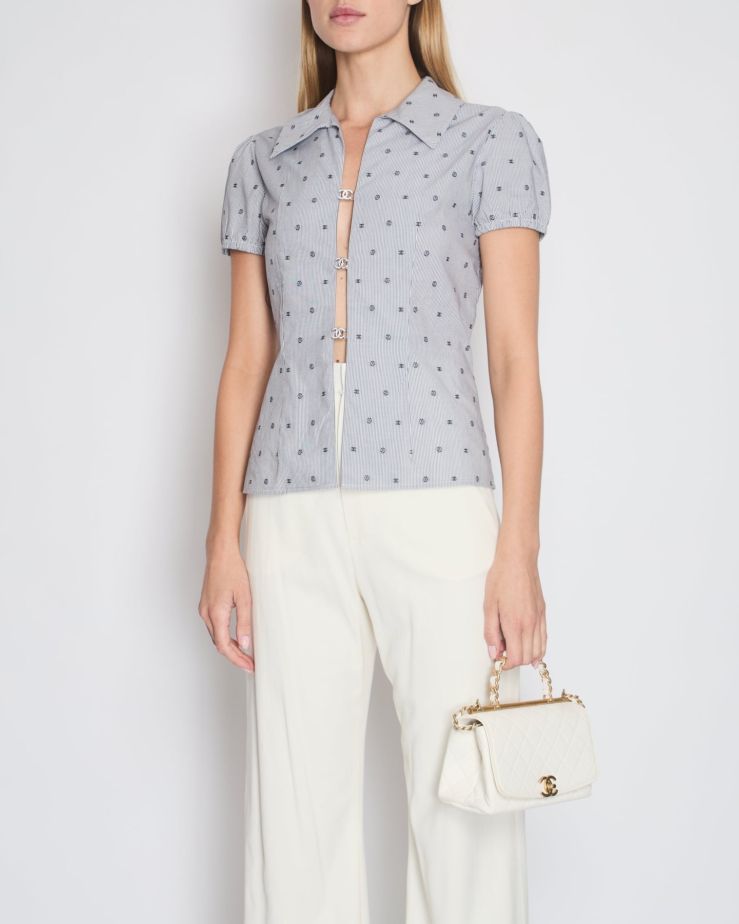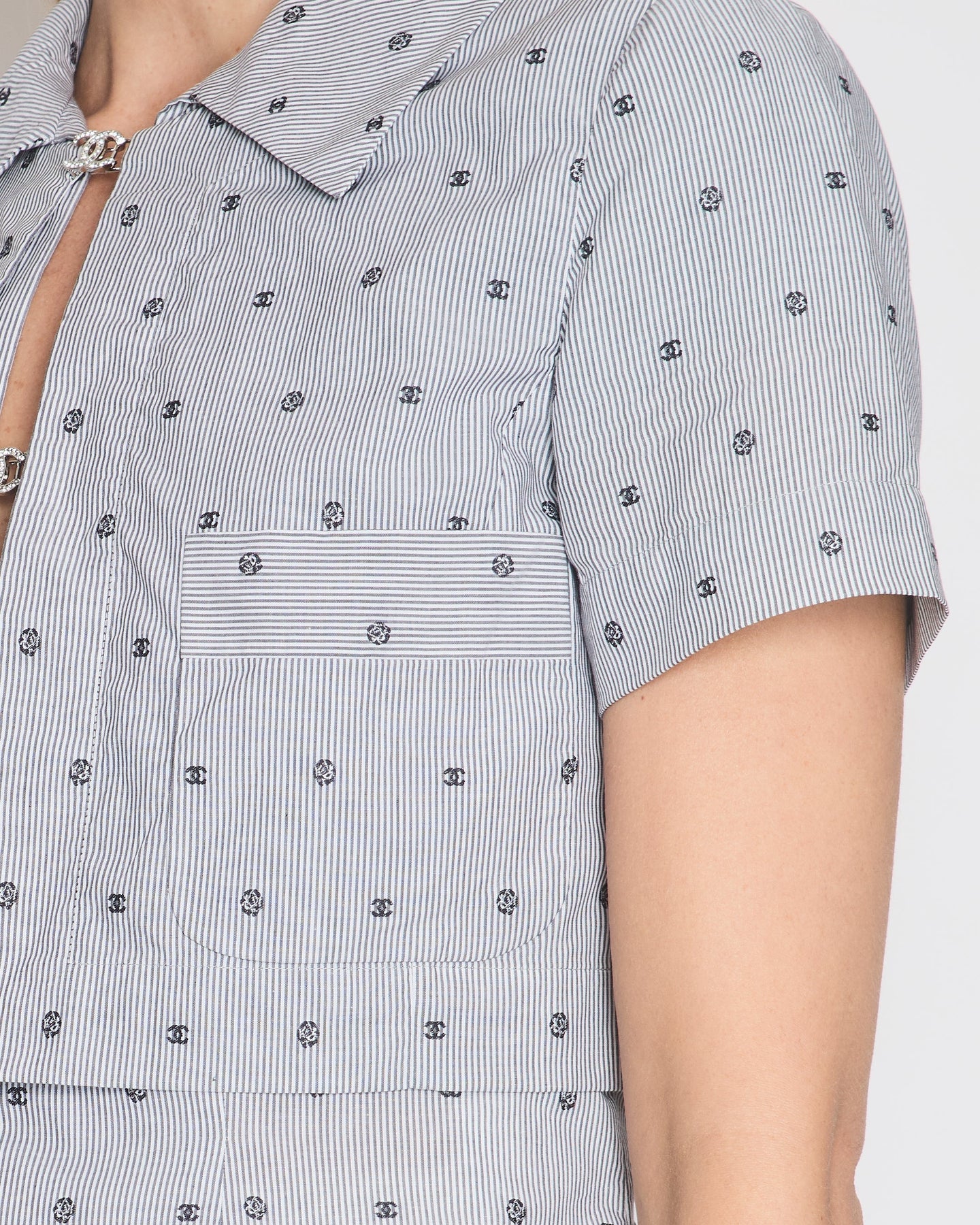 *HOT* Top Quality Chanel Spring/Summer 2024 Grey & White 2 Piece Striped Shirts Set with Camelia Print Details and Crystal CC Hooks. Cropped Shirt Size FR 36 (UK 8) Long Shirt Size FR 38 (UK 10)