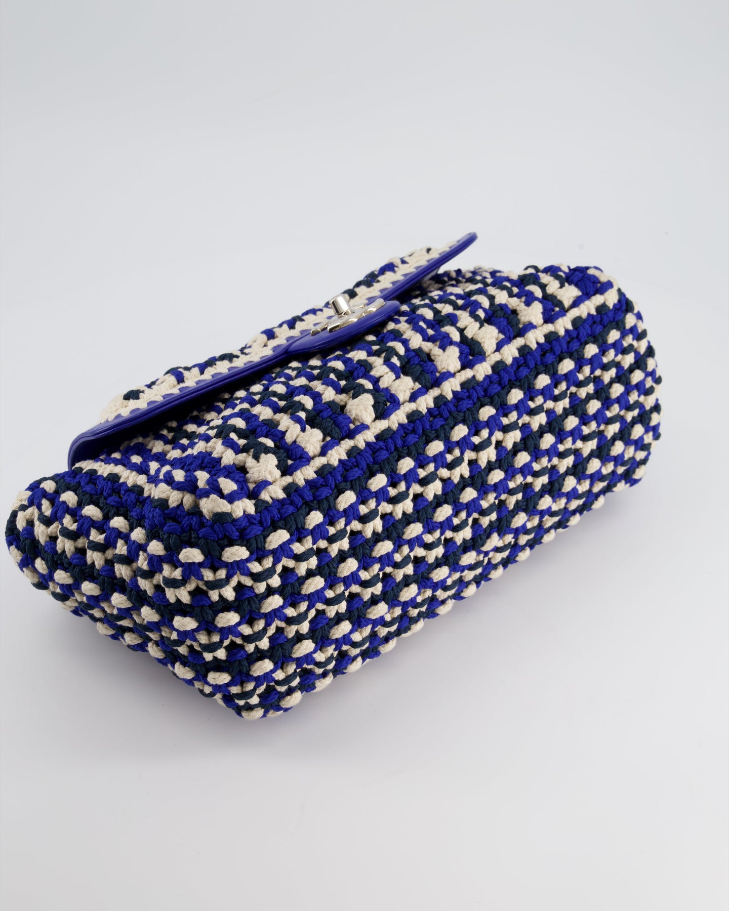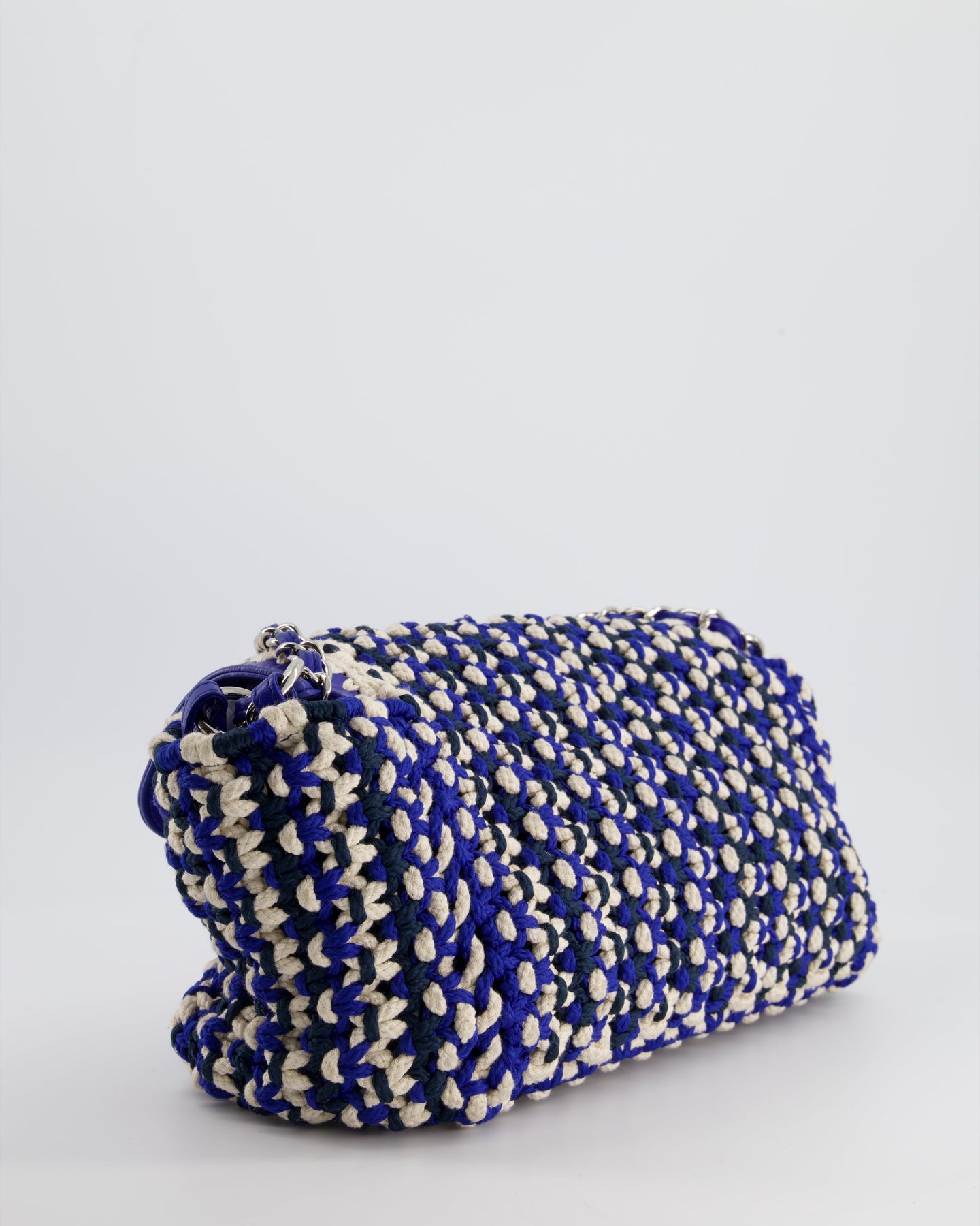 Chanel Navy, Blue and Cream Crochet Flap Bag with Silver Hardware